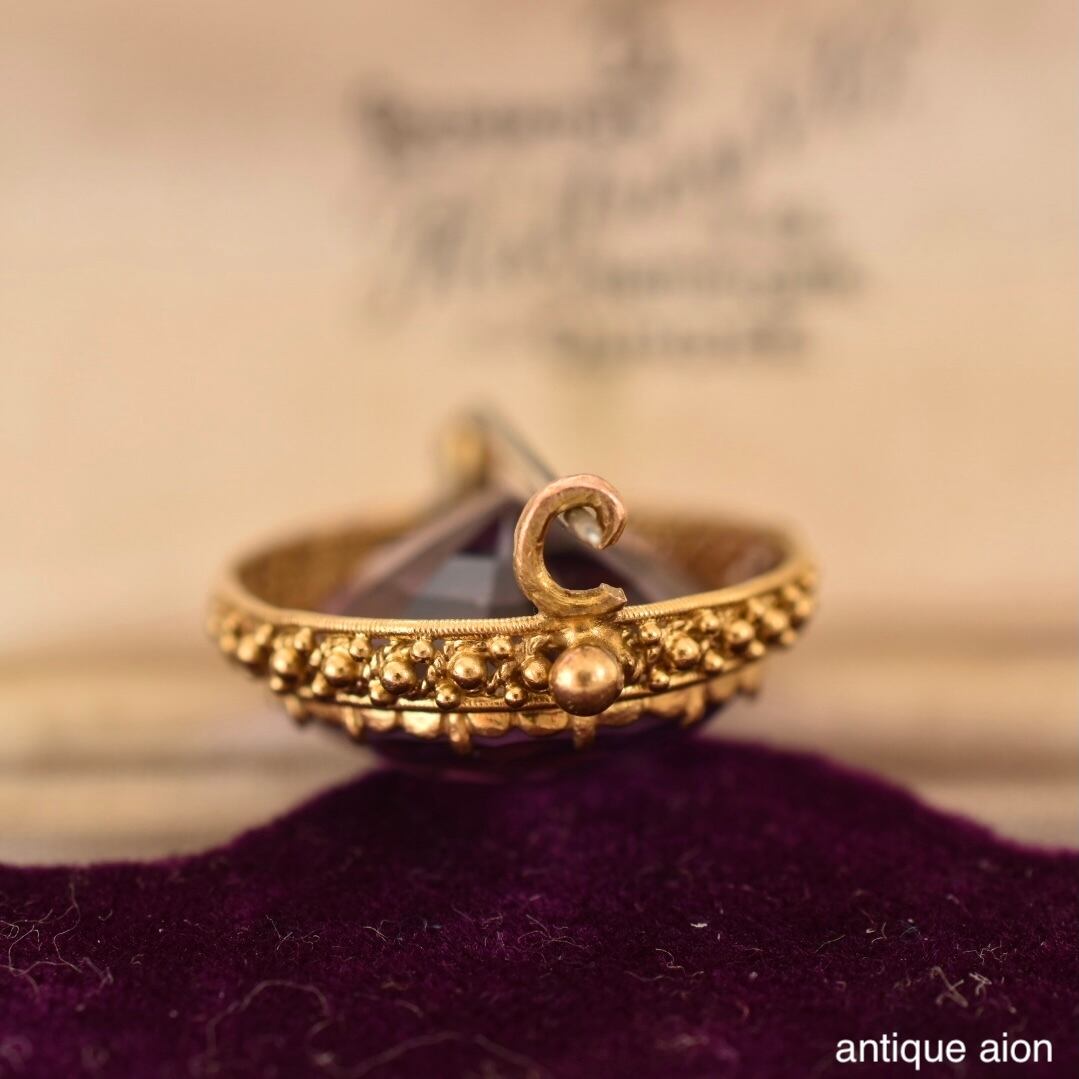 特に、ゴールドの粒飾り(グラニュレーション)は、エトラスカン・リバイバルスタイルが流行したヴィクトリアン期のデザインに見られる意匠で、当時の高度な職人技術を物語っています。