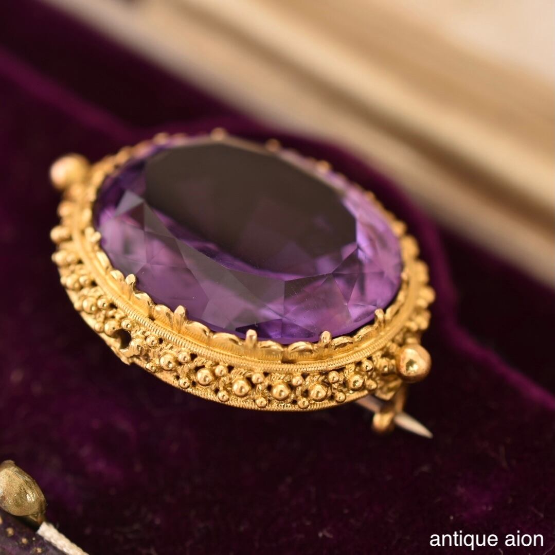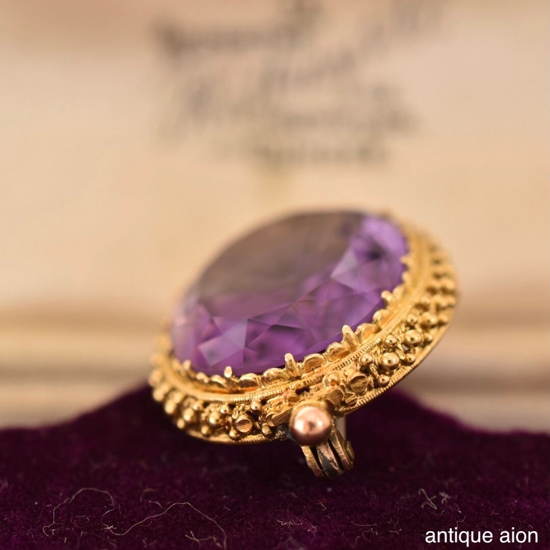 英国アンティーク 1890年代~1910年代 18ctゴールド 天然アメジスト カンティーユ装飾のオーバルブローチ