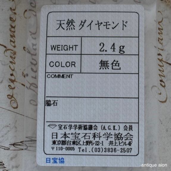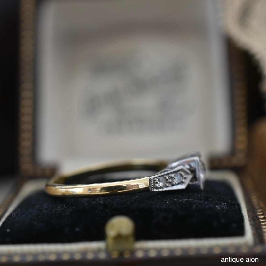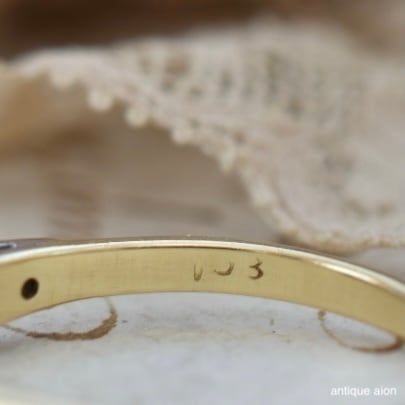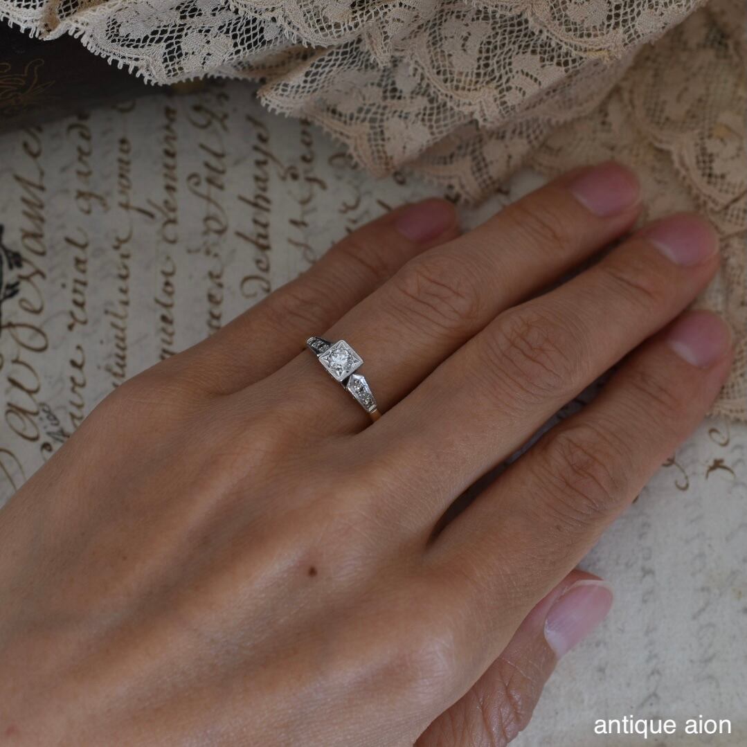 石座はプラチナ製で、イエローゴールドとのコントラストが美しく、アンティークならではの洗練された雰囲気を醸し出します。