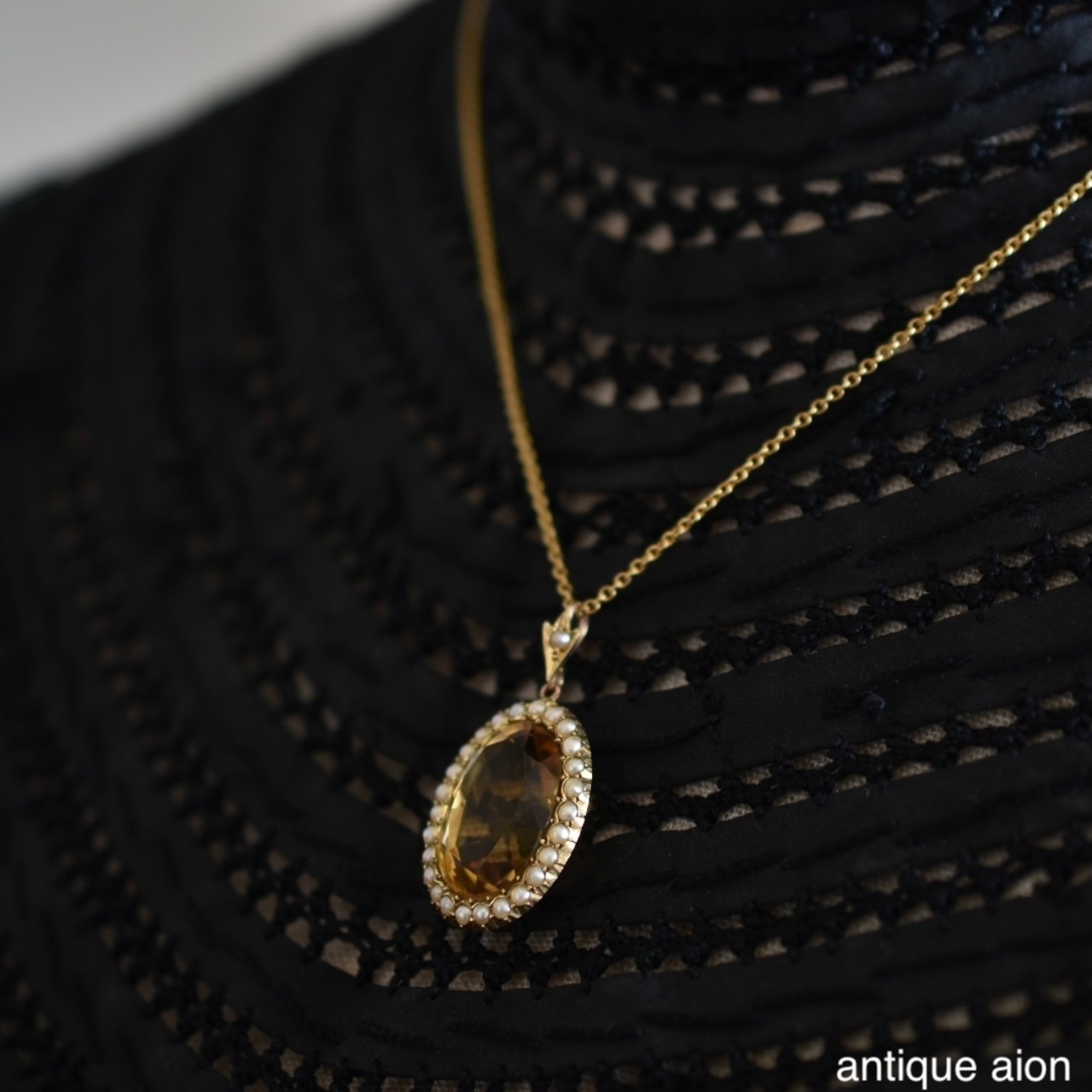 大粒の天然シトリンをオーバルカットに仕立て、その周囲をシードパールがぐるりと取り巻く気品あふれるデザイン。