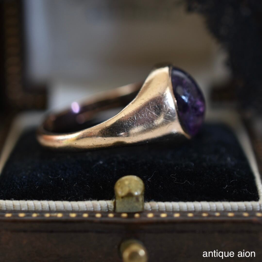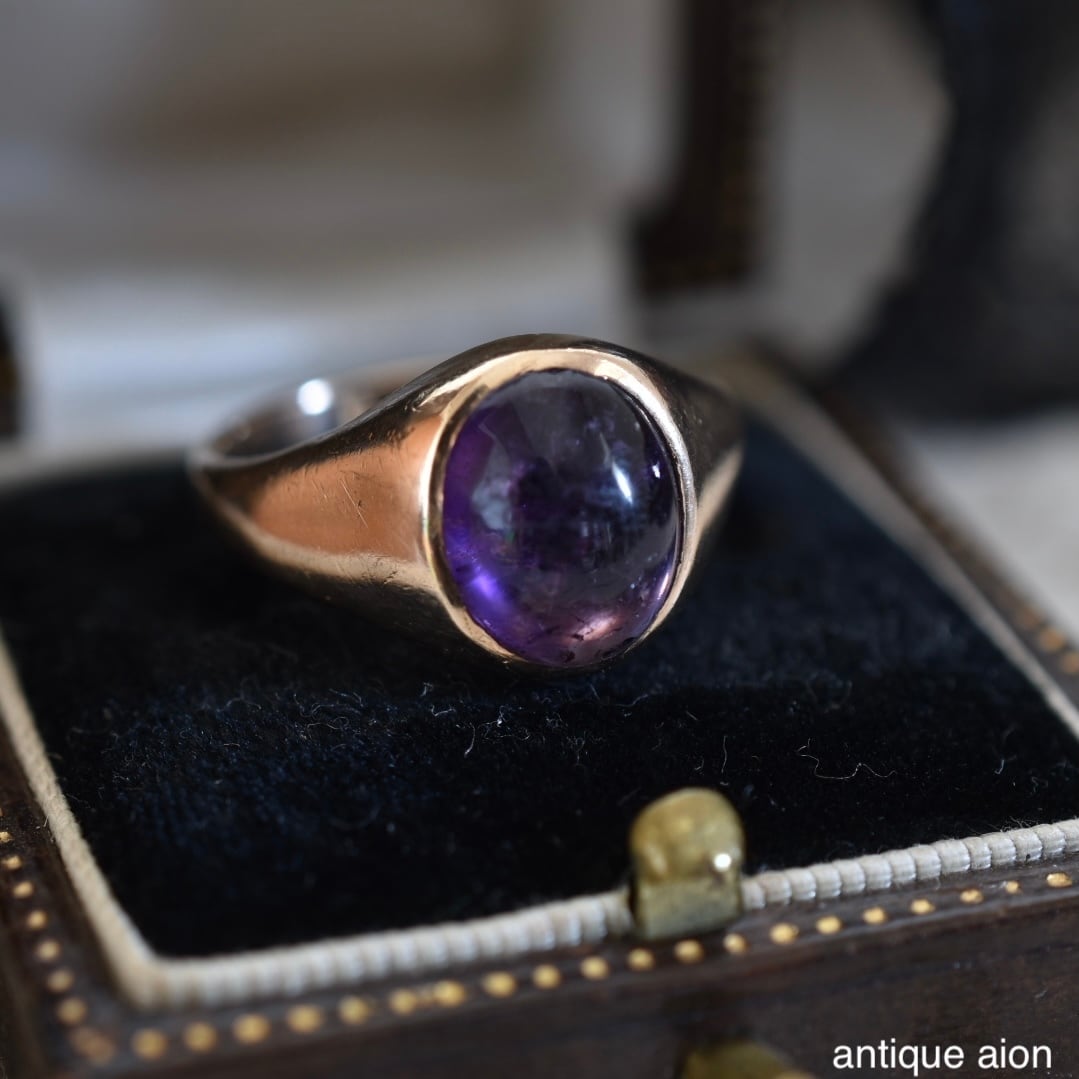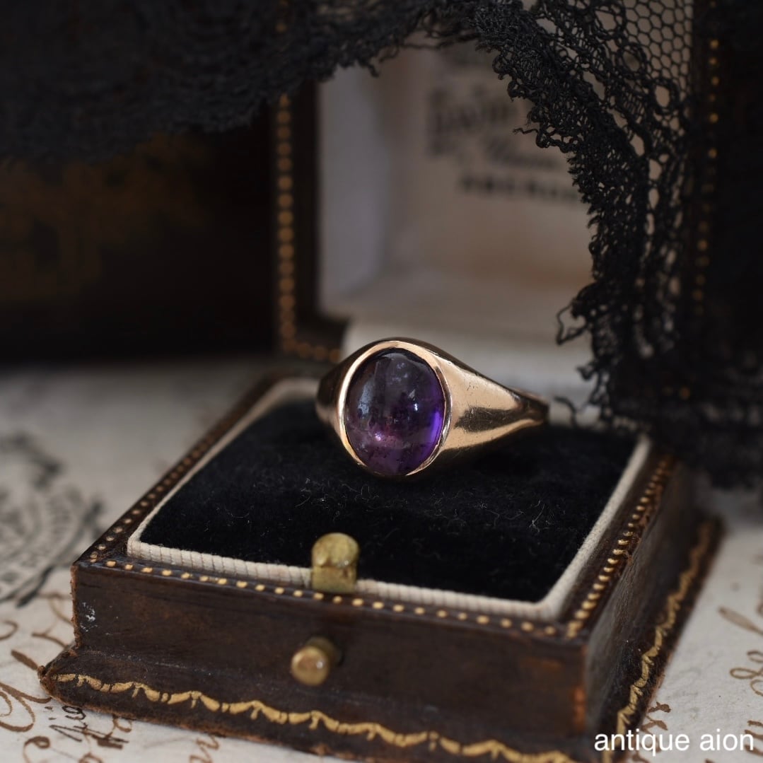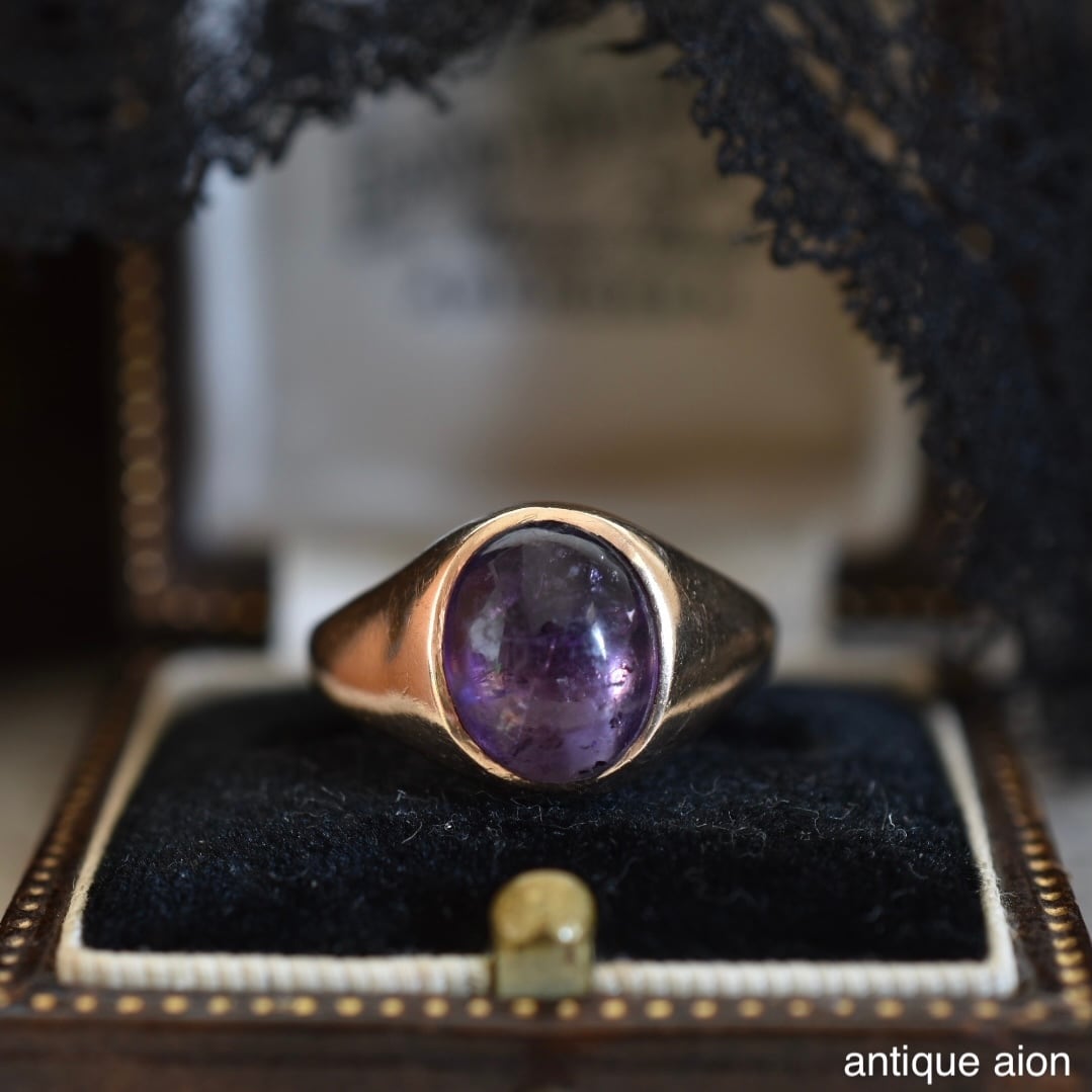 そのクラシカルな造形の中央に、艶やかな カボションカットのアメジストが嵌め込まれており、力強さと柔らかな輝きが見事に調和しています。