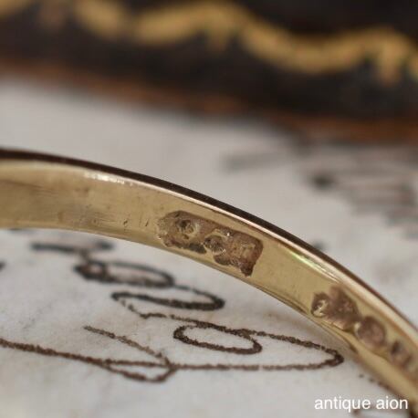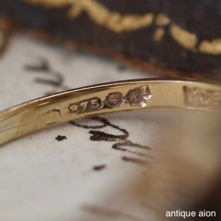 リングの内側には、メーカーズマーク「S&K」、9金を示す「375」、ロンドンのアッセイオフィスマーク(レオパードヘッド)、そして1975年を示すデートレター「A」が確認できます。さらに、他にも判読しづらいアルファベット刻印があり、これは当時の再ホールマークや打ち直しによるものと考えられます。