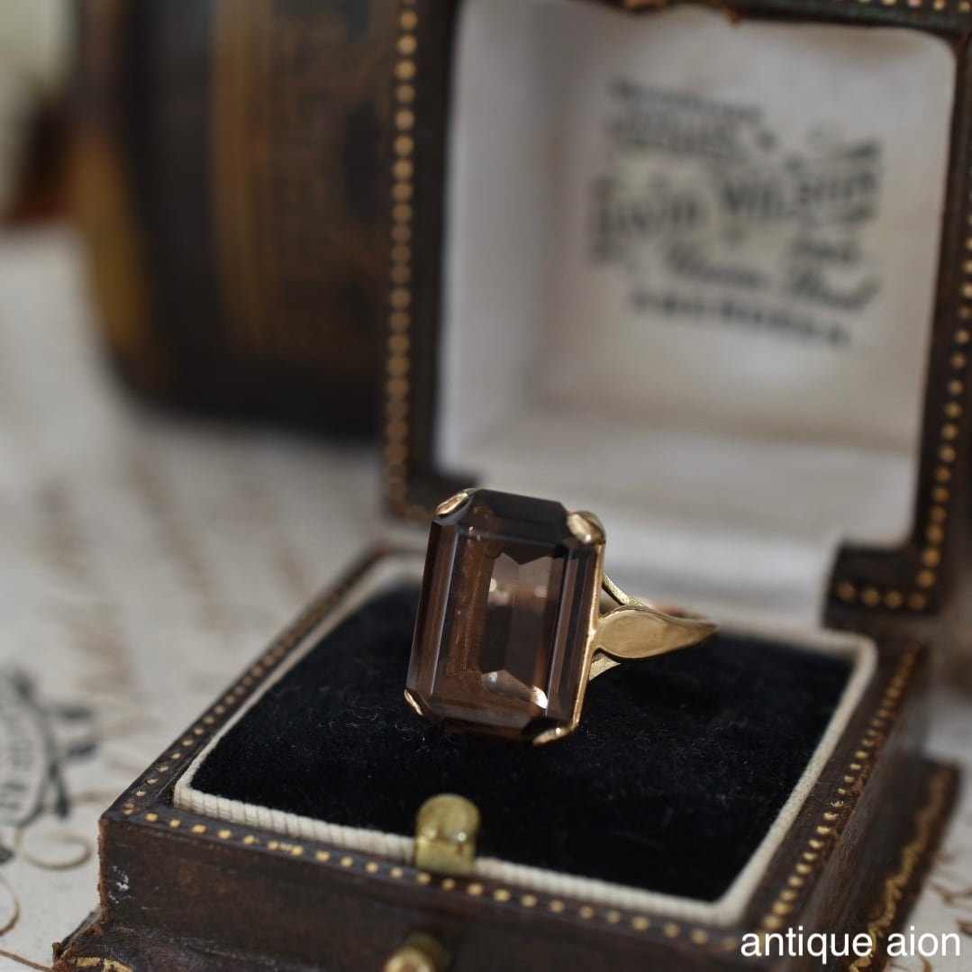 スクエアシェイプのスモーキークォーツ(約1.4cm × 1.0cm)は、深みのあるブラウンが透明感とともに指先を彩り、落ち着いた華やかさを放ちます。シンプルな4本爪で留められた宝石を支えるシャンクには流れるようなリーフ調のデザインが施され、気品と優雅さを兼ね備えた仕立てとなっています。