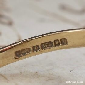リングの内側には「HOG」のメーカーズマーク、王冠+375の9金マーク、ロンドンアッセイオフィスのホールマーク、そしてデートレター「R(1991年)」が鮮明に残り、確かな来歴を物語っています。