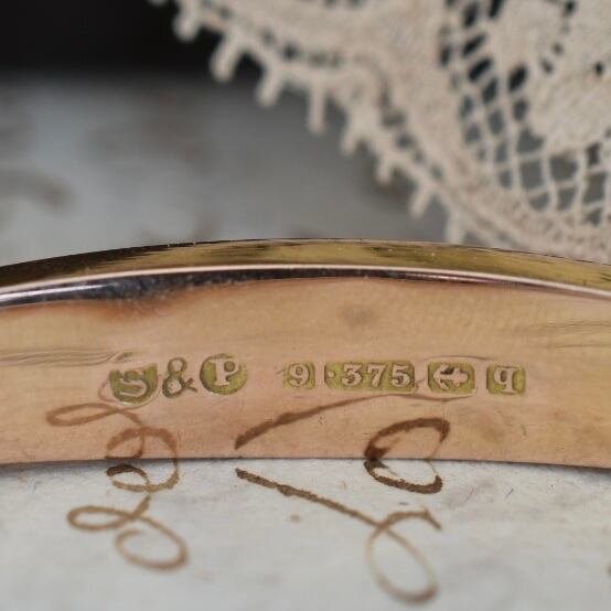 内側には、メーカーズマーク「S&P」、9金の品位の「9.375」、バーミンガムのアッセイマーク、1915年を示すデートレター「q」が鮮明に刻まれており、その由緒を確かに物語っています。