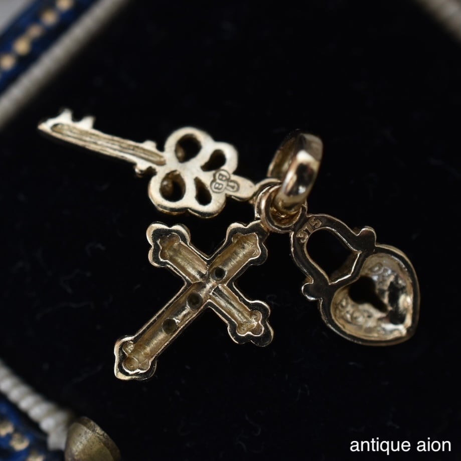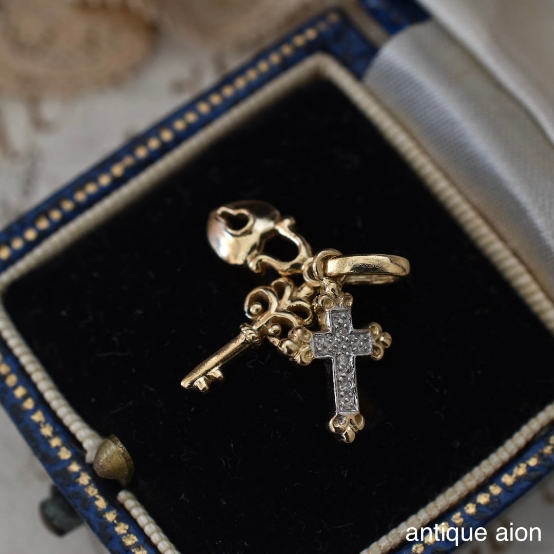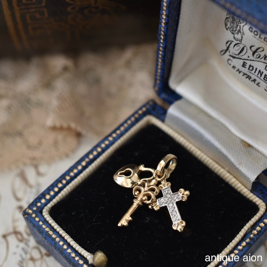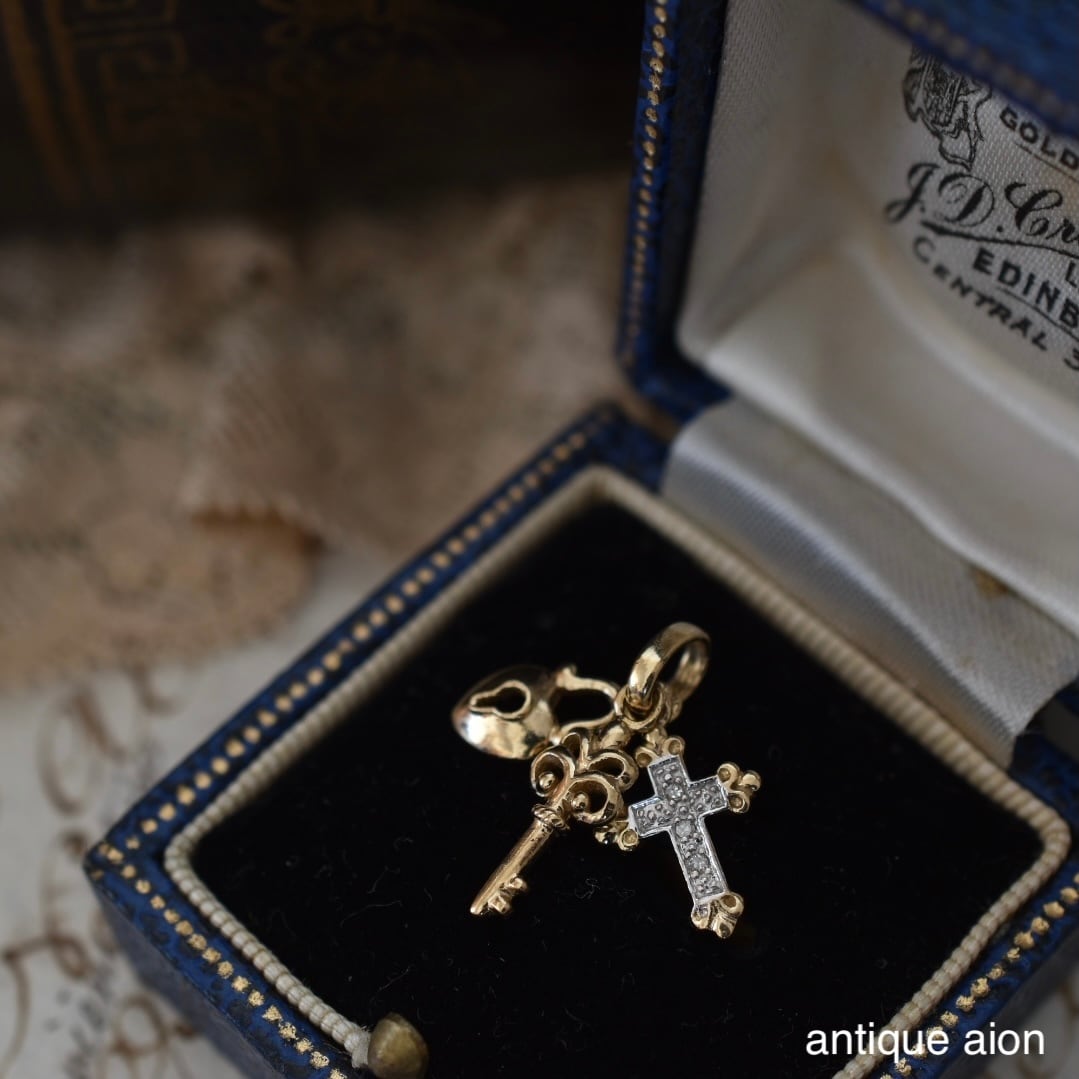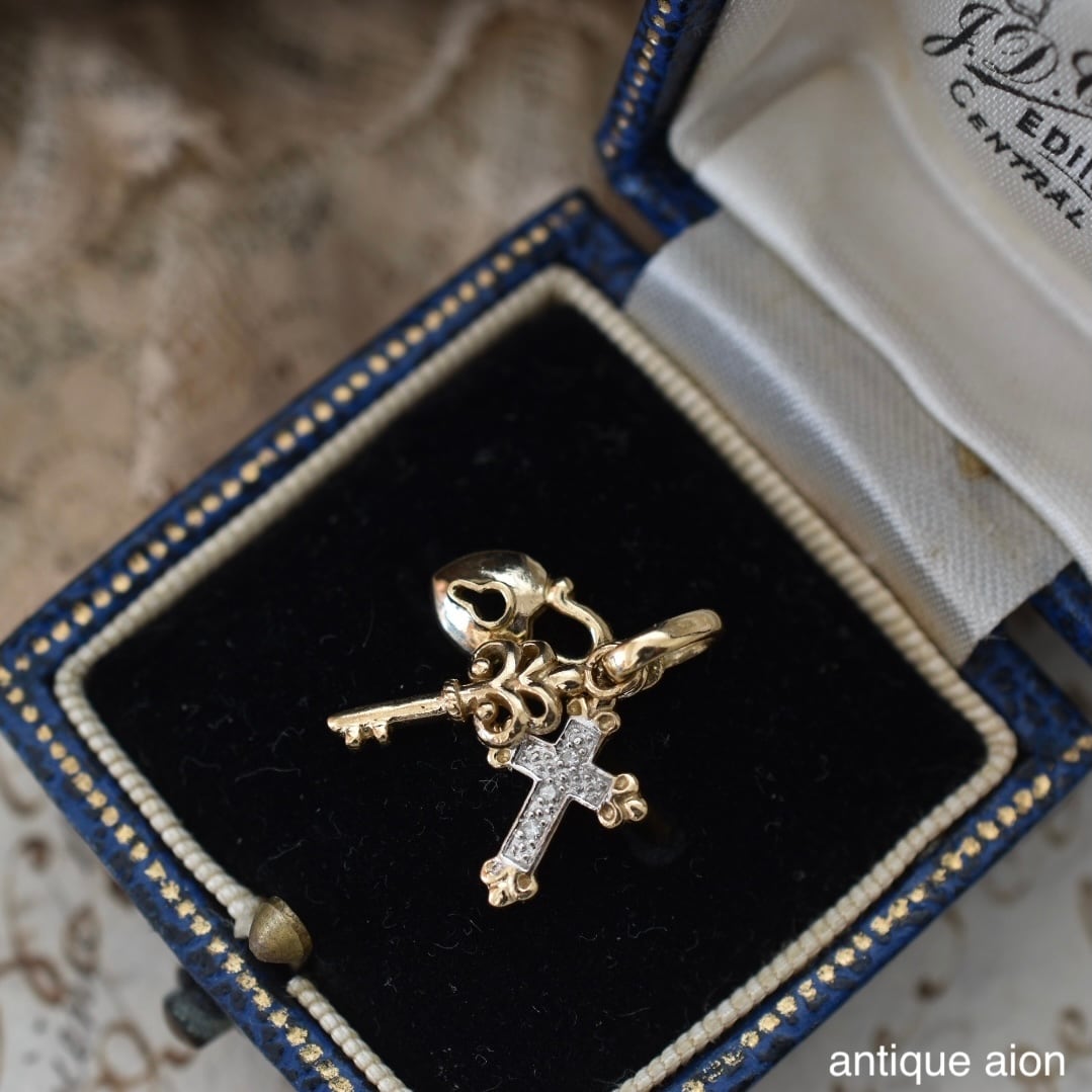 小さな物語がひとつの輪に結ばれたような、鍵、鍵穴、そしてクロスの3つのチャーム。