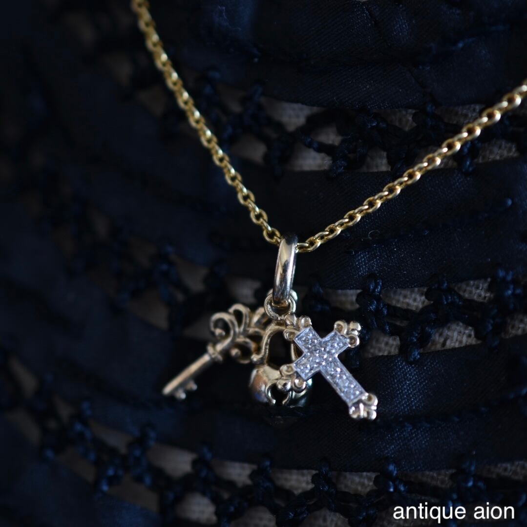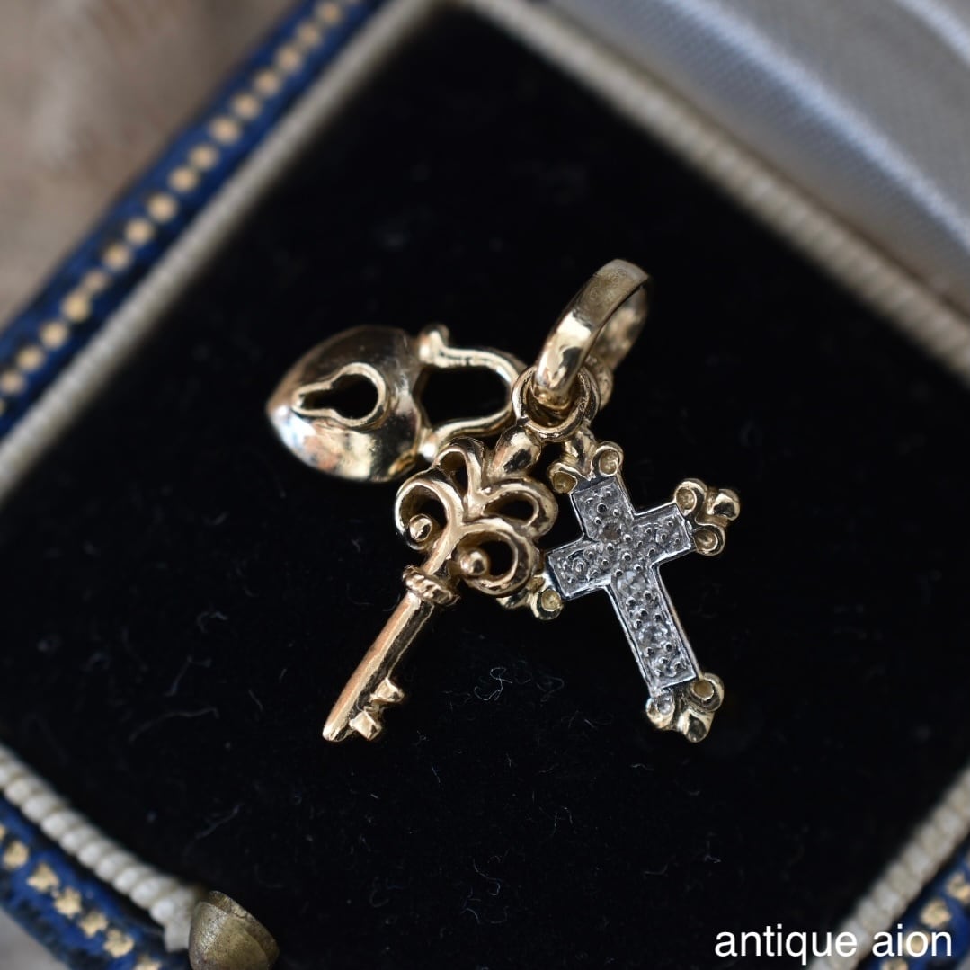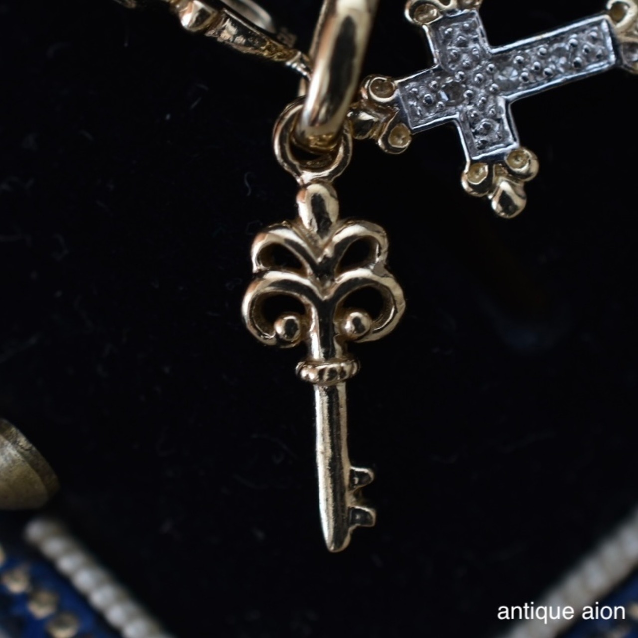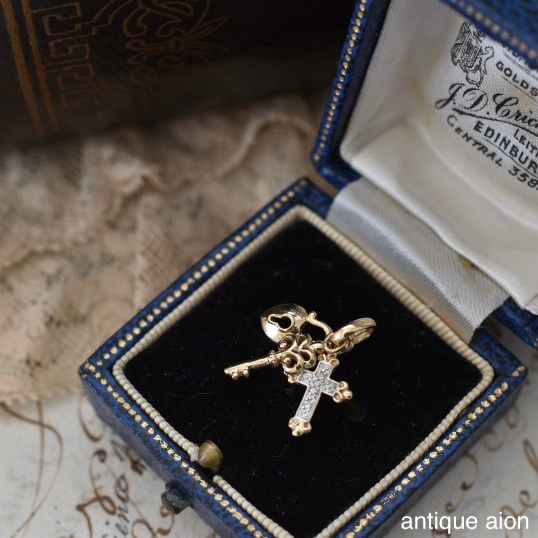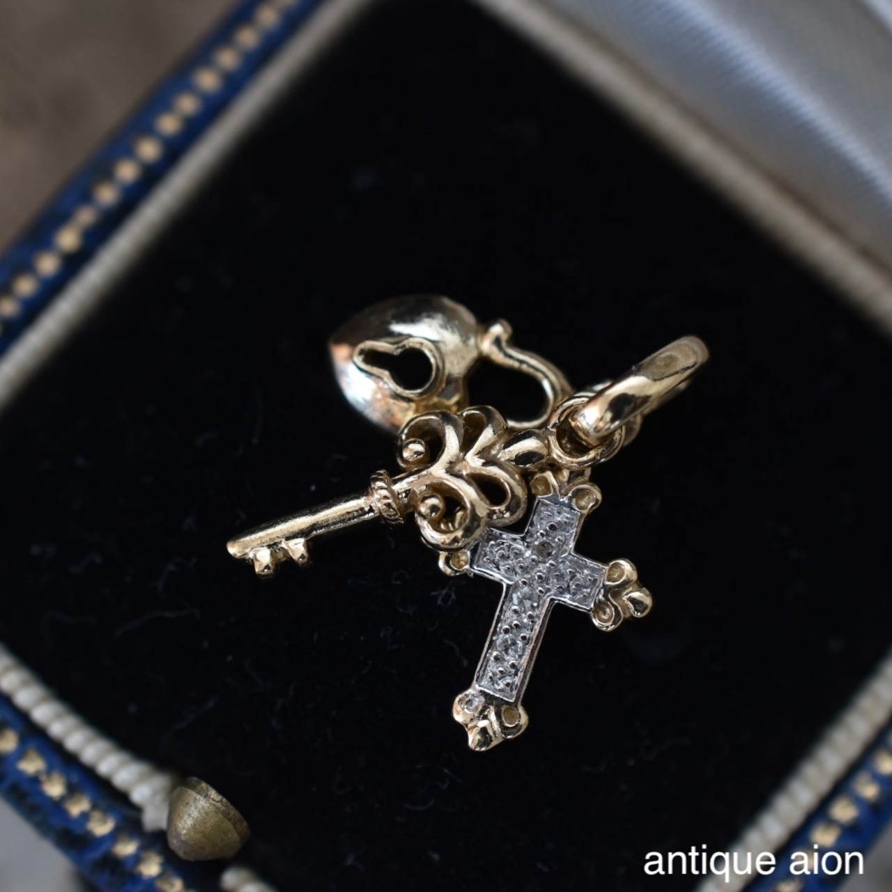 小さな物語がひとつの輪に結ばれたような、鍵、鍵穴、そしてクロスの3つのチャーム。
