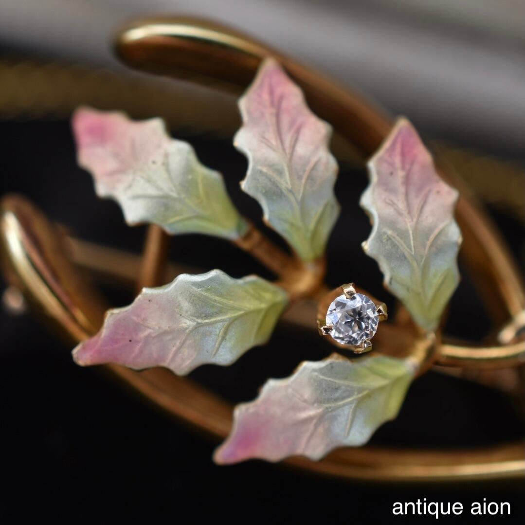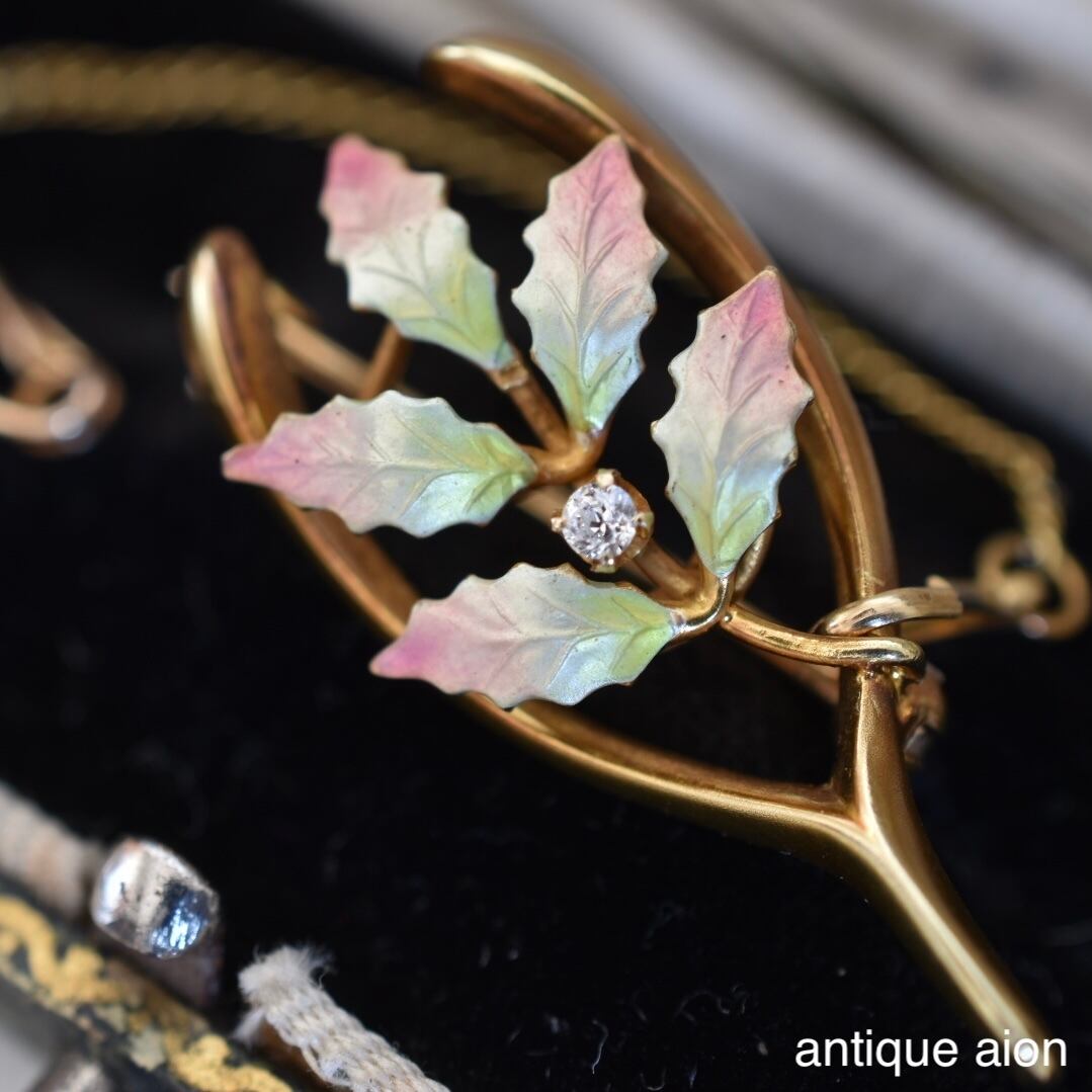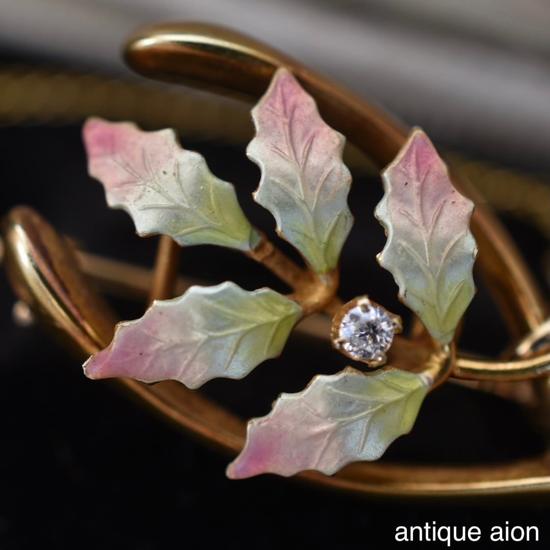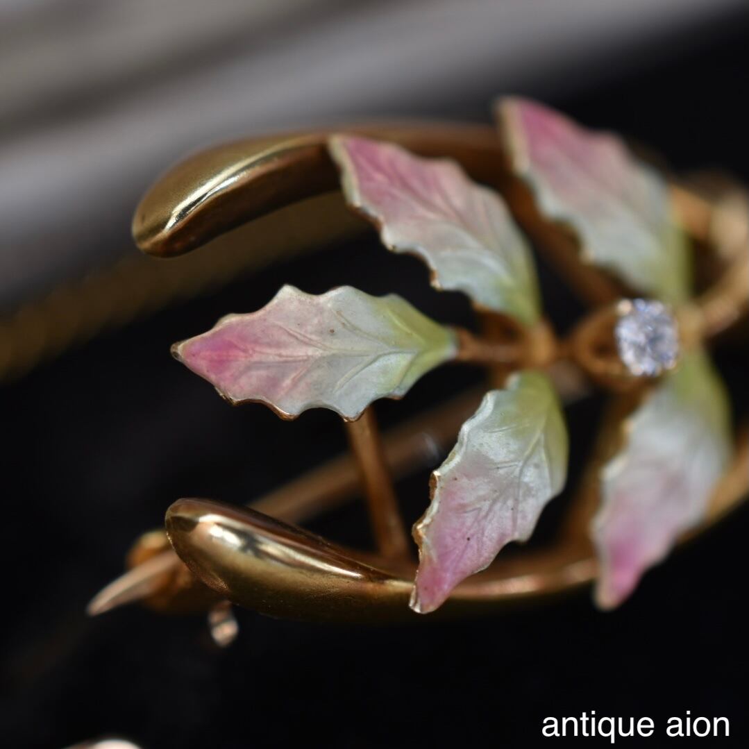 揺れるたび、エナメルの葉に光がやわらかく宿り、