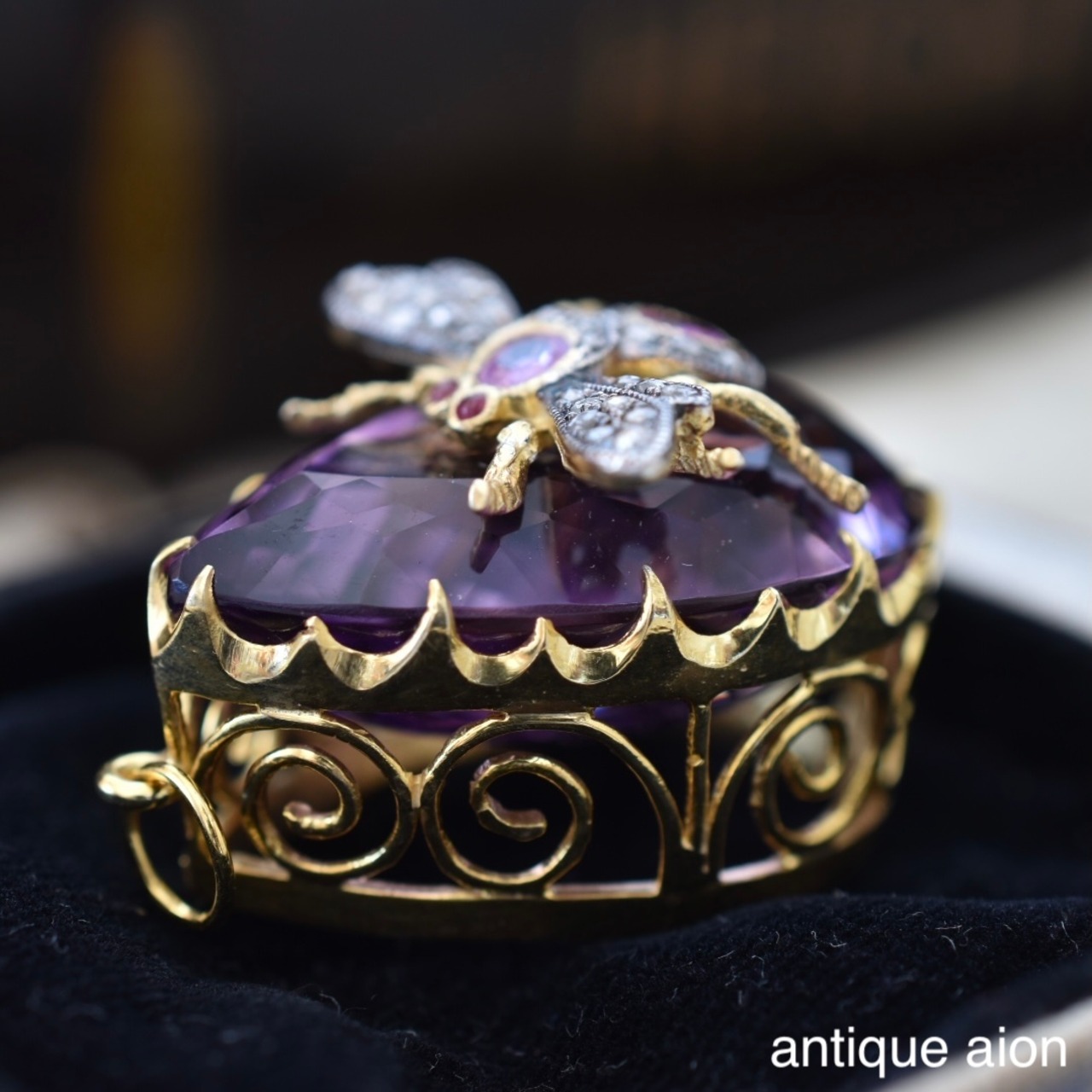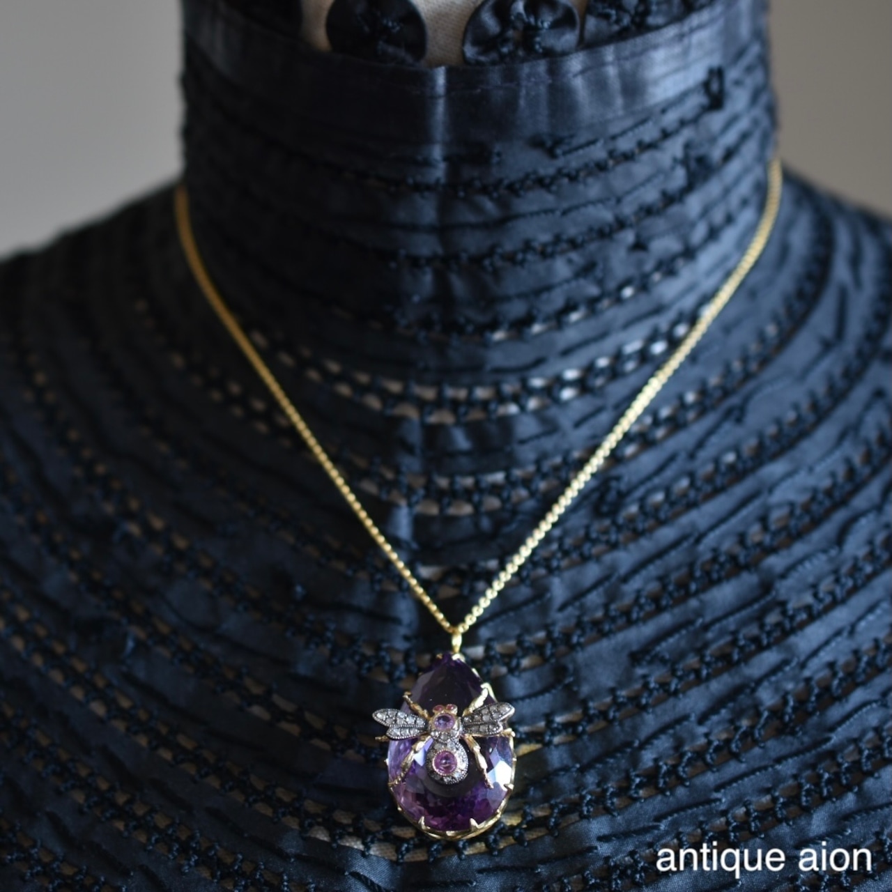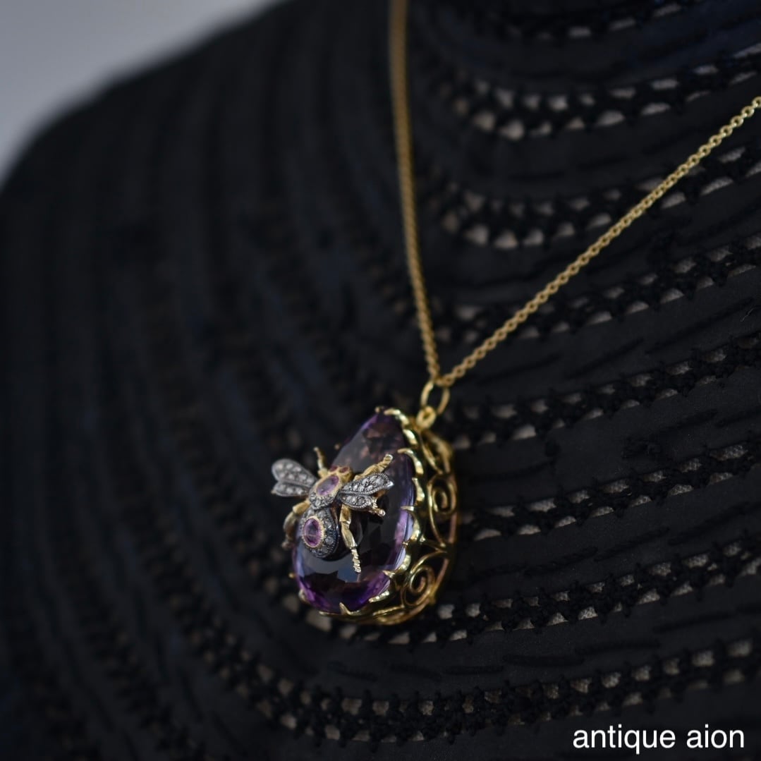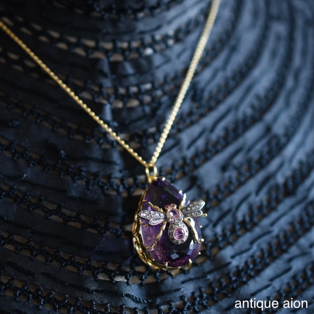 大粒43ct 天然アメジスト × 天然ダイヤモンド × 天然サファイア 蜂モチーフのペンダント