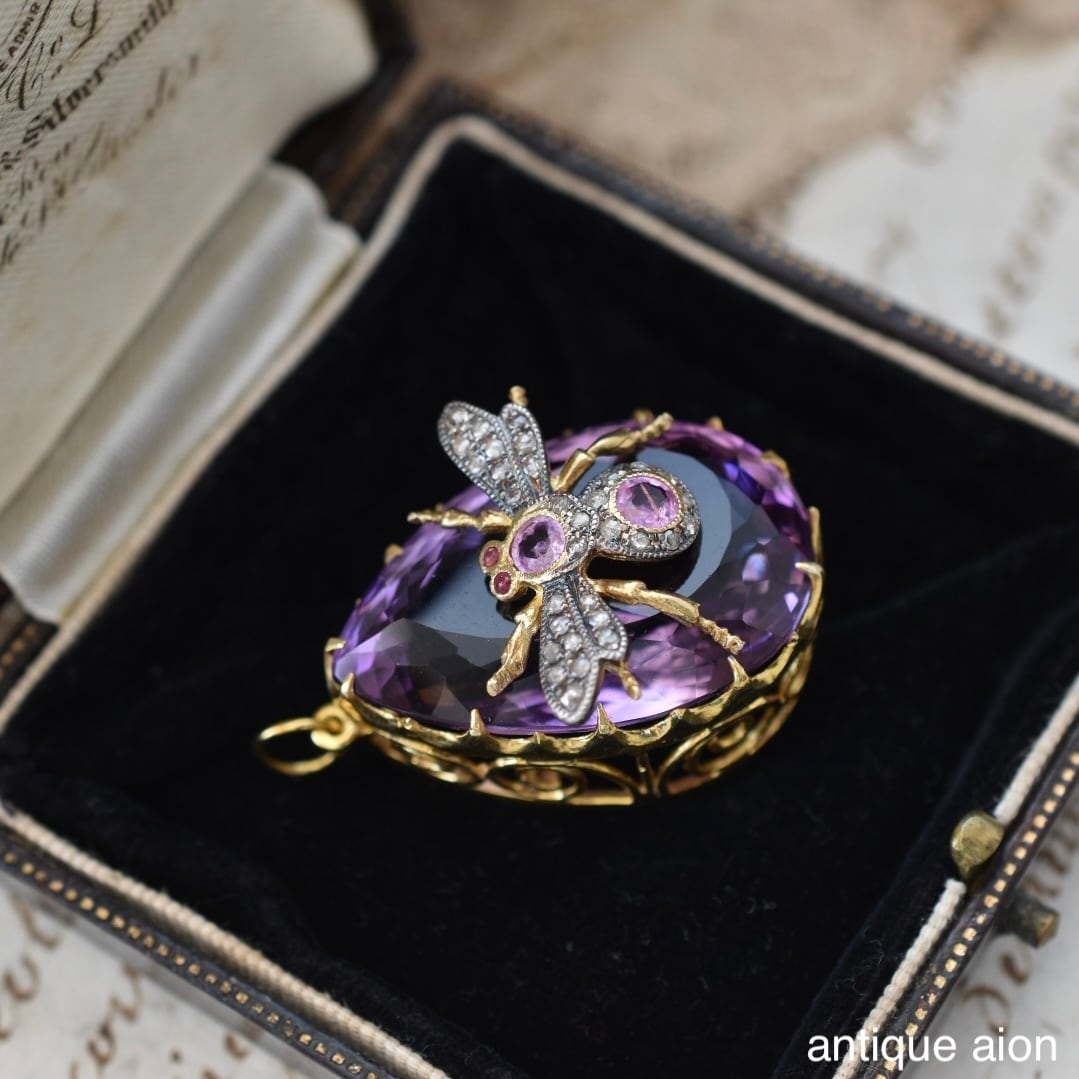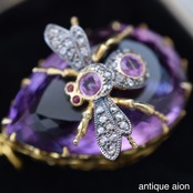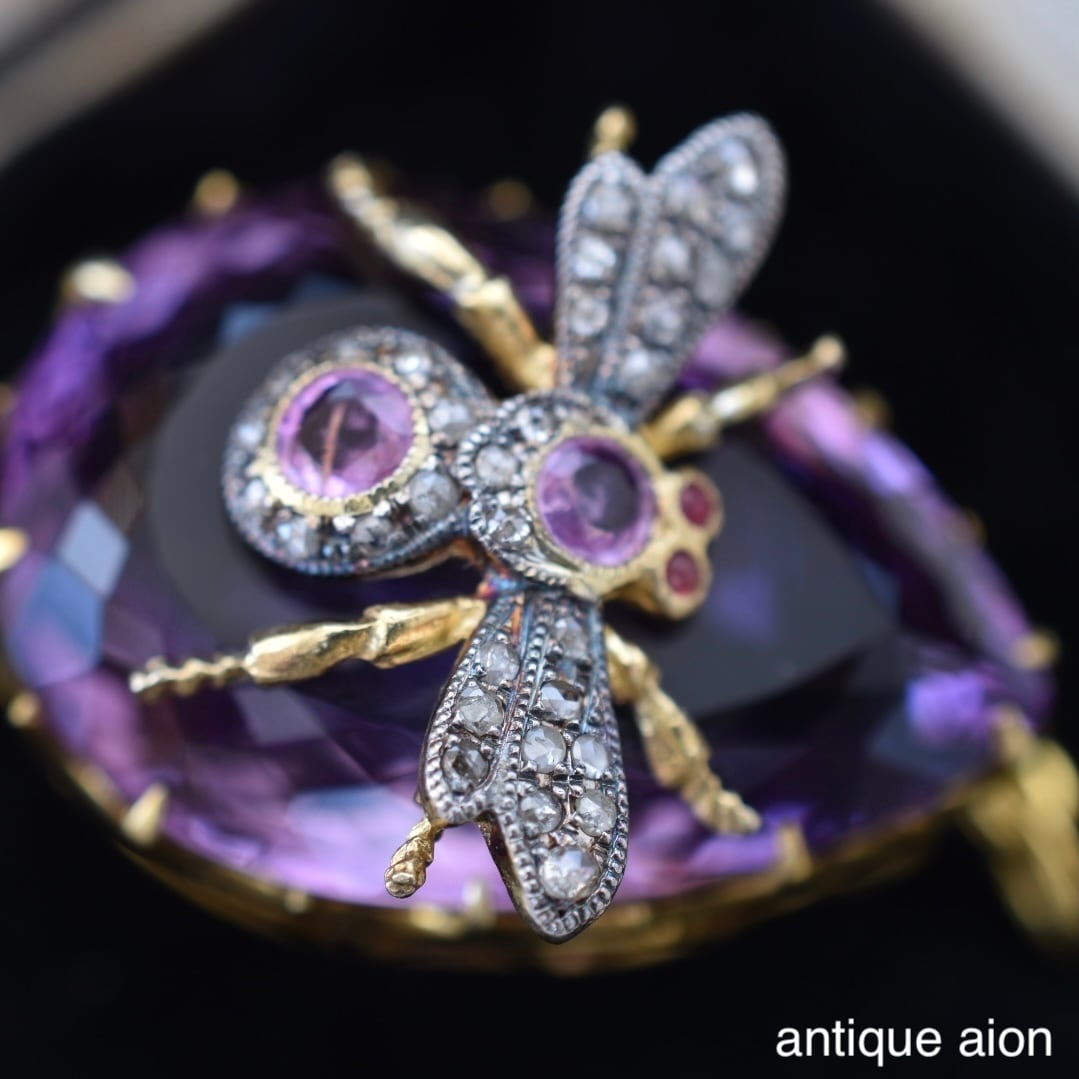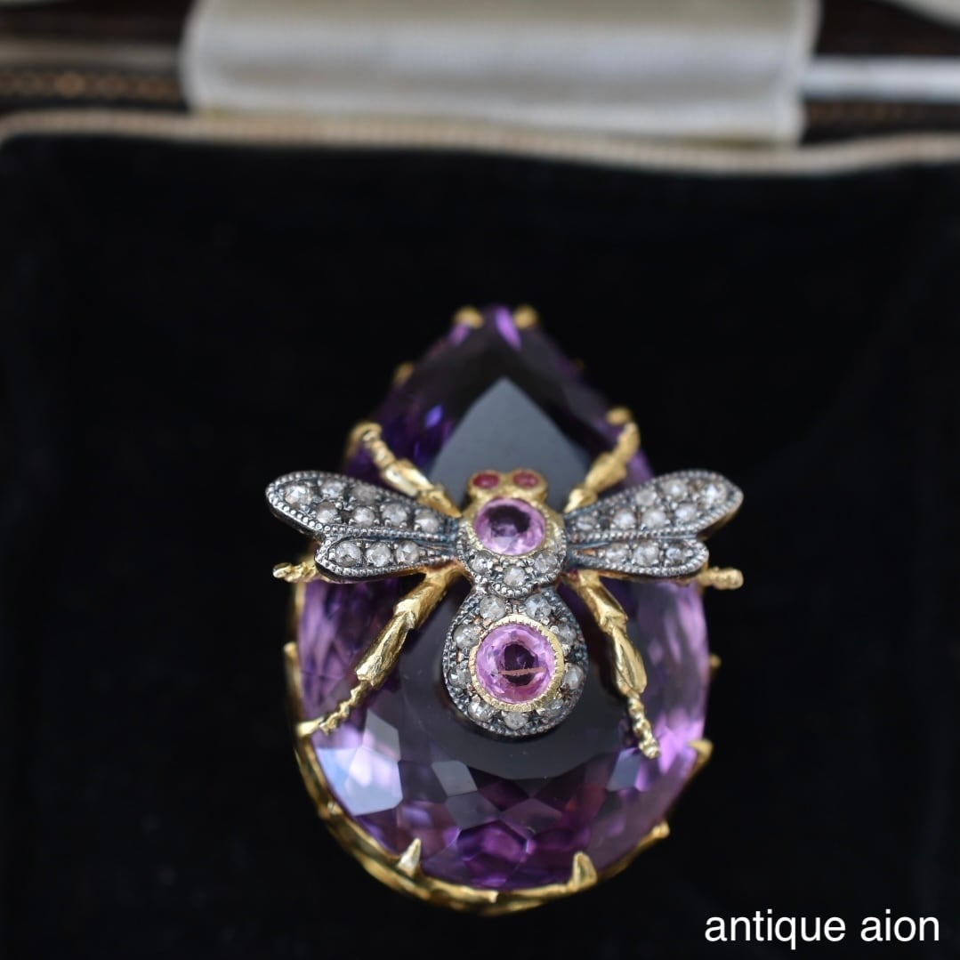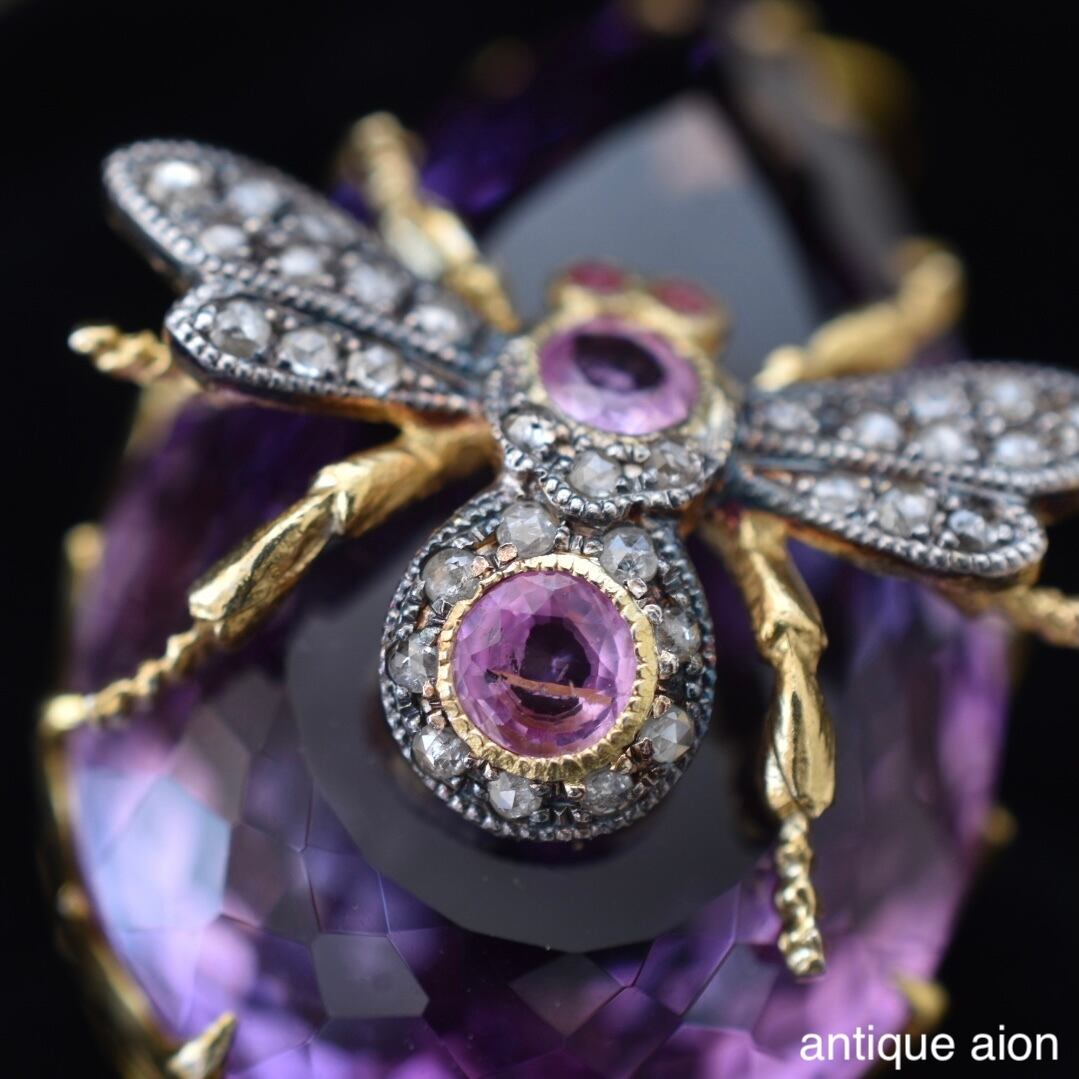 深く澄んだ紫の大粒アメジストに、まるで宝石の上に舞い降りたかのように留まる小さな蜂。