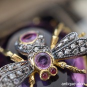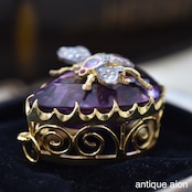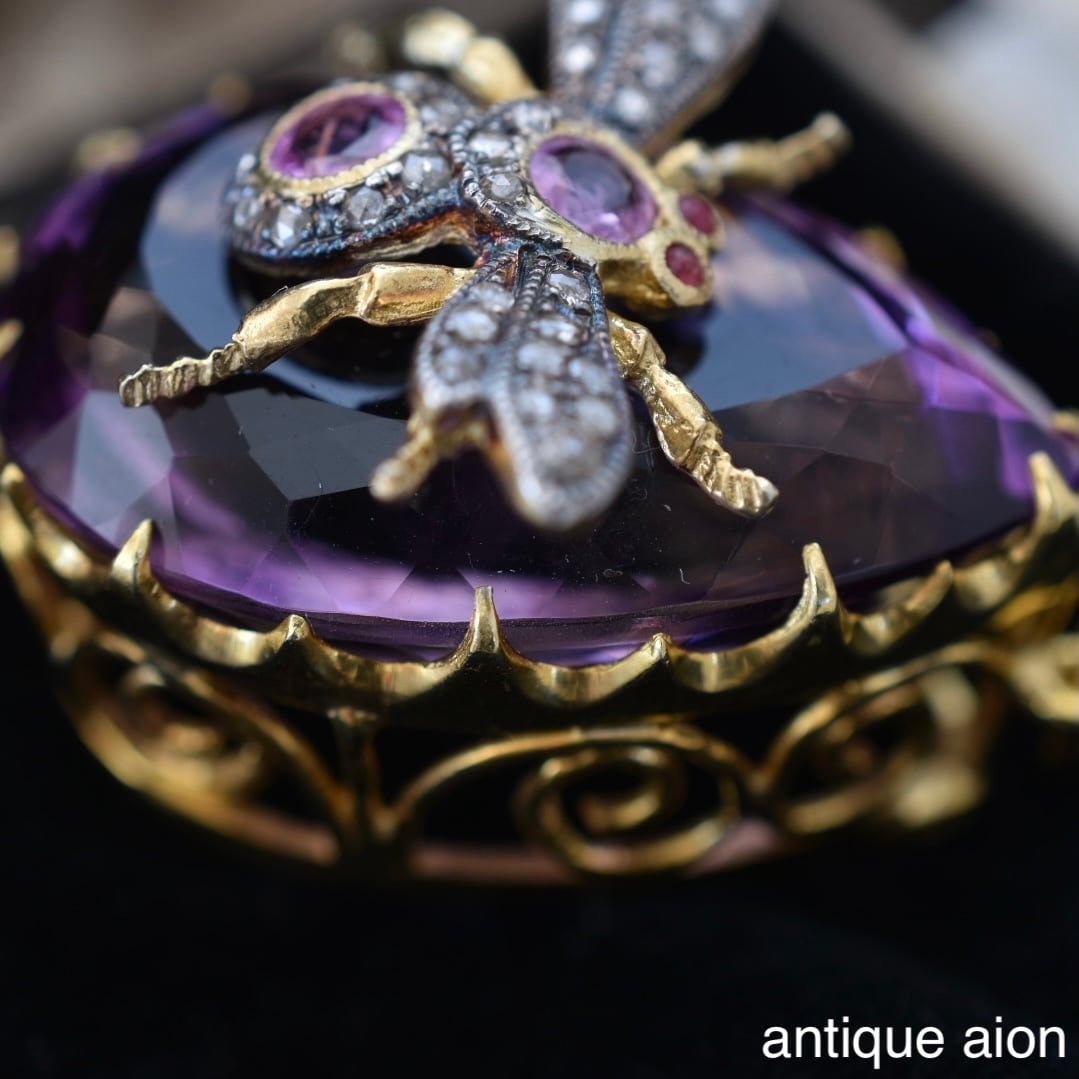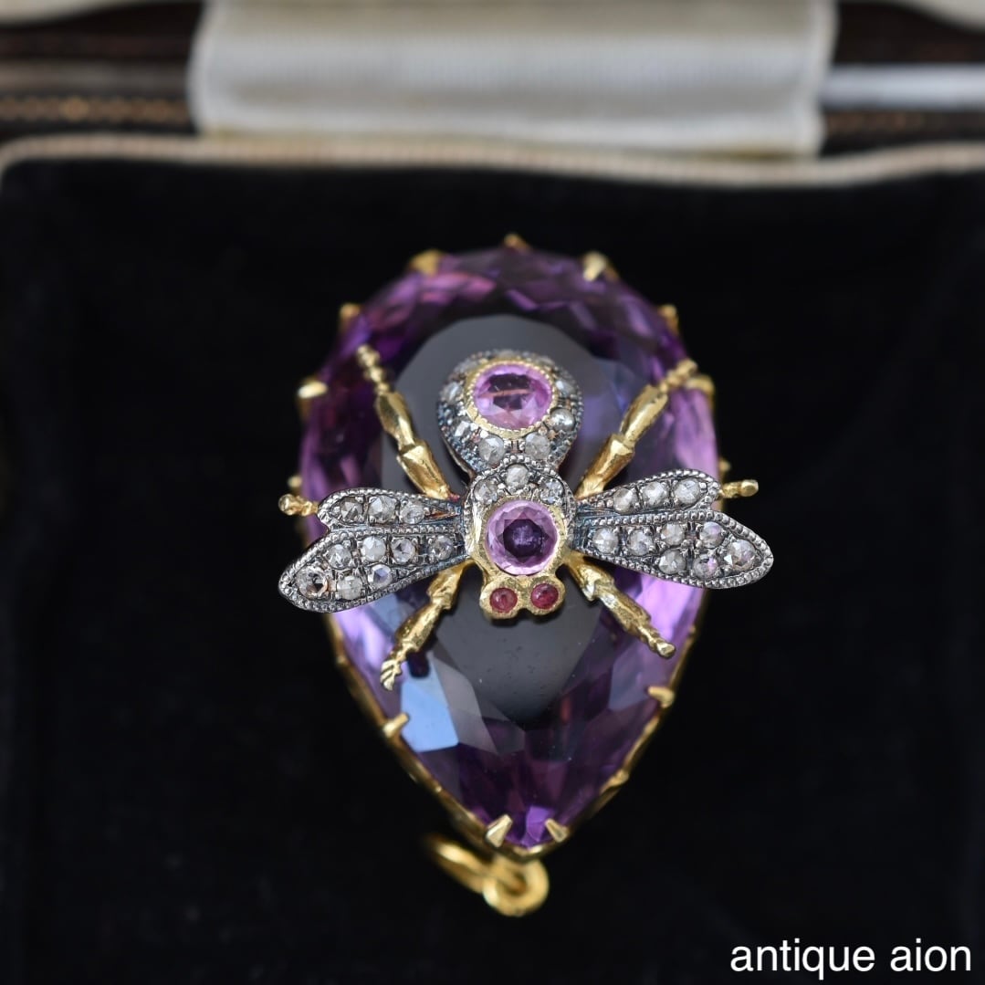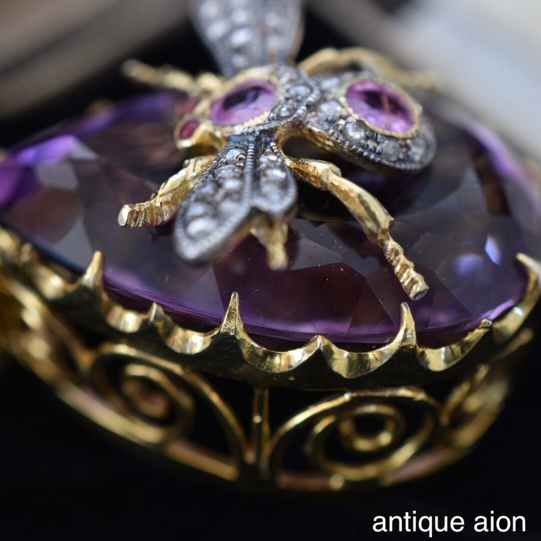 深く澄んだ紫の大粒アメジストに、まるで宝石の上に舞い降りたかのように留まる小さな蜂。