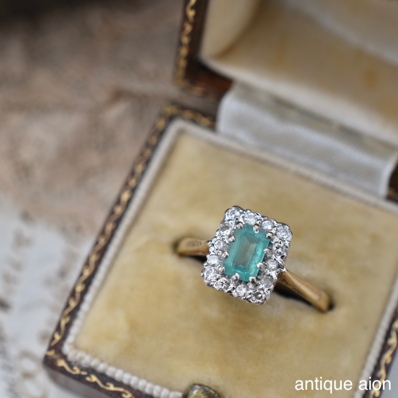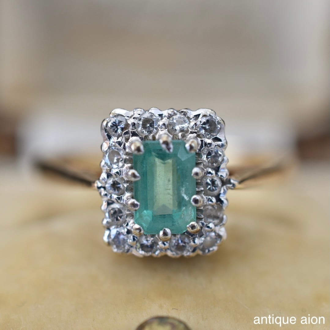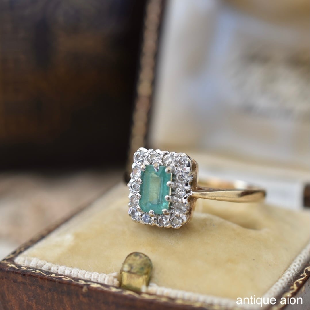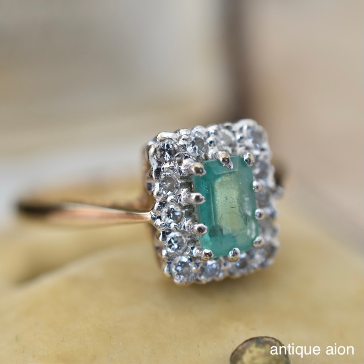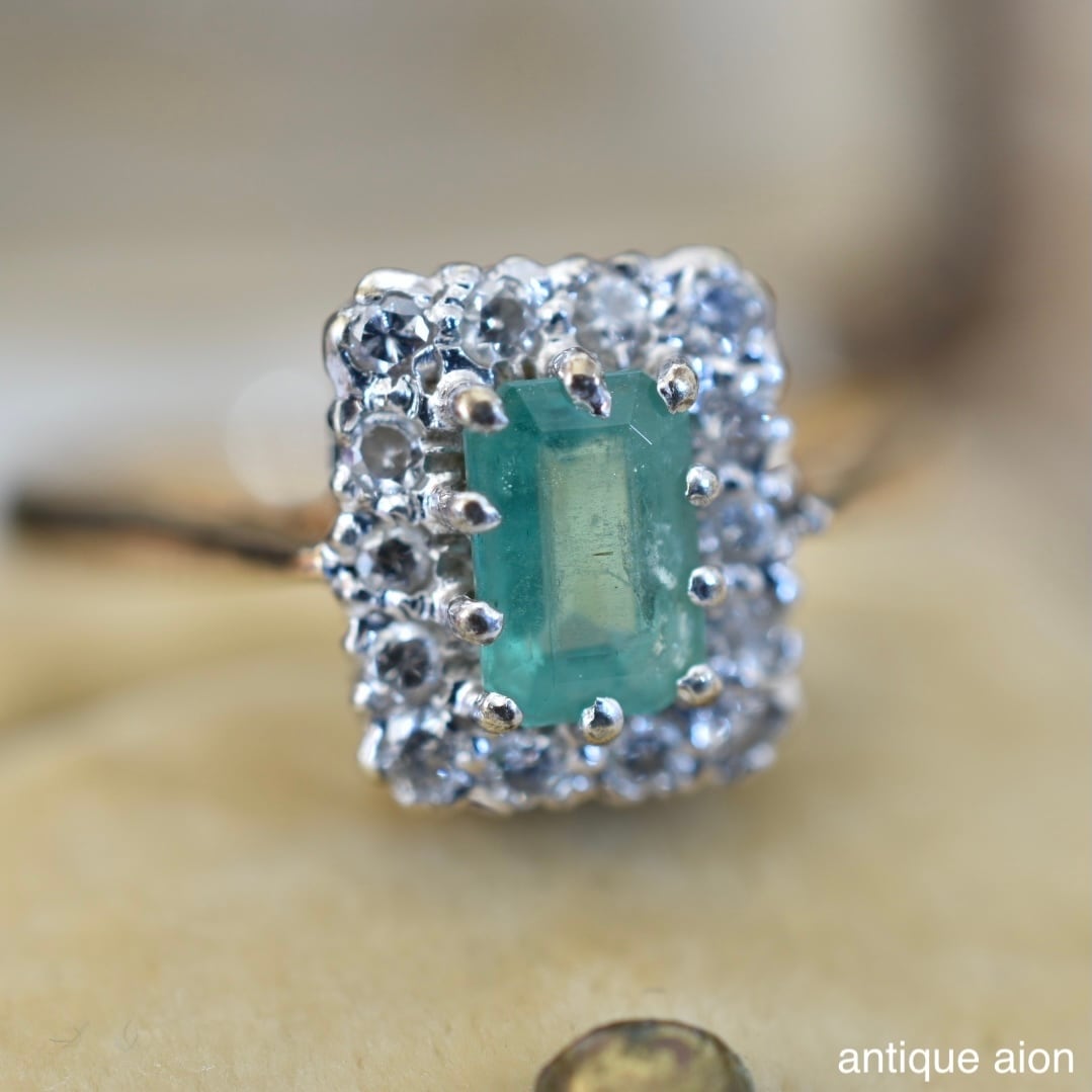 天然エメラルドと天然ダイヤモンドが清楚にきらめくヴィンテージのクラスターリングです。