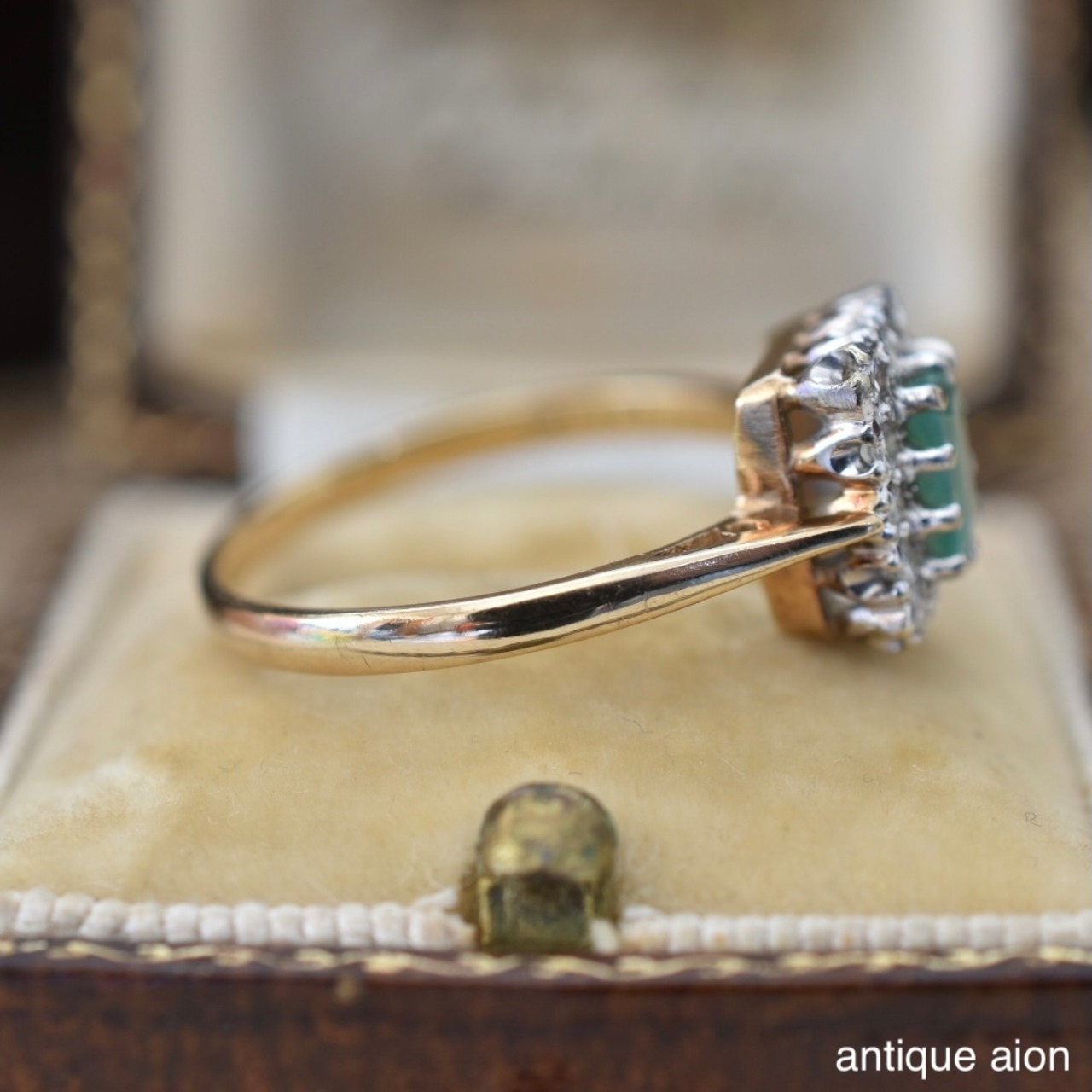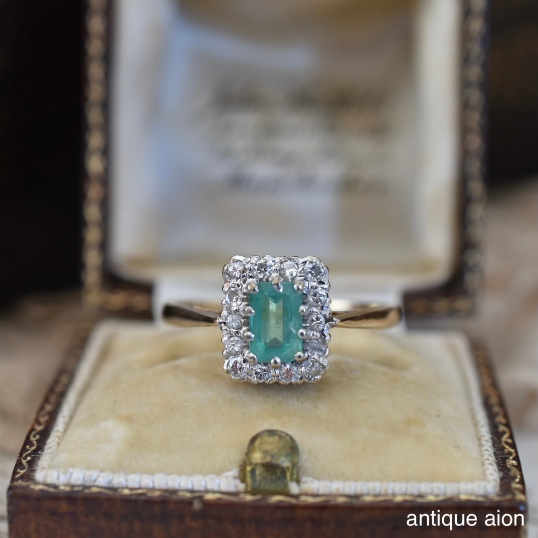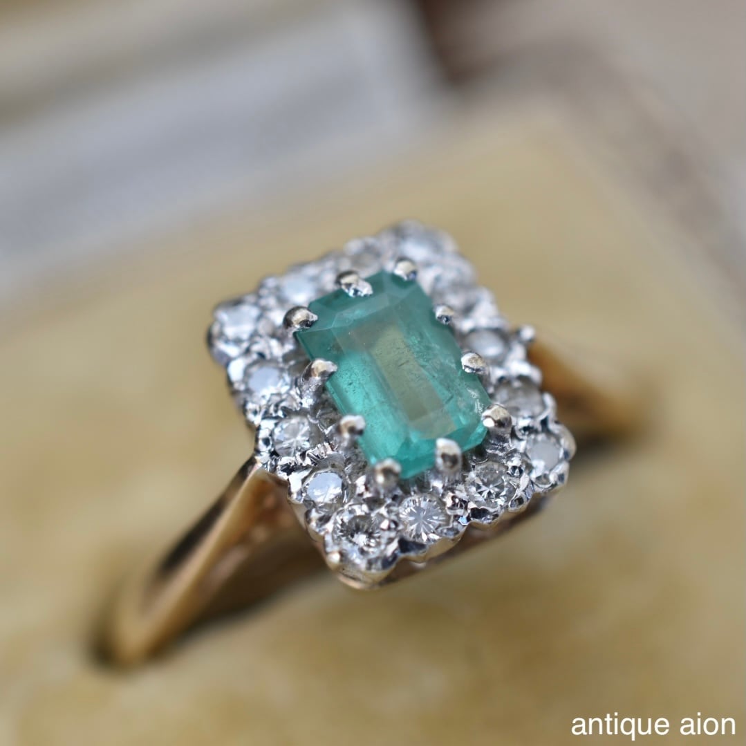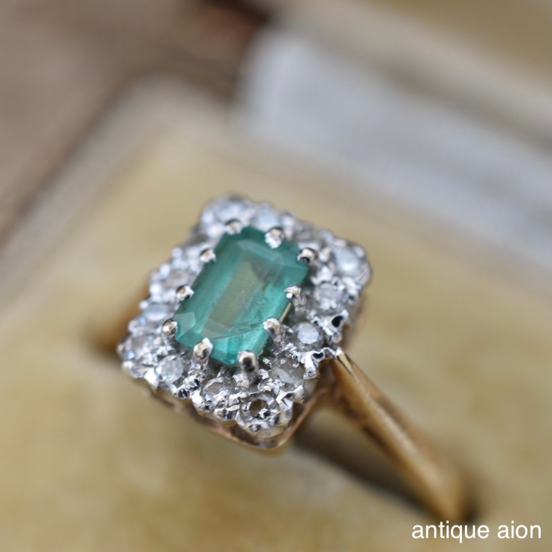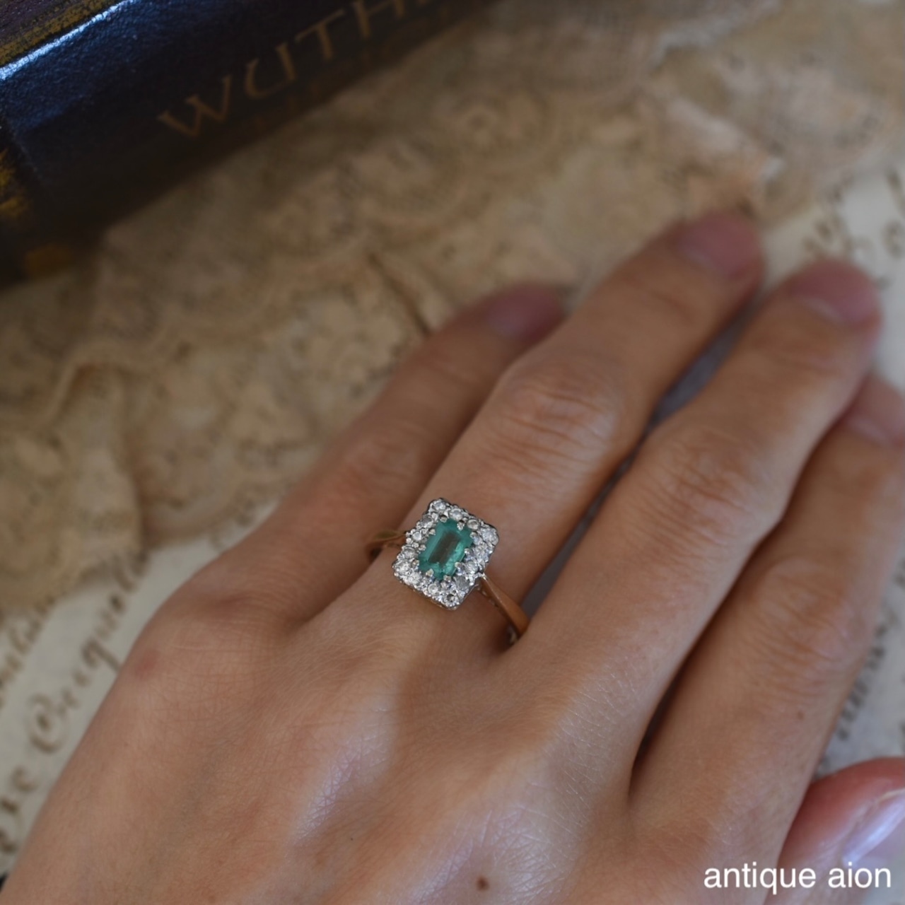 天然エメラルドと天然ダイヤモンドが清楚にきらめくヴィンテージのクラスターリングです。