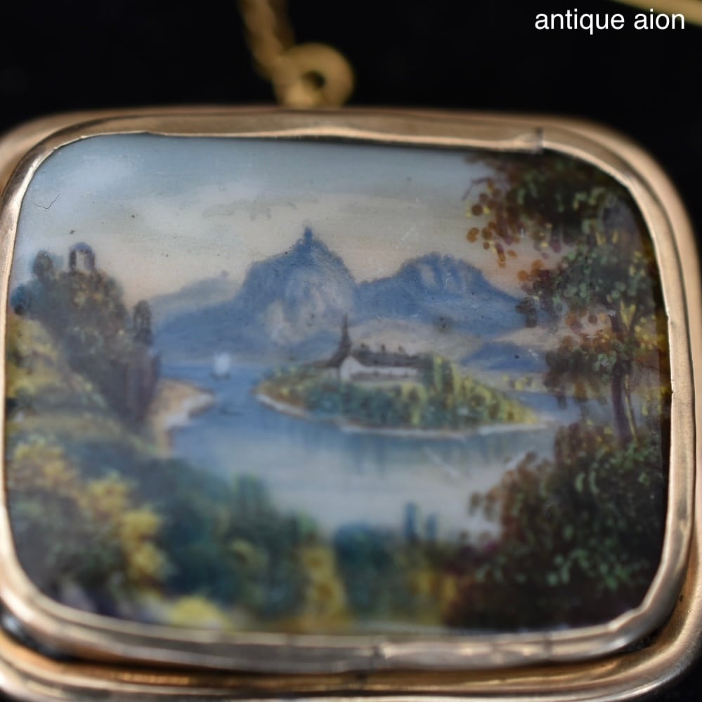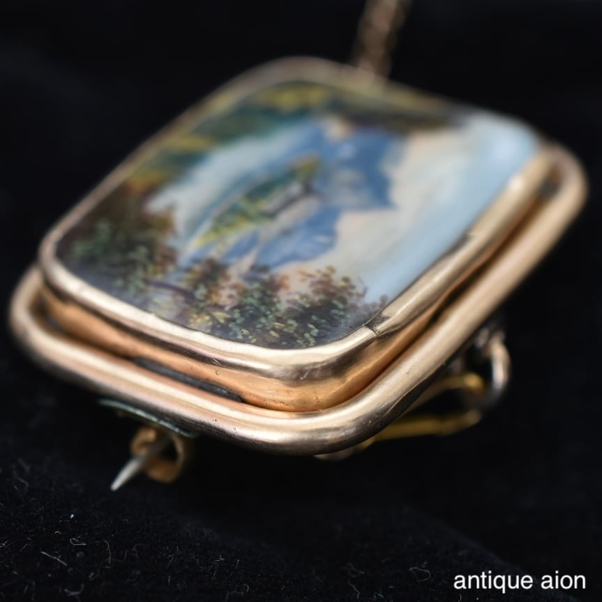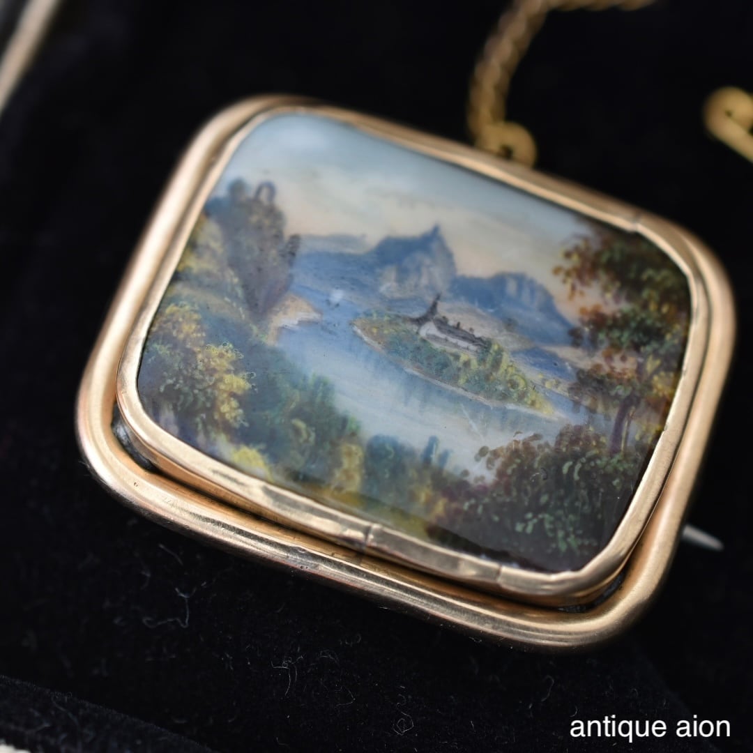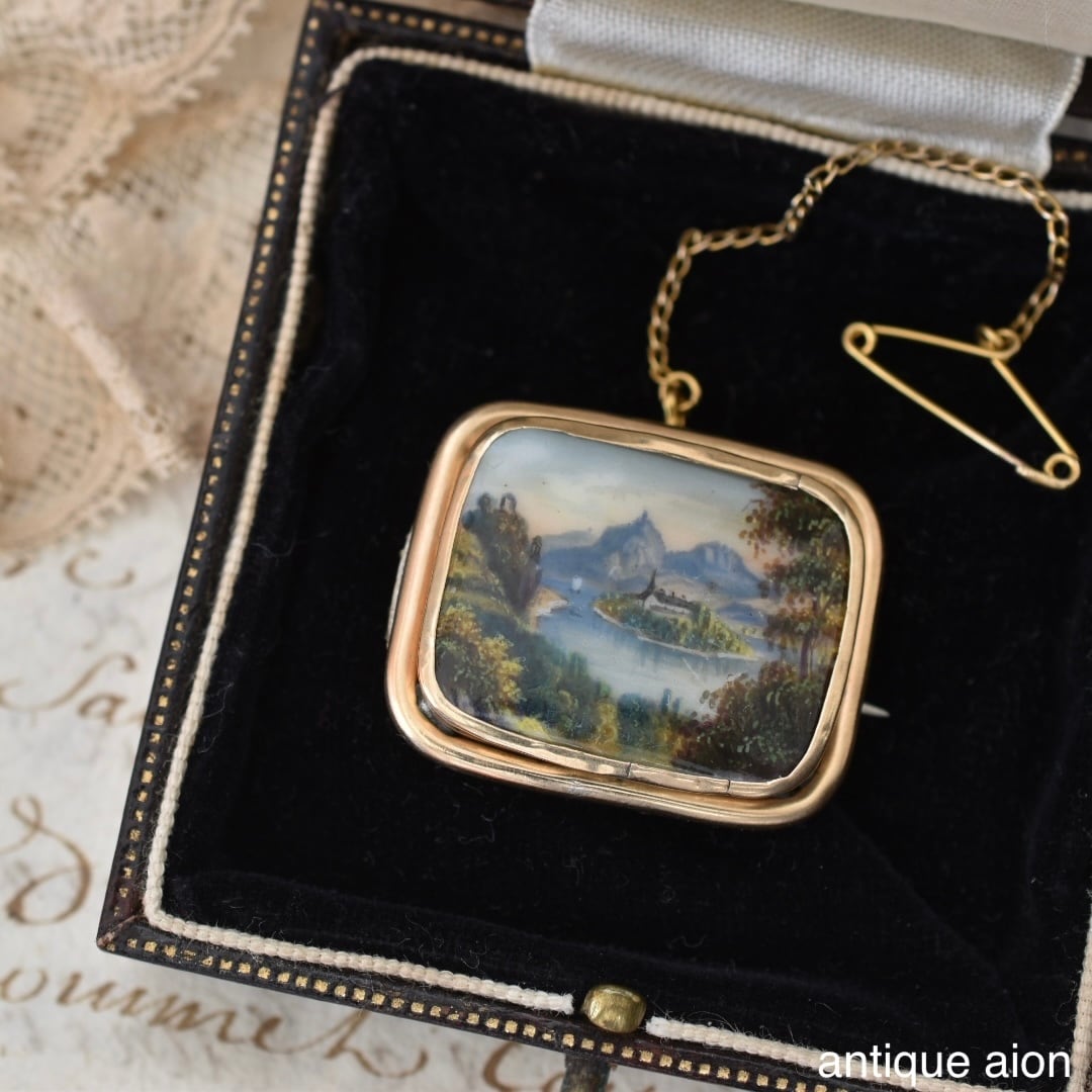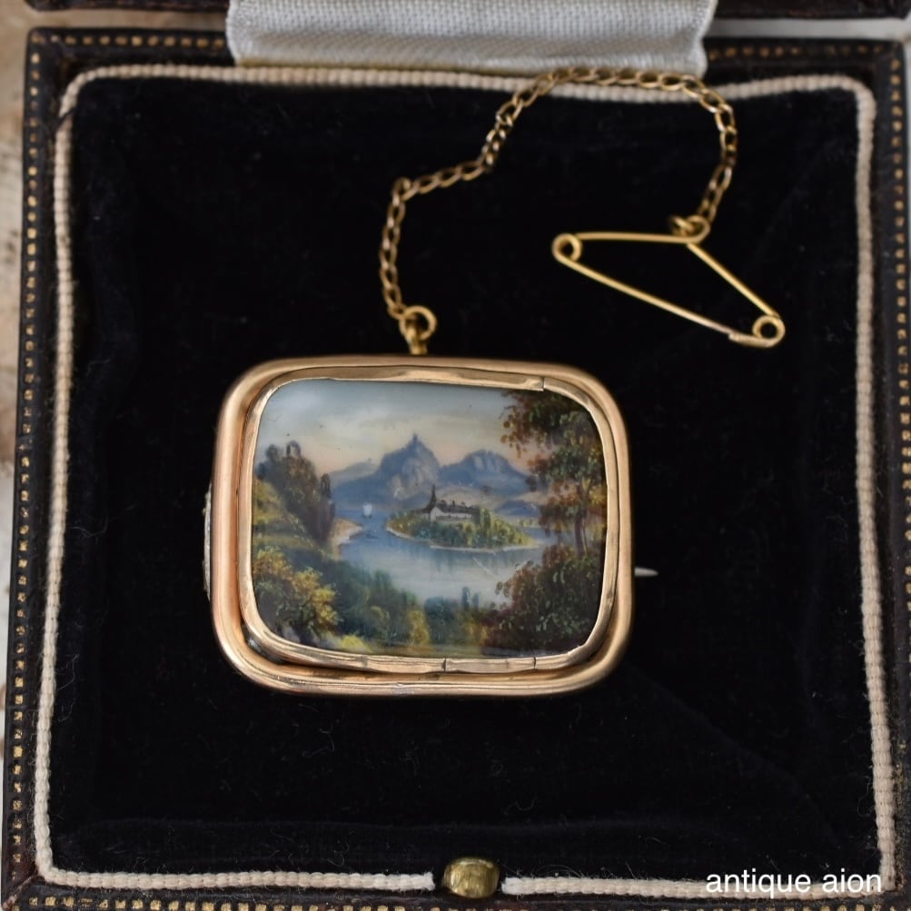 中欧圏アンティーク 9ctゴールド 風景画ミニアチュール 湖畔の教会 ブローチ
