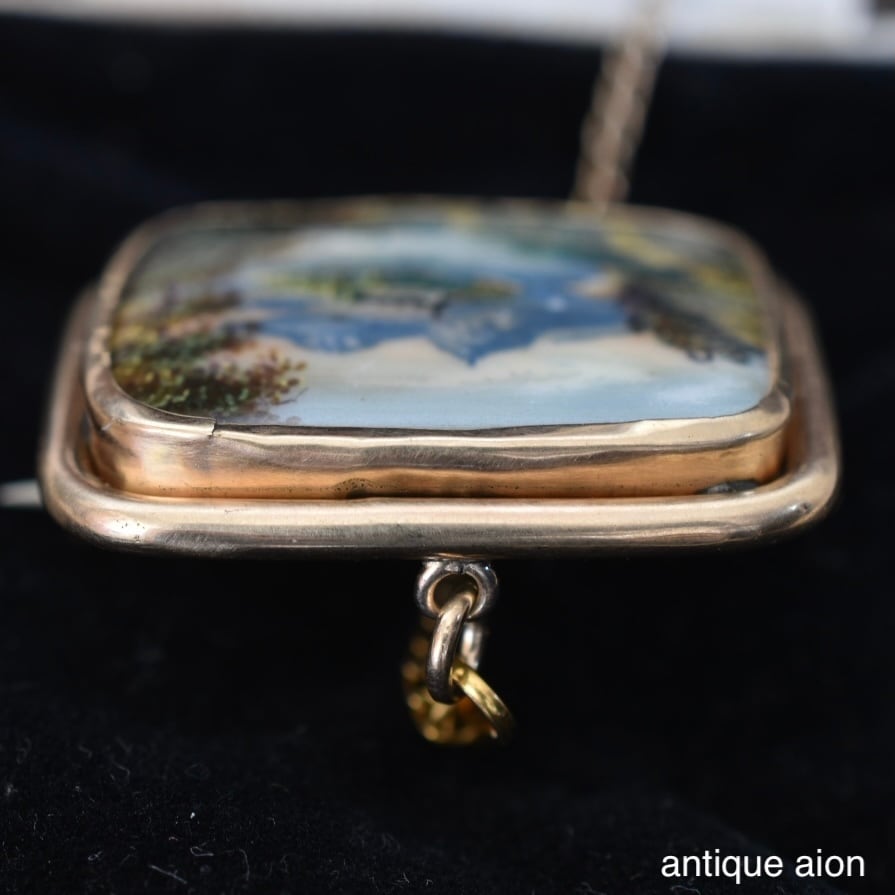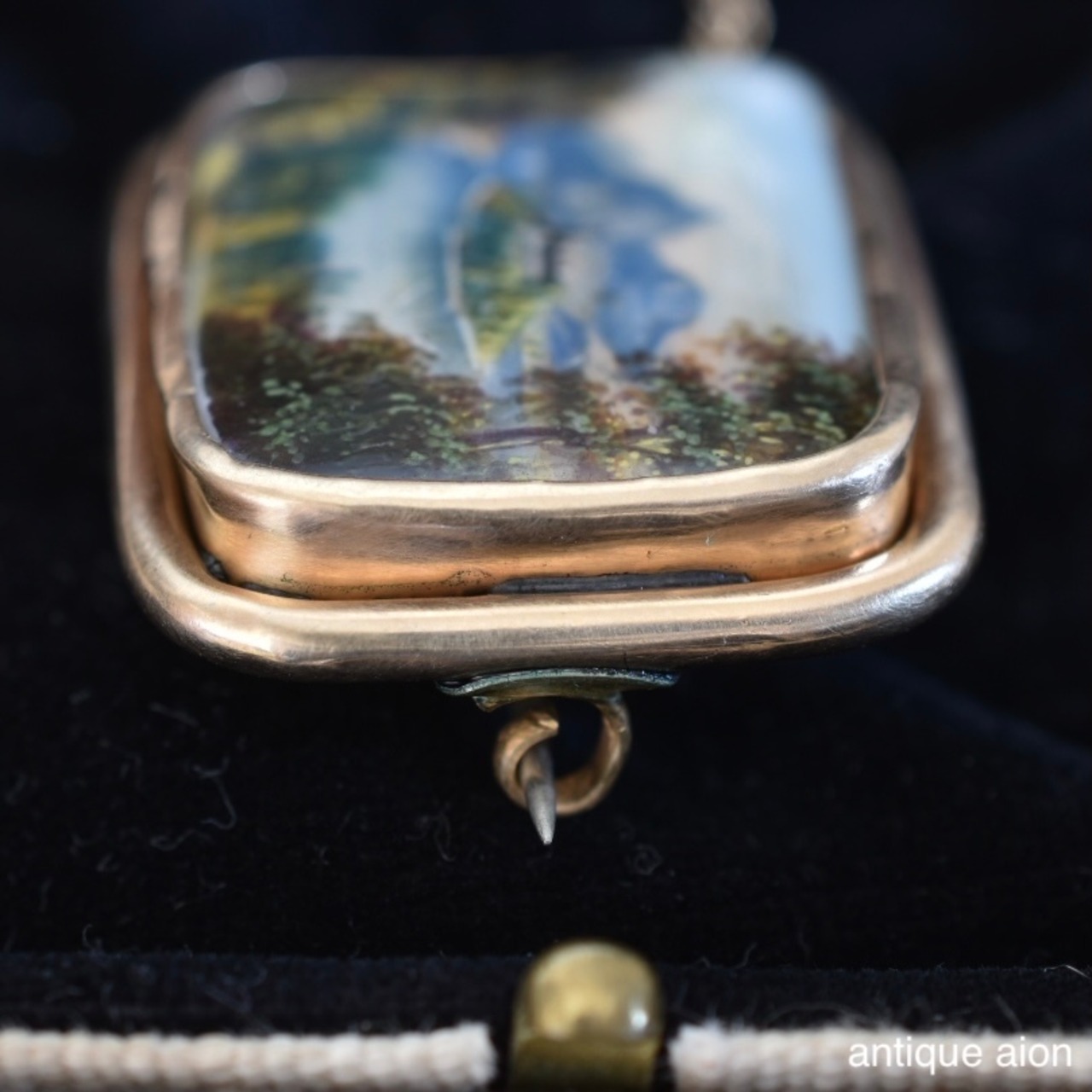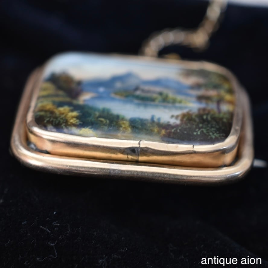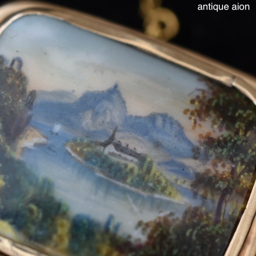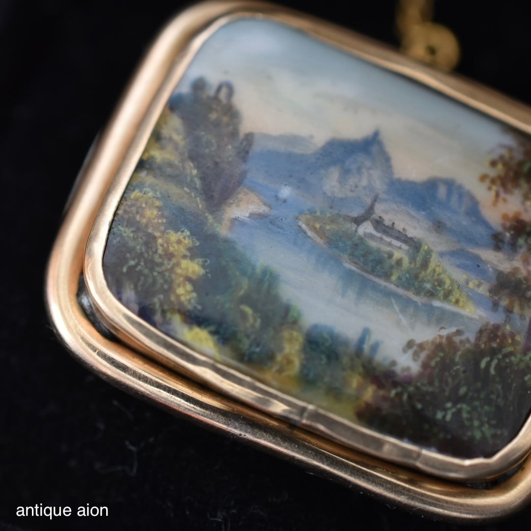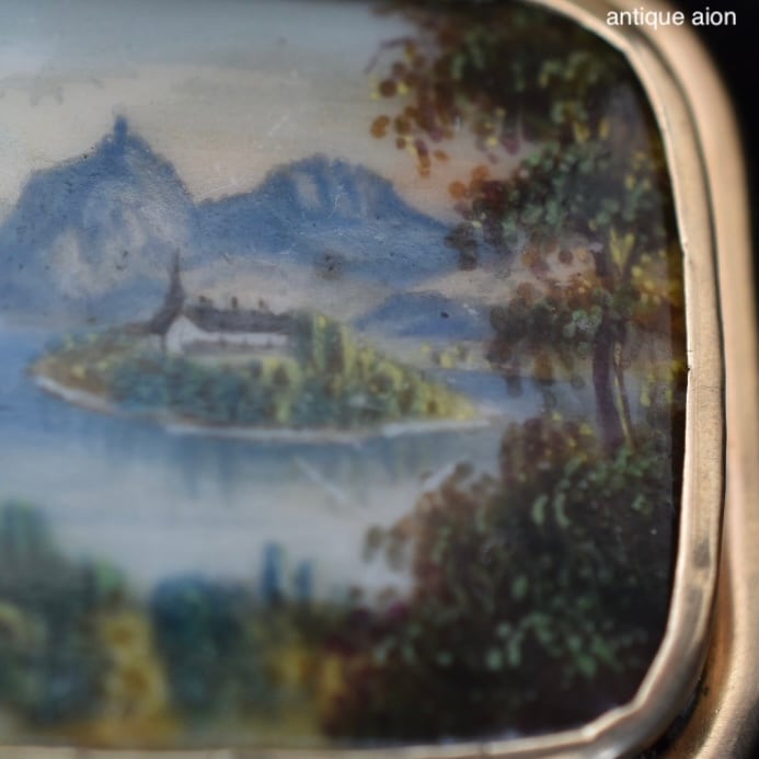 中欧圏アンティーク 9ctゴールド 風景画ミニアチュール 湖畔の教会 ブローチ