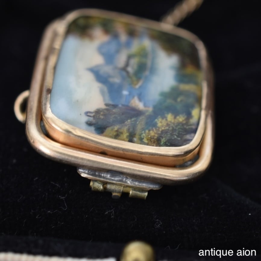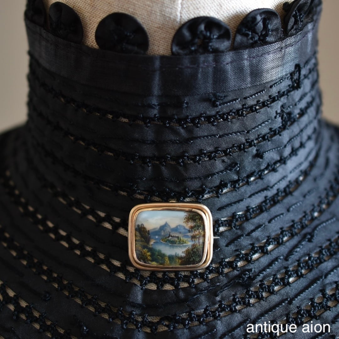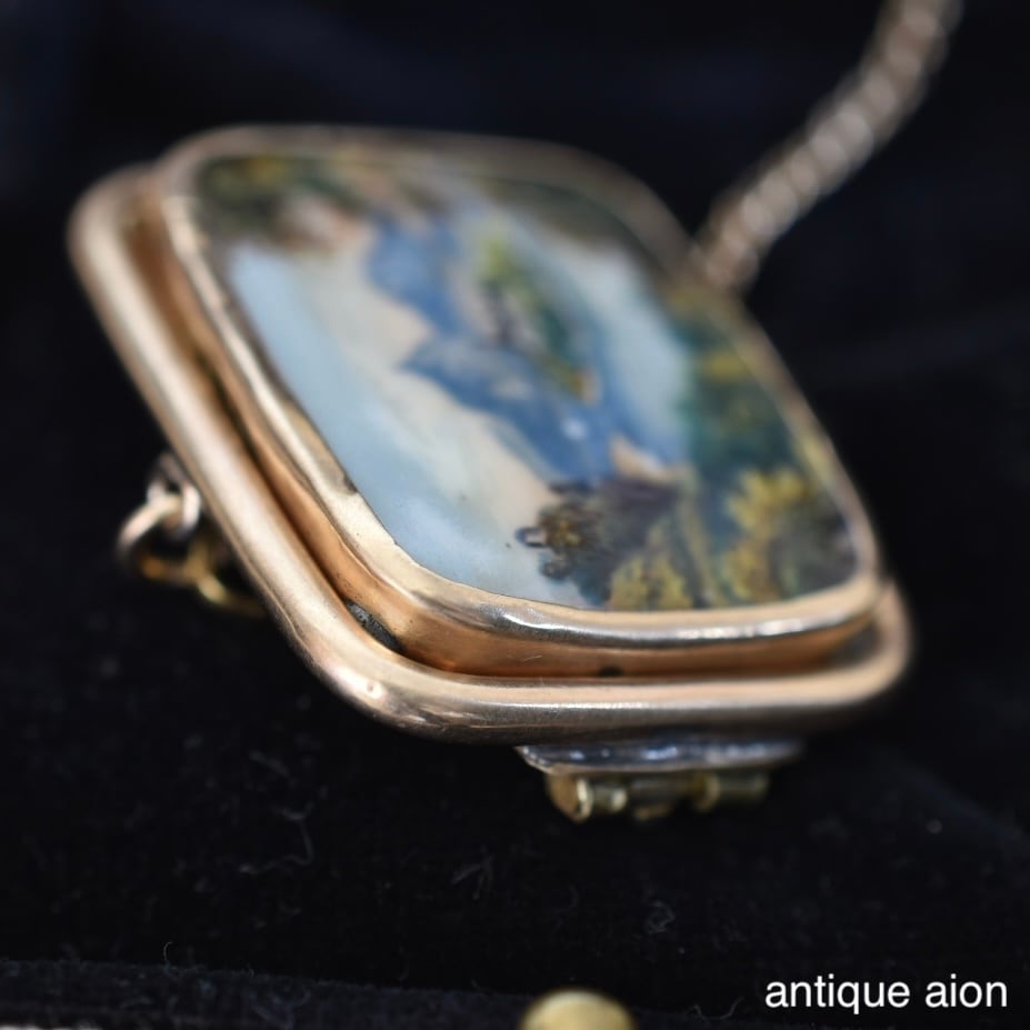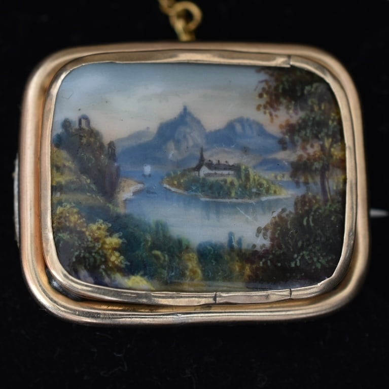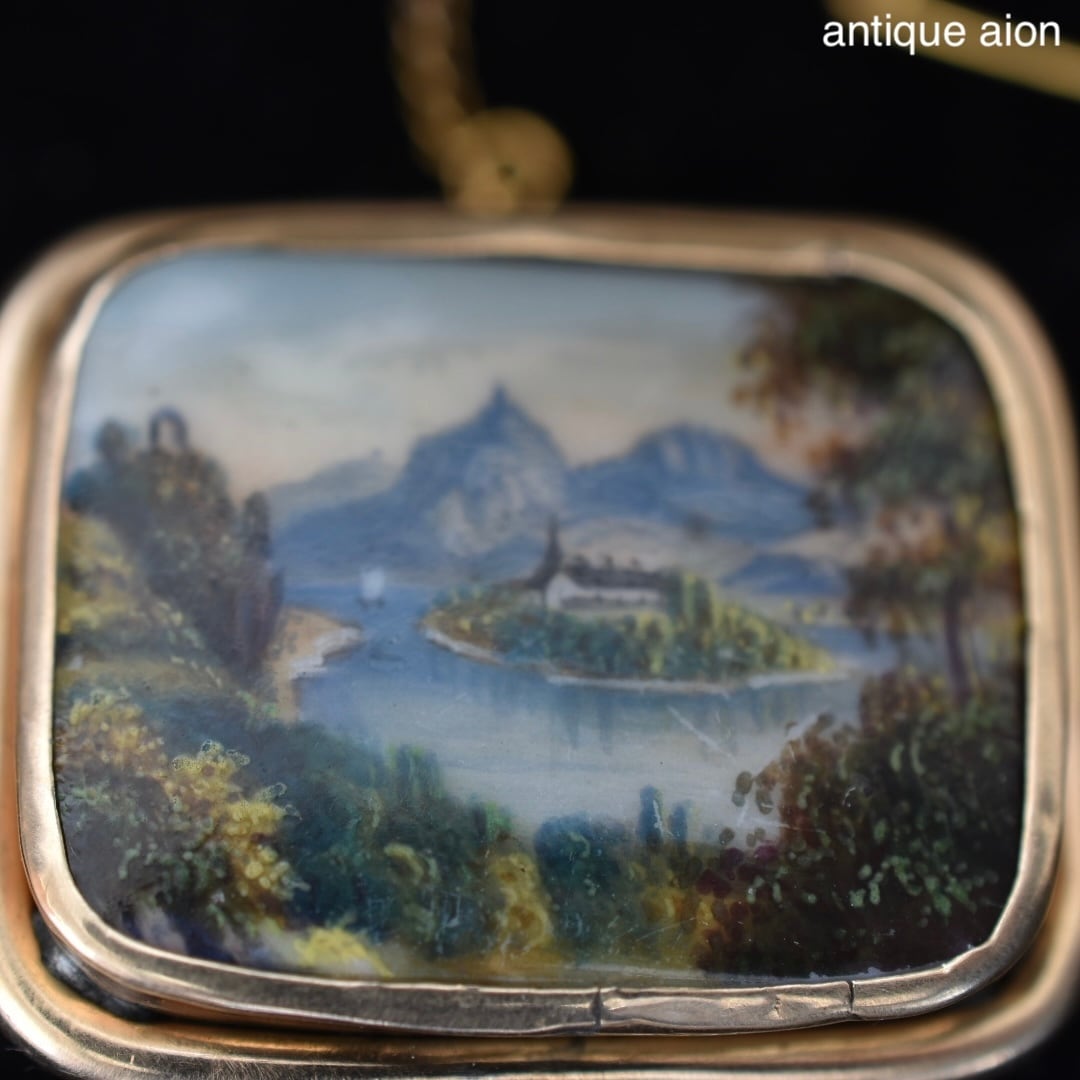中欧圏アンティーク 9ctゴールド 風景画ミニアチュール 湖畔の教会 ブローチ