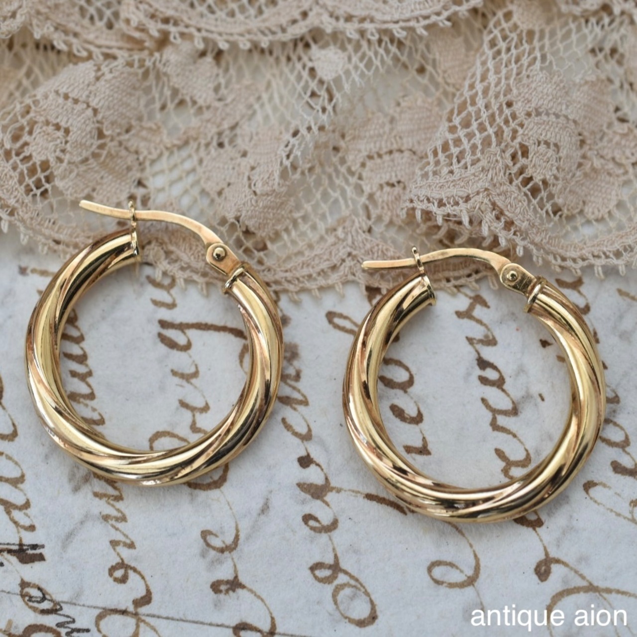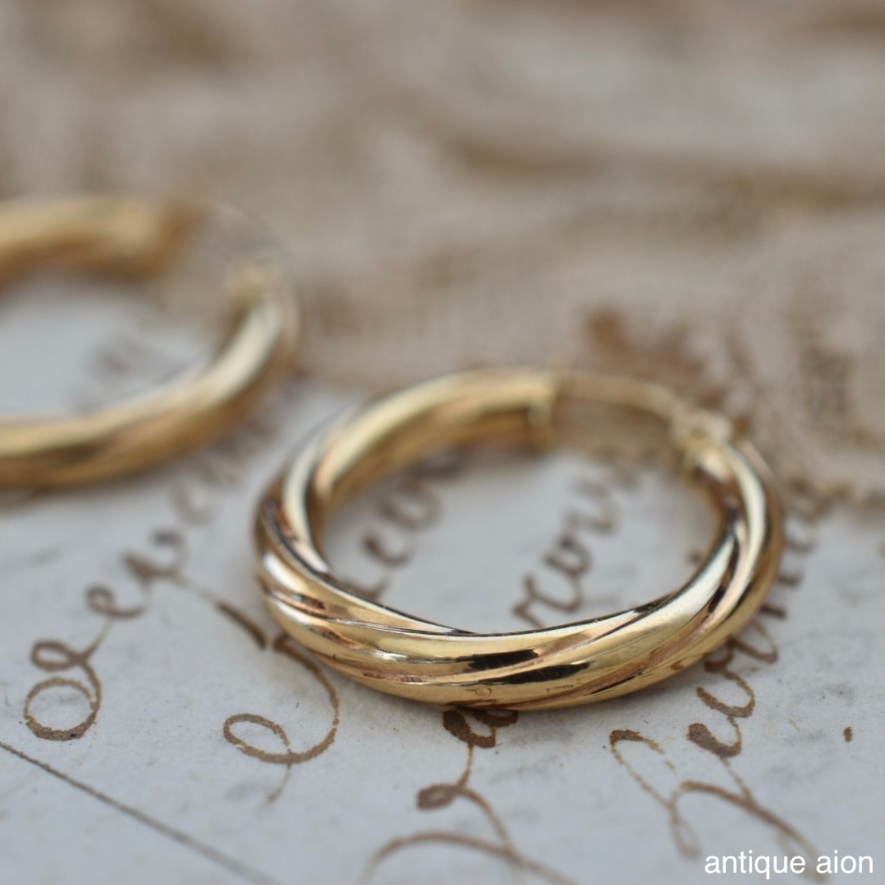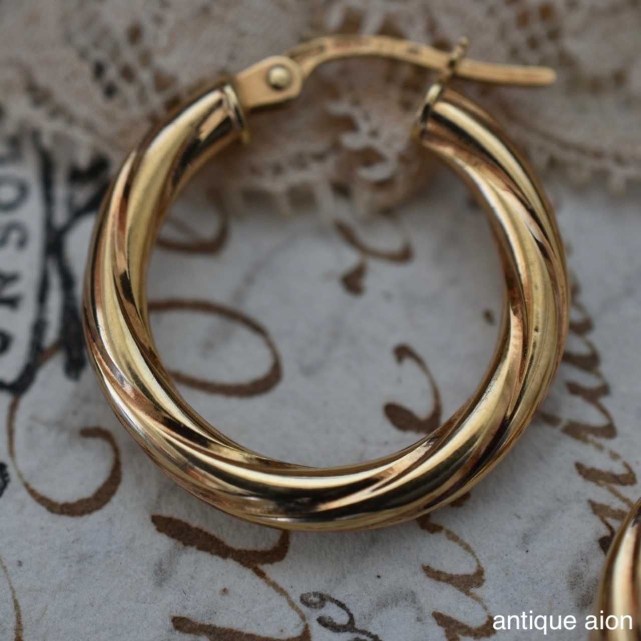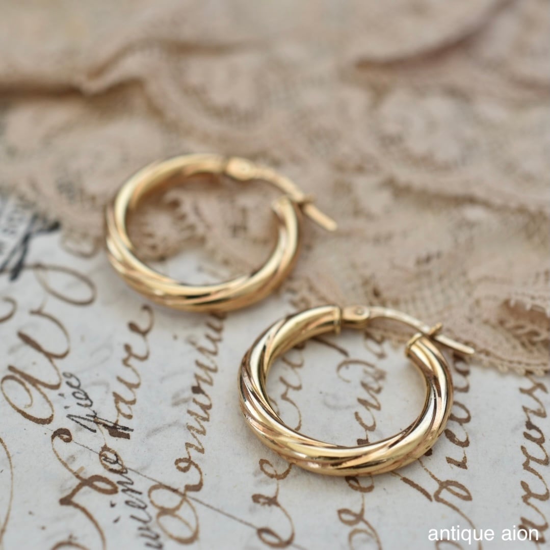 やわらかなツイストが施されたフープは、光を受ける角度によって表情を変え、ゴールドそのものが持つ温かみと艶を美しく引き立てます。