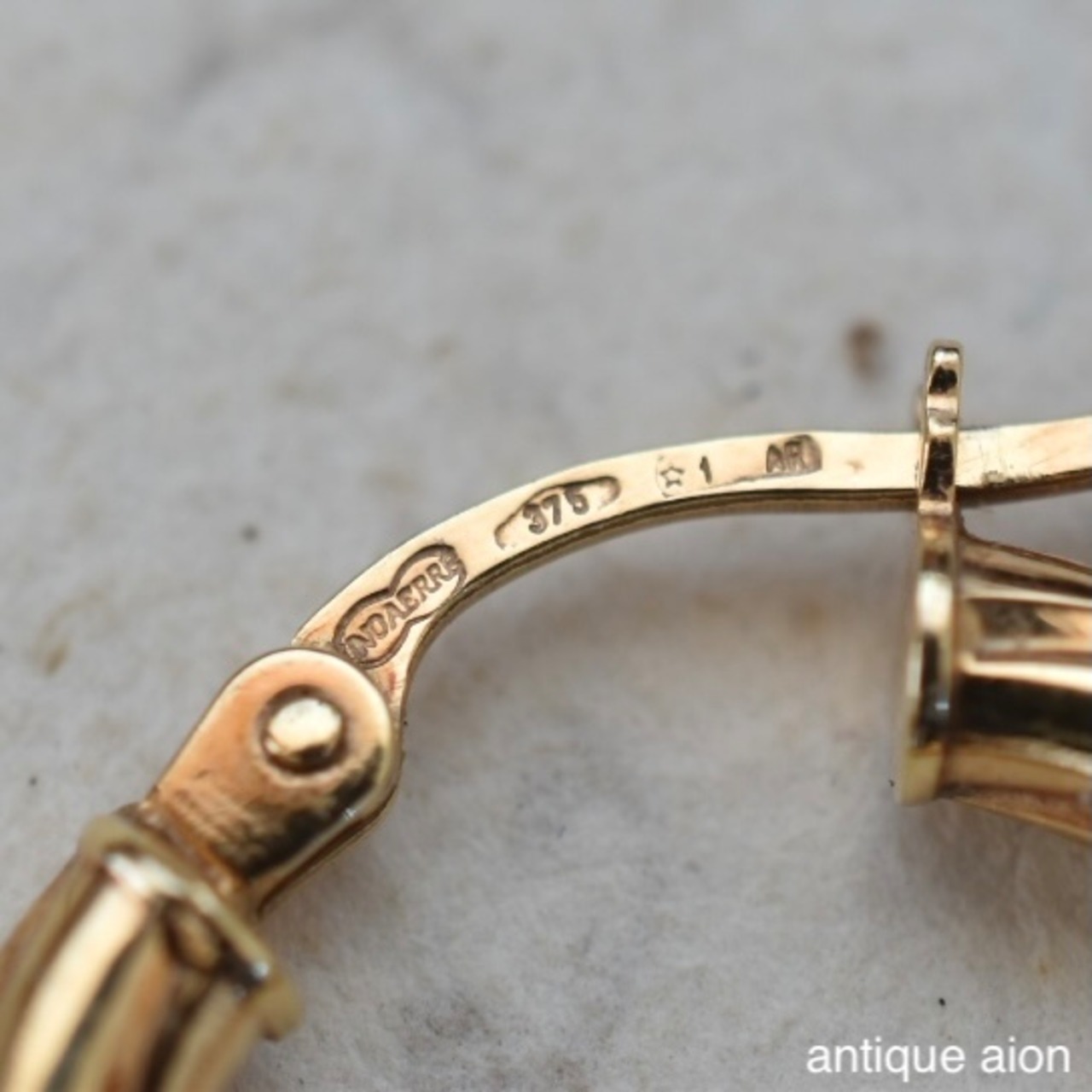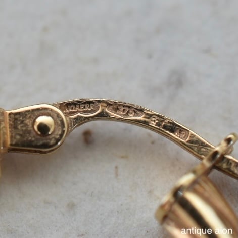 UNOAERREは特に1970年代後半から1990年代にかけて9ctゴールド製ジュエリーを多く手がけており、以降は14ctや18ctが主流となっていることから、本品は1980年代後半〜1990年代初頭頃に製作されたヴィンテージジュエリーと考えられます。