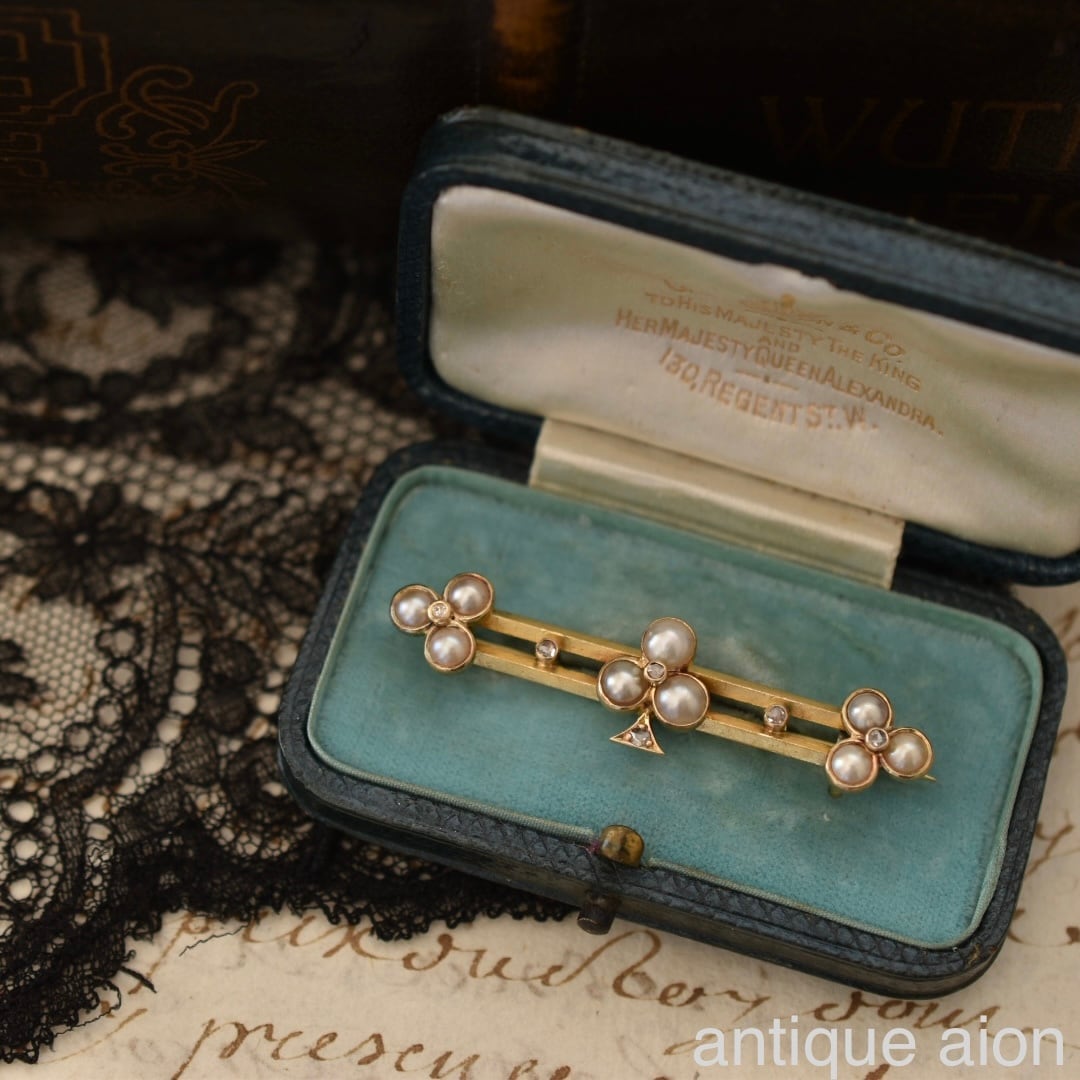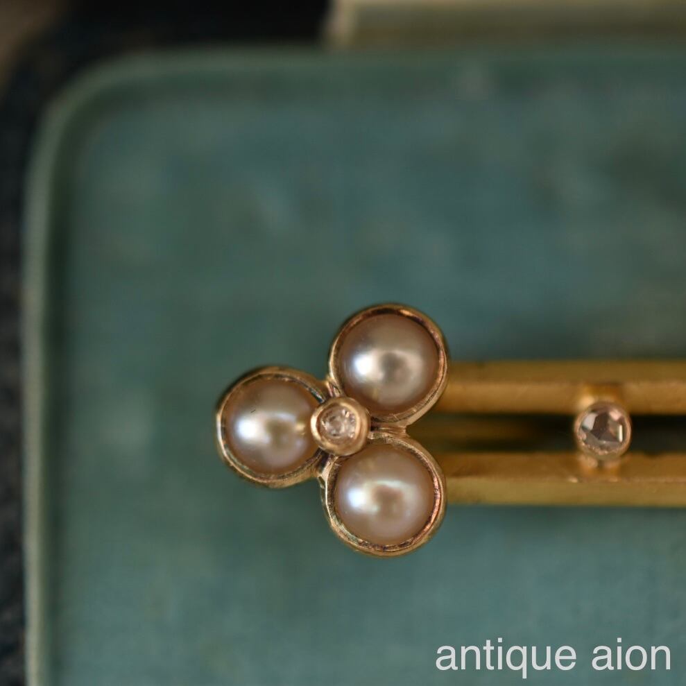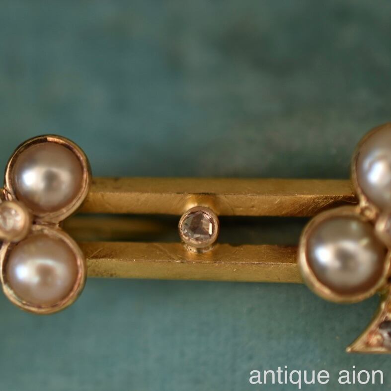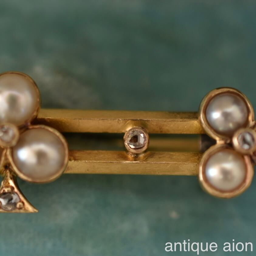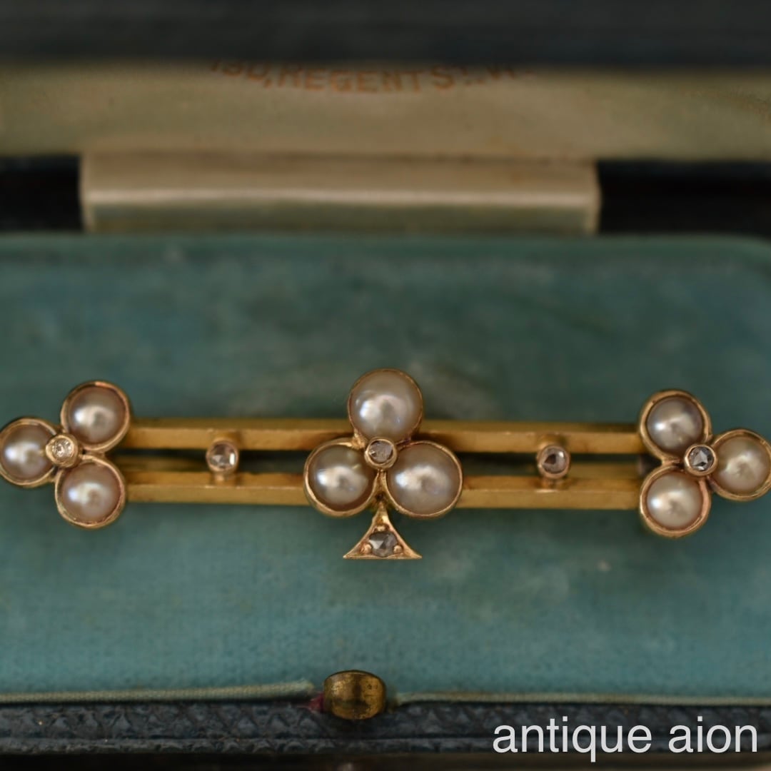 英国アンティーク 1880年頃 ヴィクトリア朝時代 23ctゴールド 天然ダイヤモンド&天然シードパール クローバーブローチ