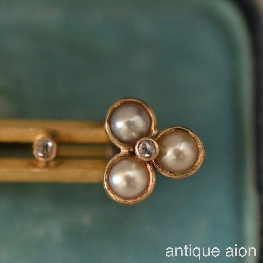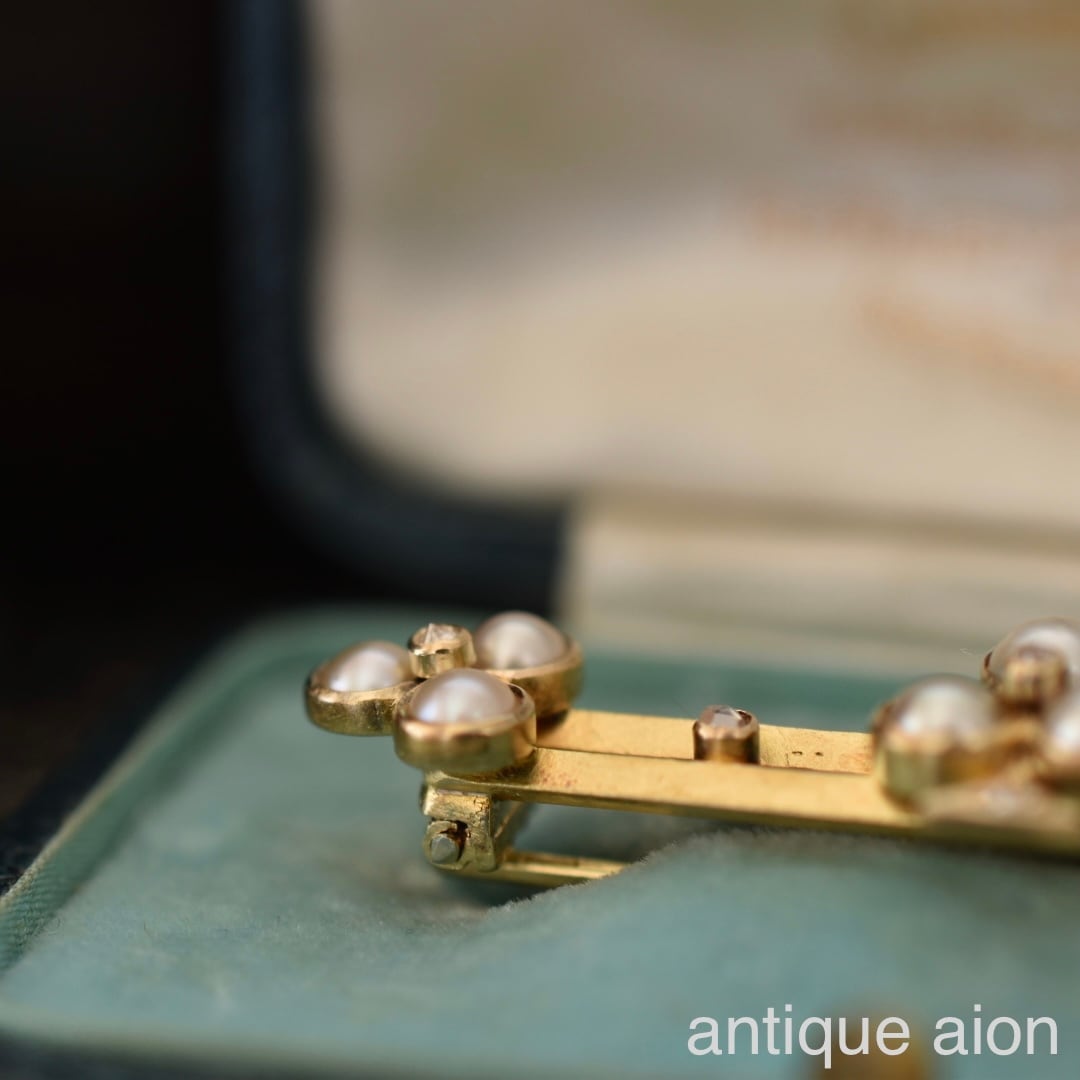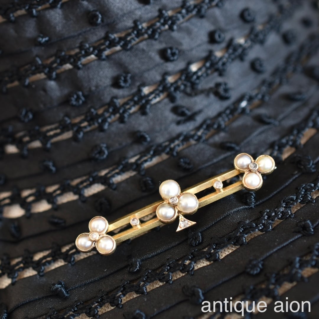英国アンティーク 1880年頃 ヴィクトリア朝時代 23ctゴールド 天然ダイヤモンド&天然シードパール クローバーブローチ