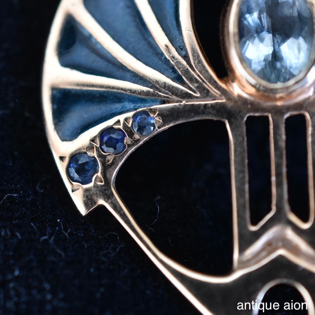 扇状に広がるフォルムに、深みのあるブルーエナメルが丁寧に施され、中央には瑞々しい輝きを湛えた天然アクアマリンをオーバルカットで配しています。