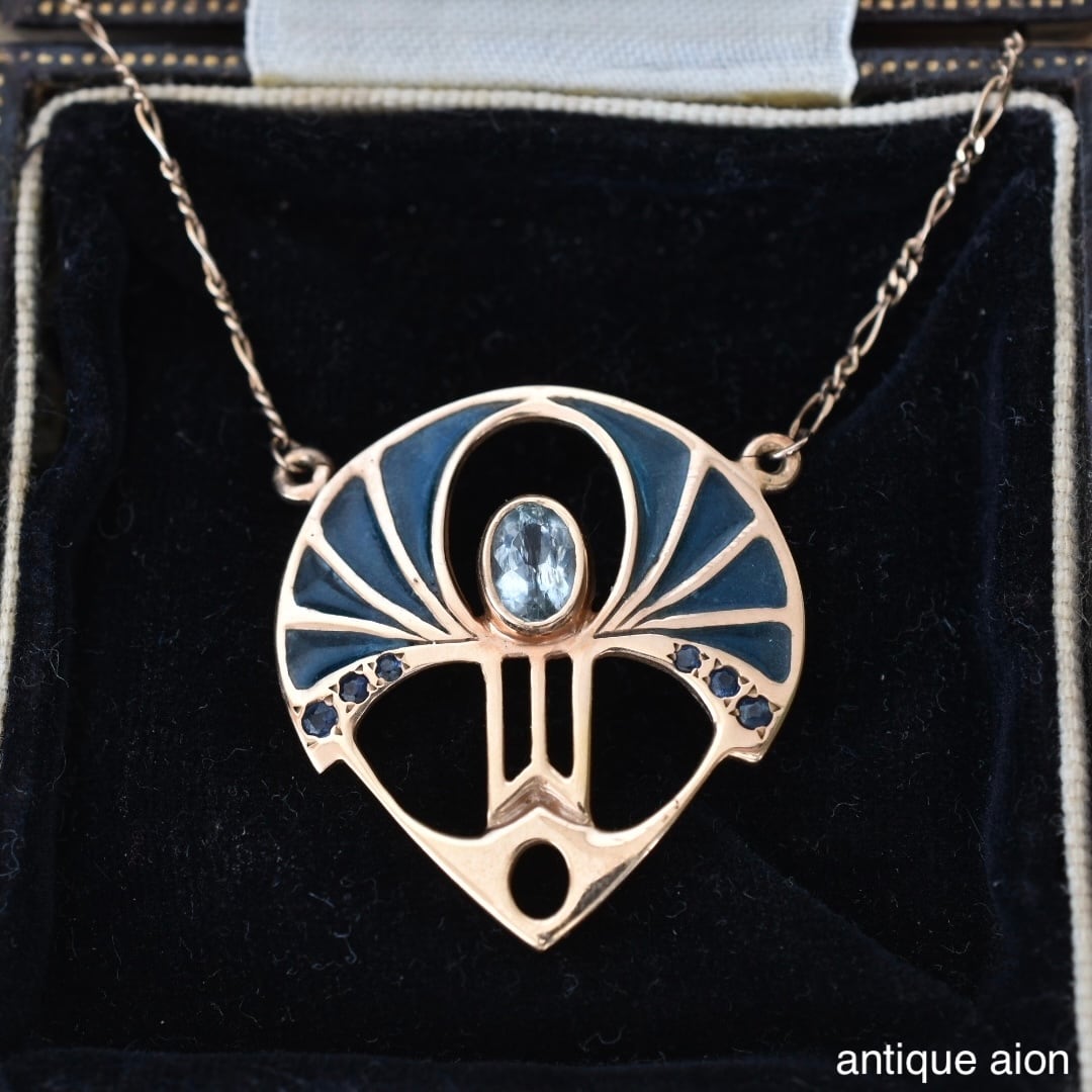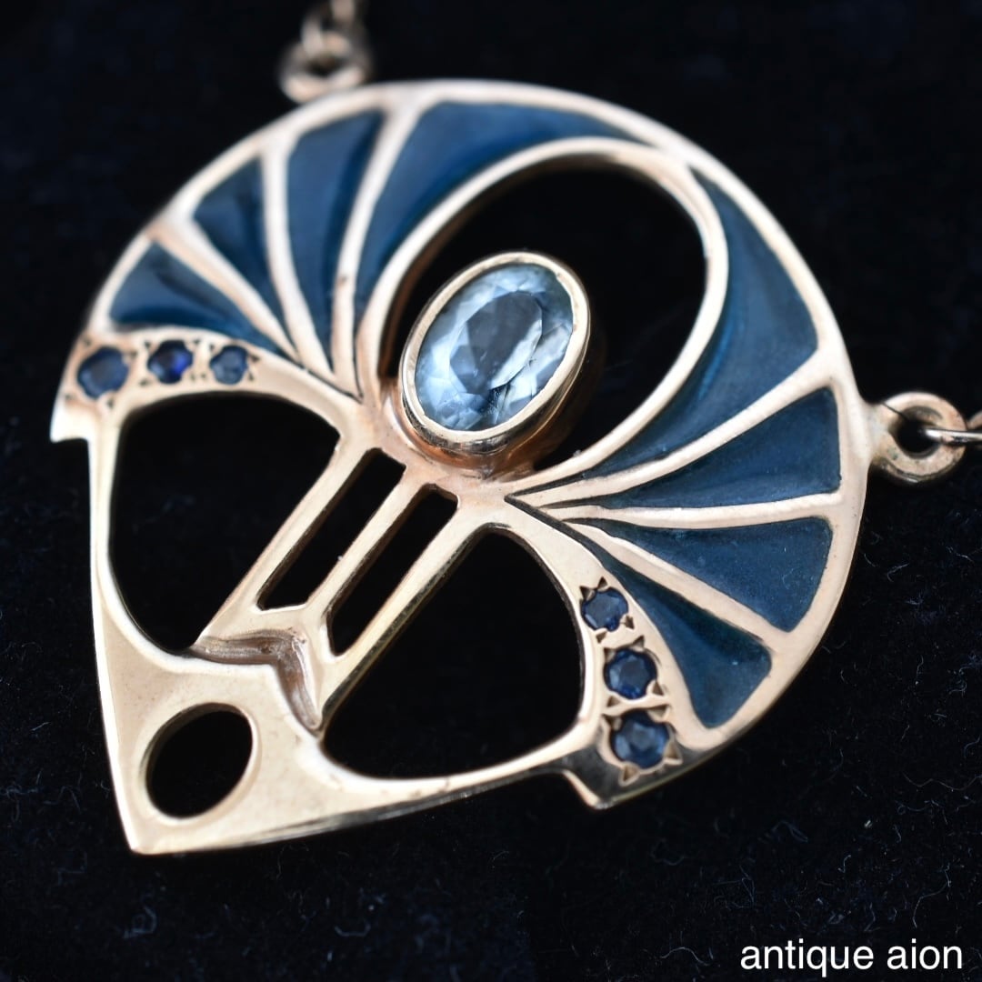 英国ヴィンテージ 2000年 14ctゴールド ブルーエナメル 天然アクアマリン&天然サファイア アールヌーヴォー様式ネックレス