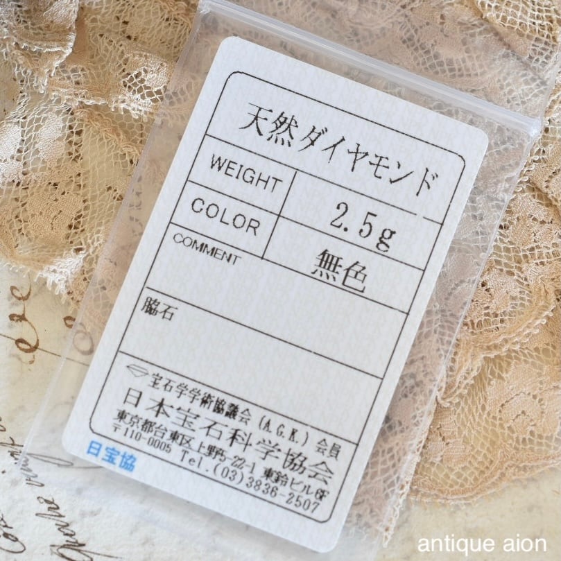 ダイヤモンドはいずれも天然石で、専門機関にて鑑別済み。