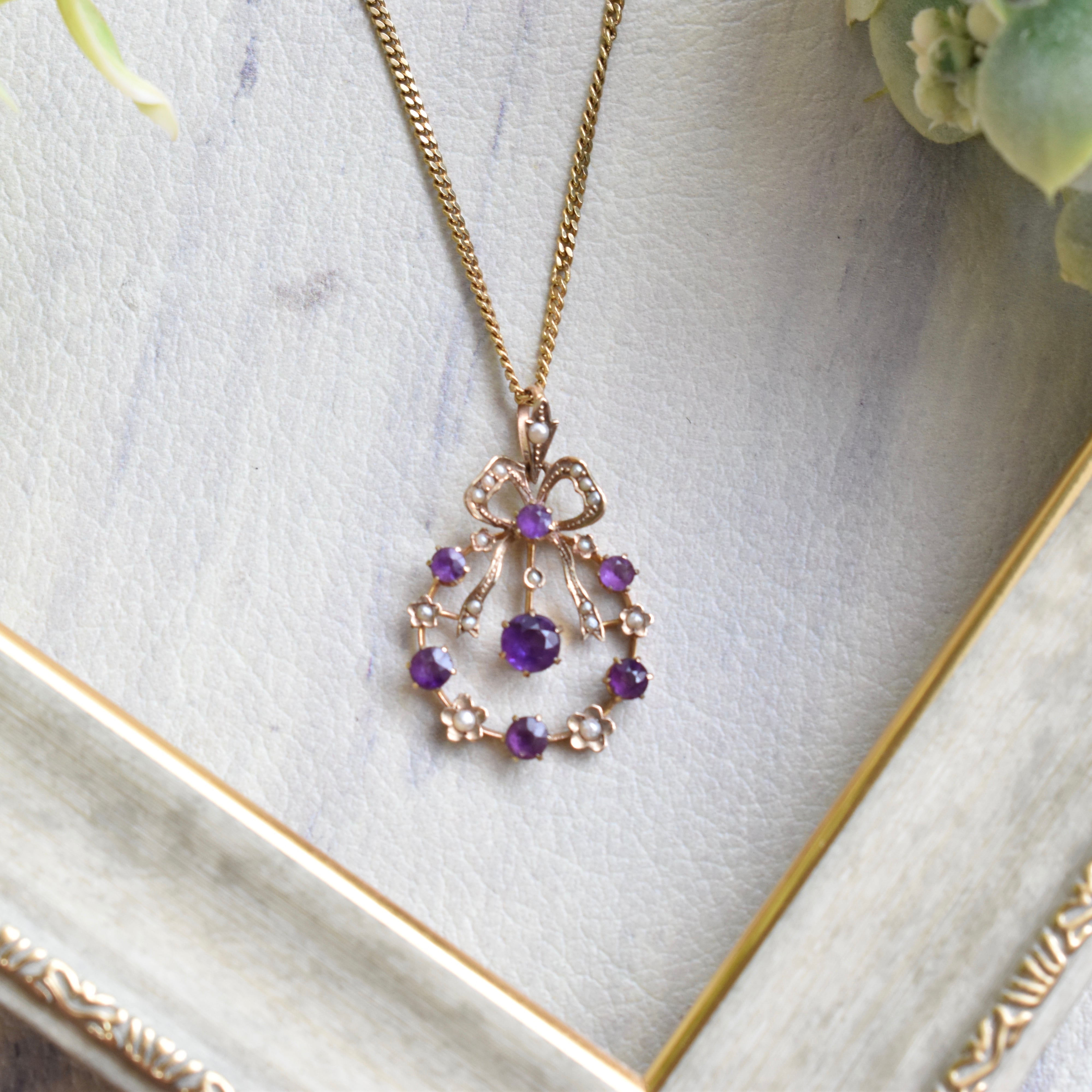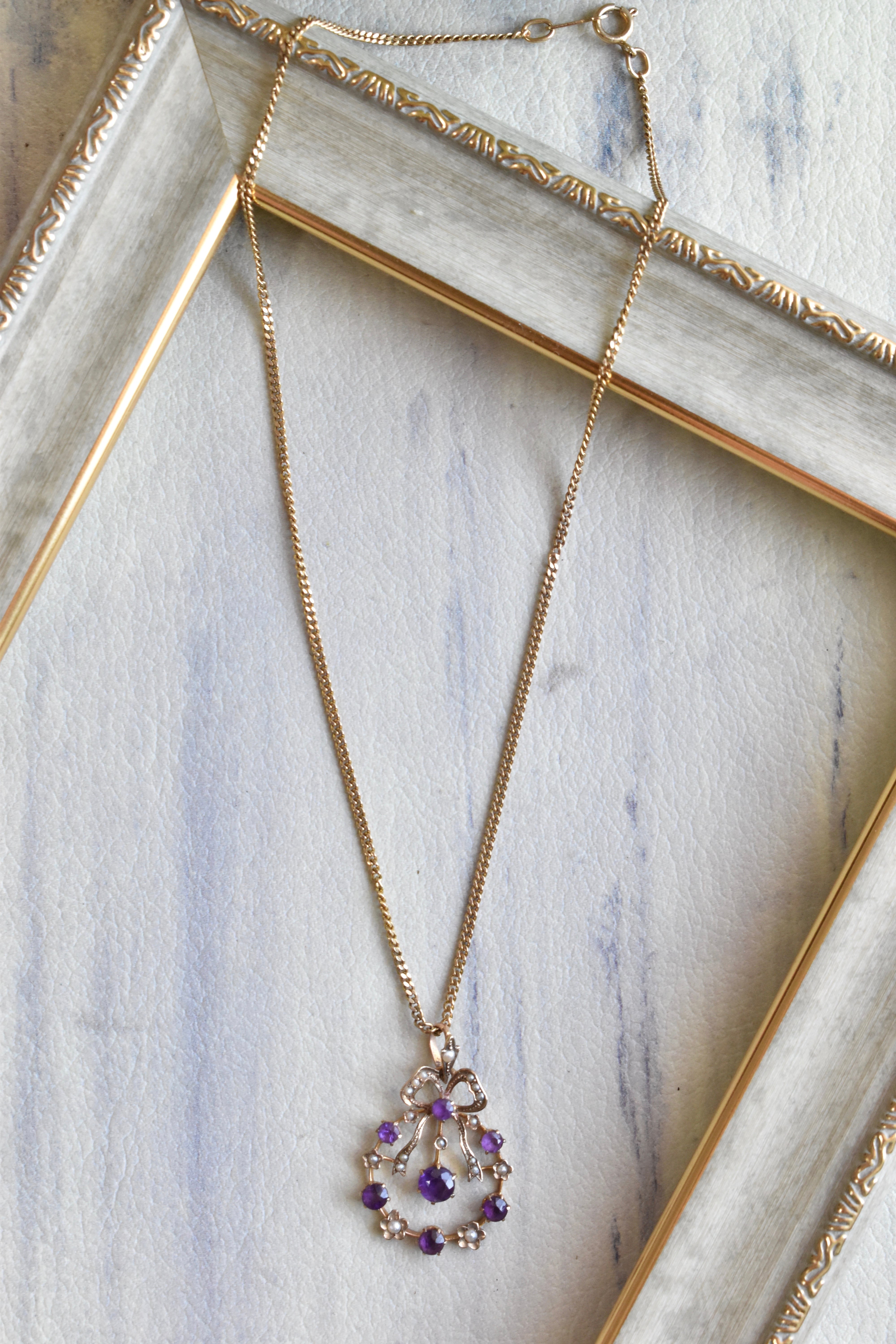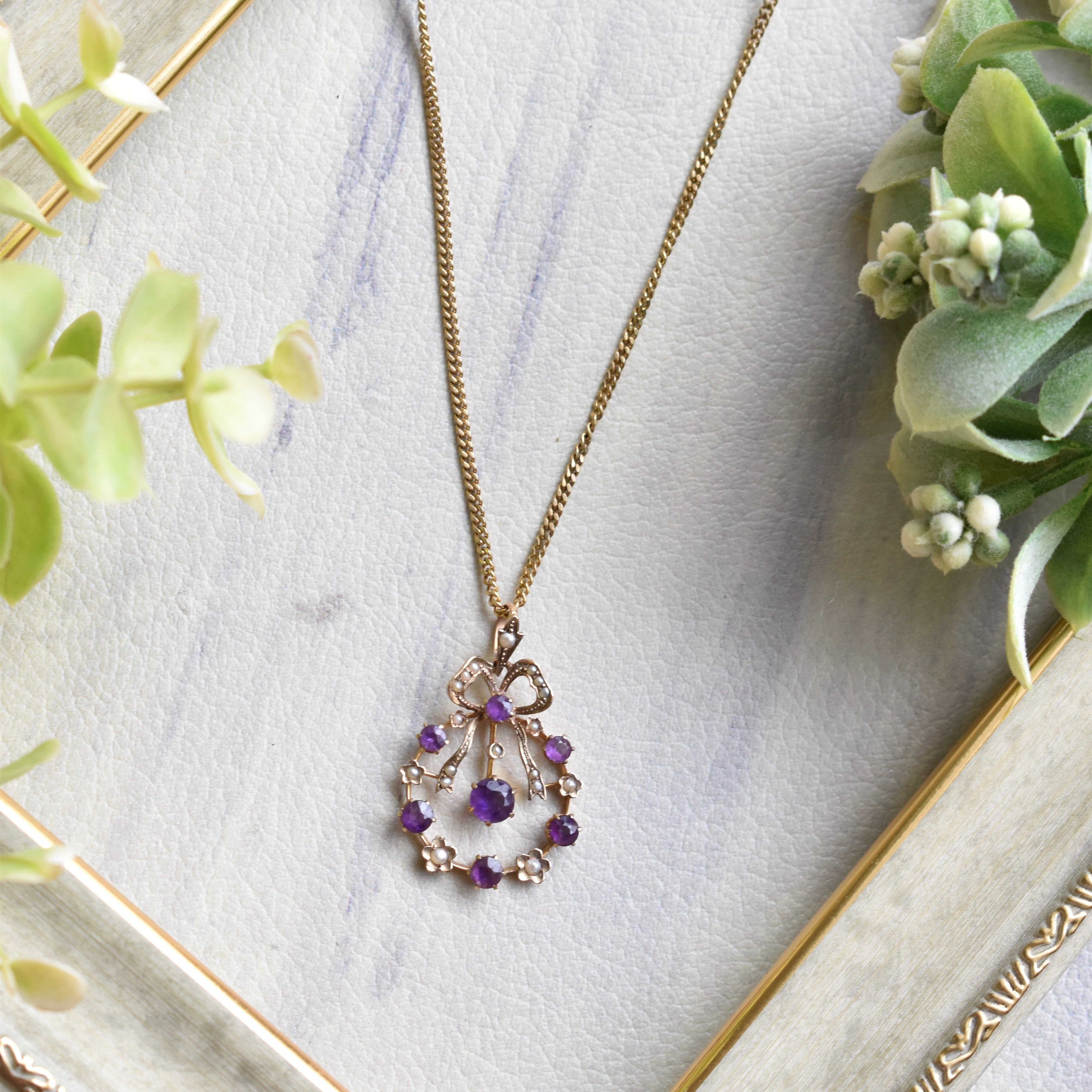 19世紀後期から20世紀初頭のイギリスのアンティーク、アメジストとシードパールが交互に並んだリースをパールのリボンで結んだ愛らしいデザインのネックレスになります。