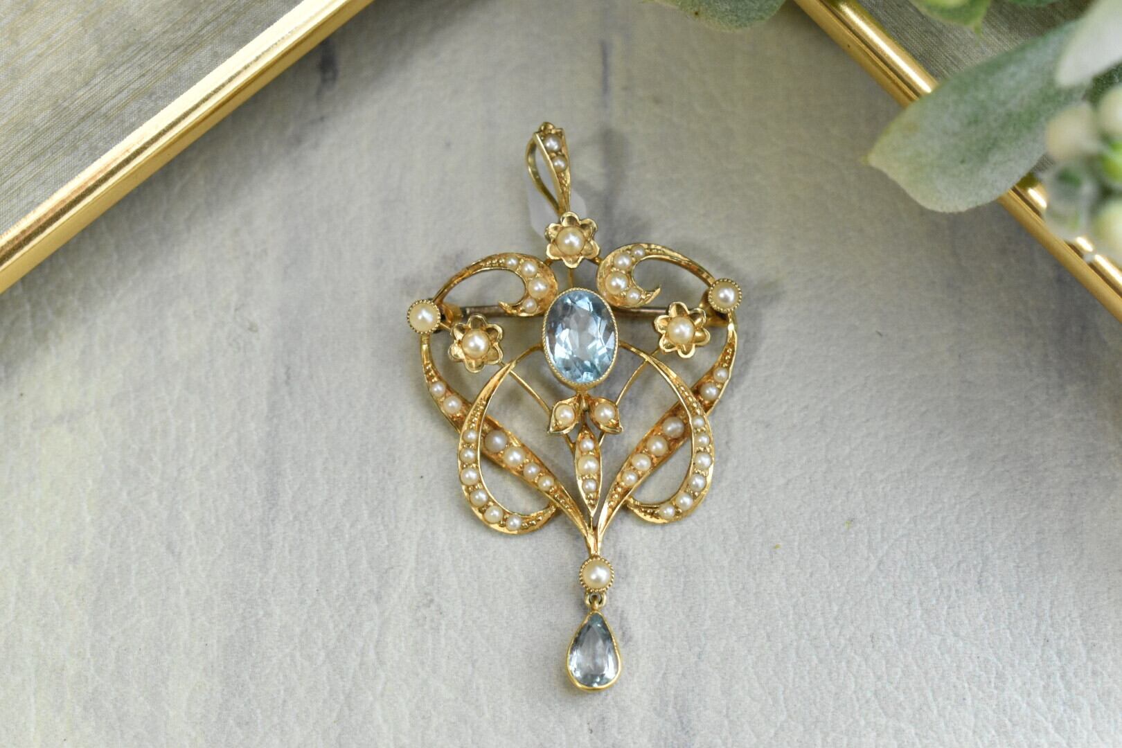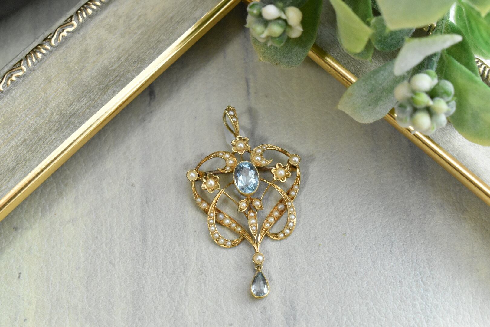 英国アンティーク 1895年 アールヌーヴォー K15 アクアマリンとシードパールのペンダントブローチ