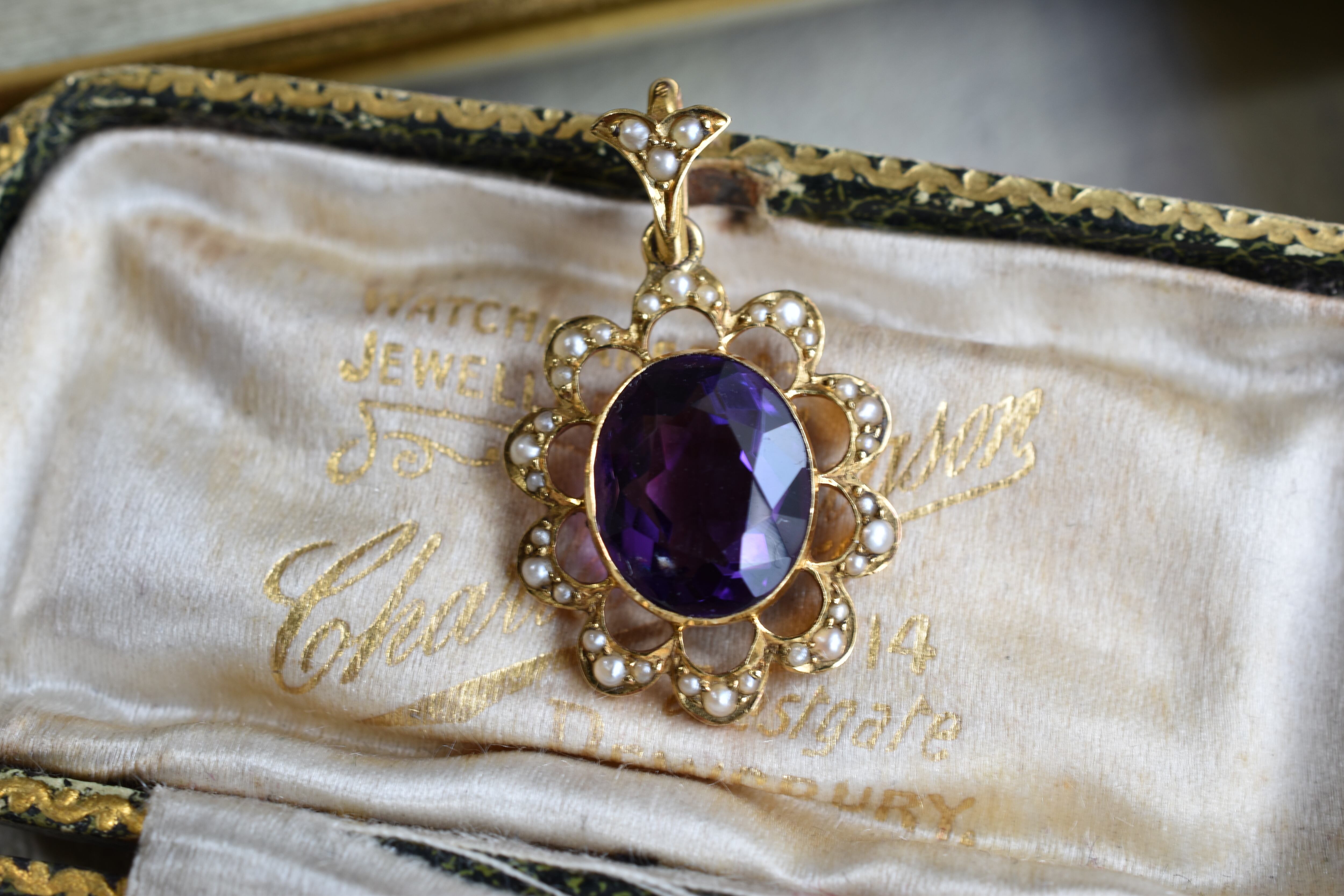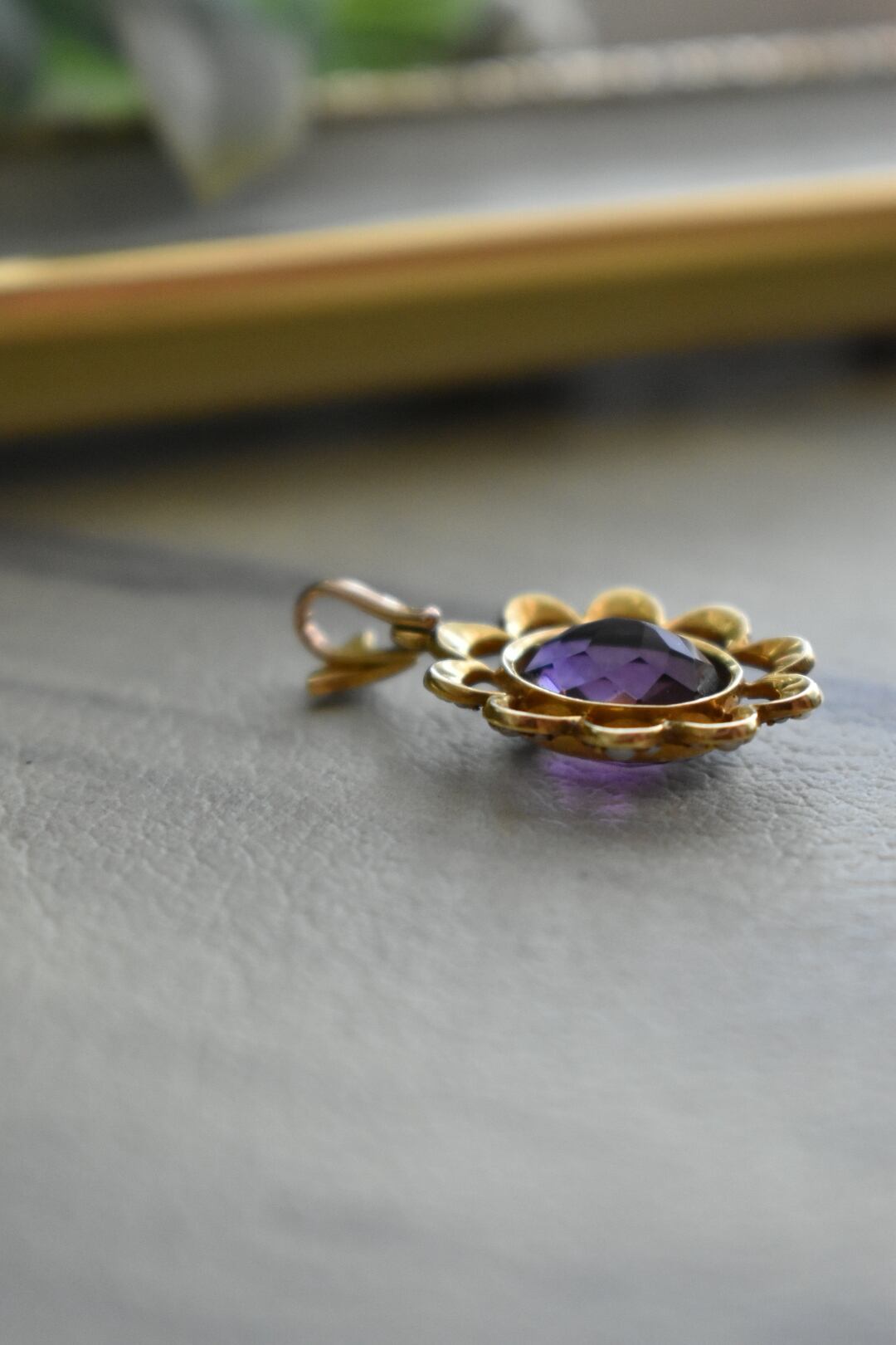 英国アンティーク 1870-1890年代ヴィクトリアン期 K18 深紫アメジストとシードパールのお花のペンダント