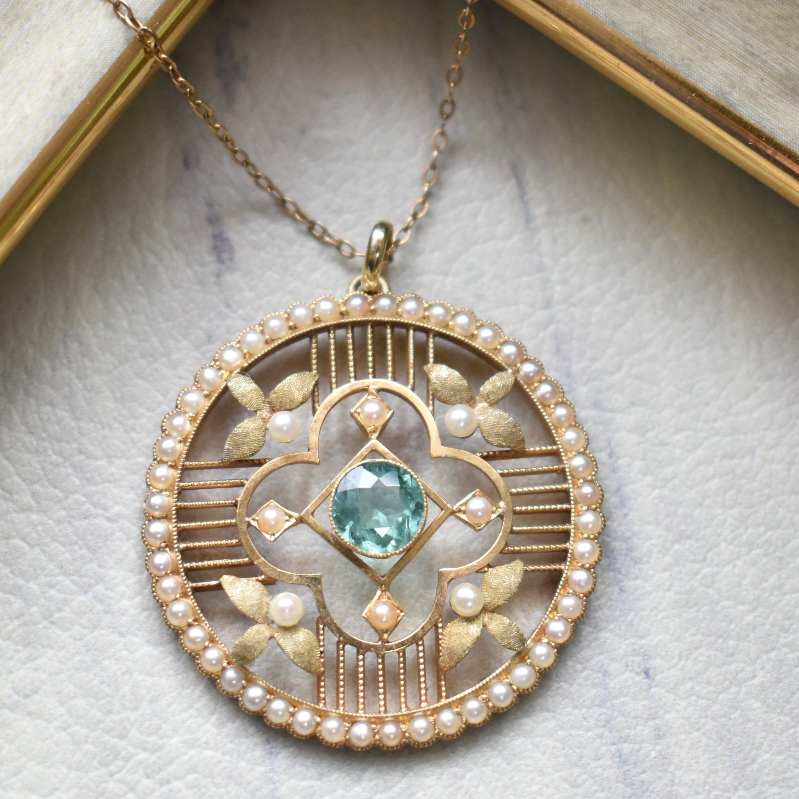 英国アンティーク エドワーディアン1901-1910年 K15 トルマリンと天然ハーフシードパールのペンダント