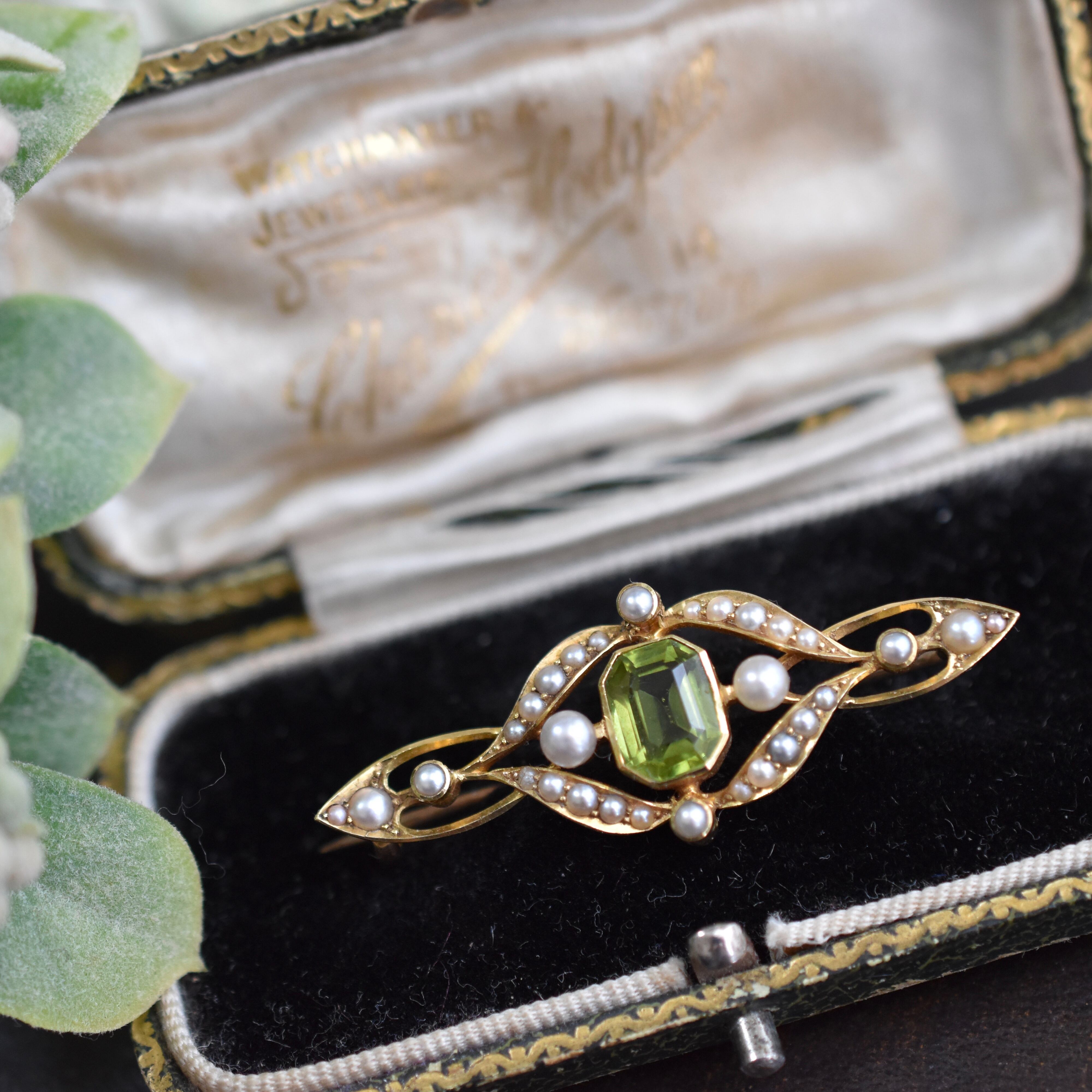1910年エドワーディアンのアンティークブローチ、しっとりとした上質な天然シードパールが深みのある金にしっかりと埋め込まれており、その中央には淡い緑色のペリドットが100年以上も輝きを放っています。
