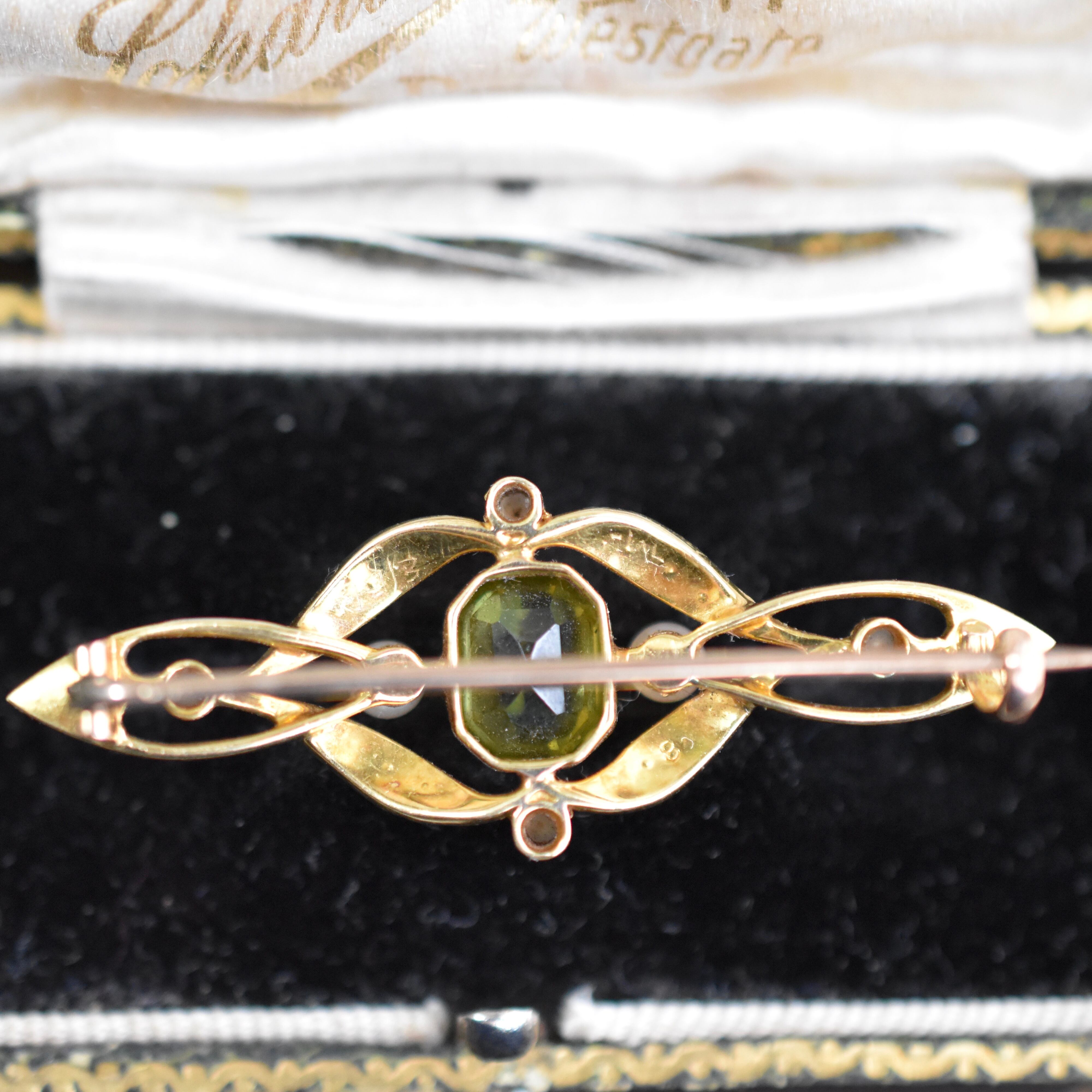 英国アンティーク 1910年エドワーディアン K15 ペリドットと天然シードパールのブローチ