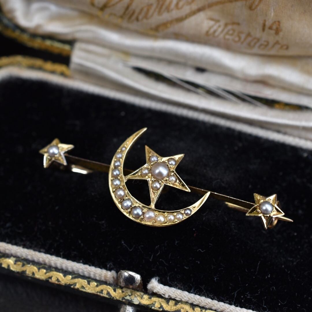 英国アンティーク ヴィクトリアン K15 シードパールのクレセントムーンのブローチ
