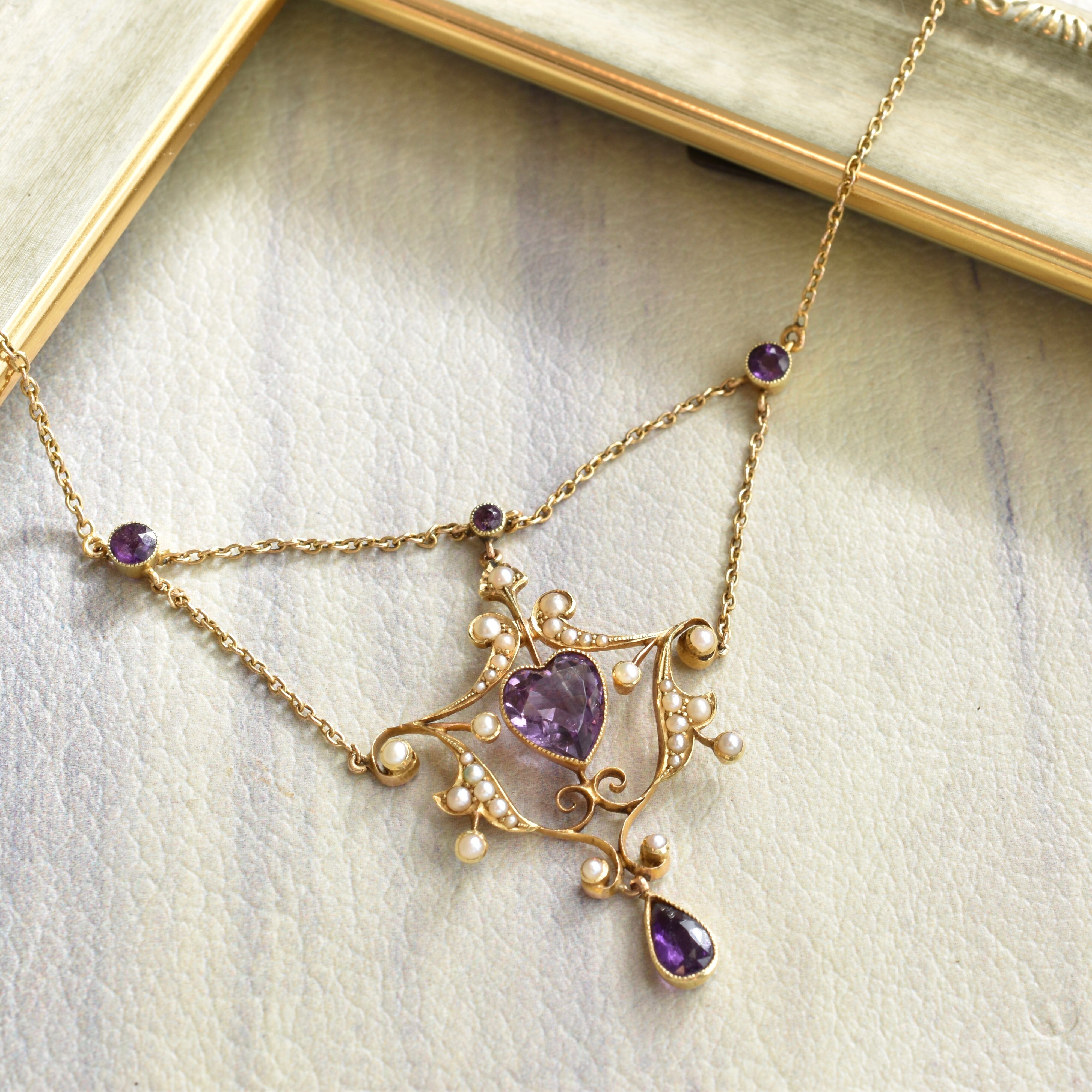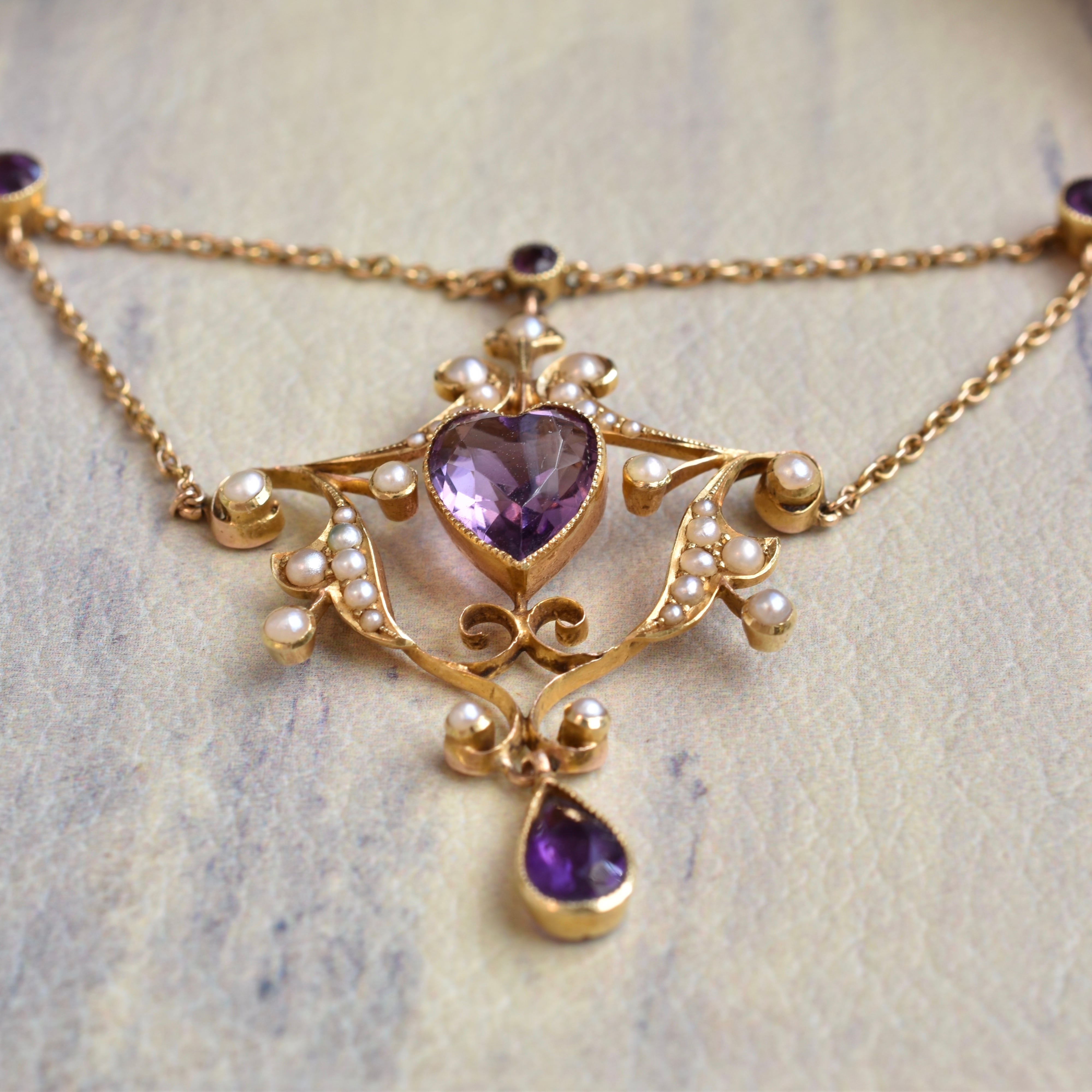 英国アンティーク アールヌーヴォー1900年 K15 シードパール ハート型アメジストのネックレス
