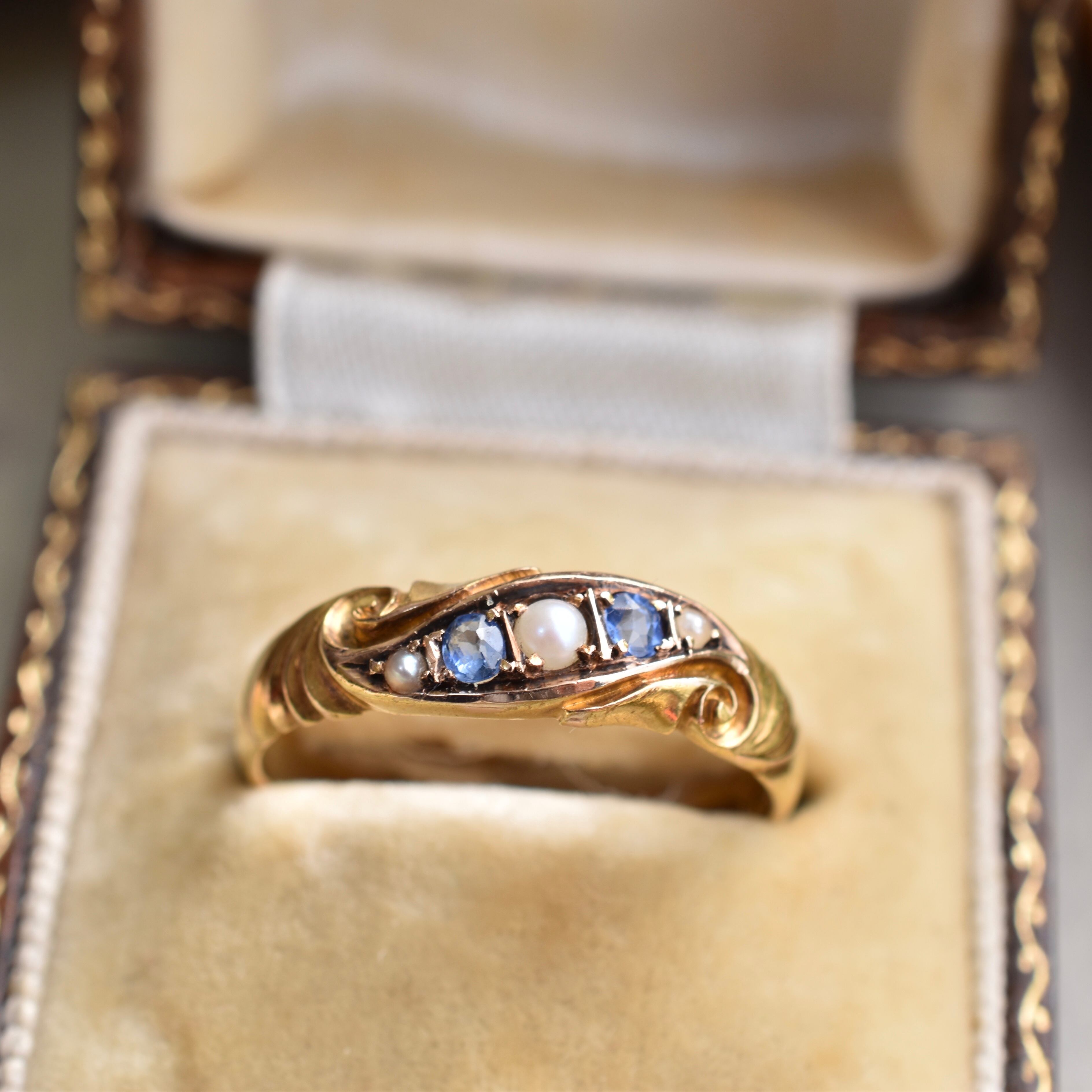 英国アンティーク ヴィクトリアン19世期 15K 天然コーンフラワーサファイアとシードパールのリング