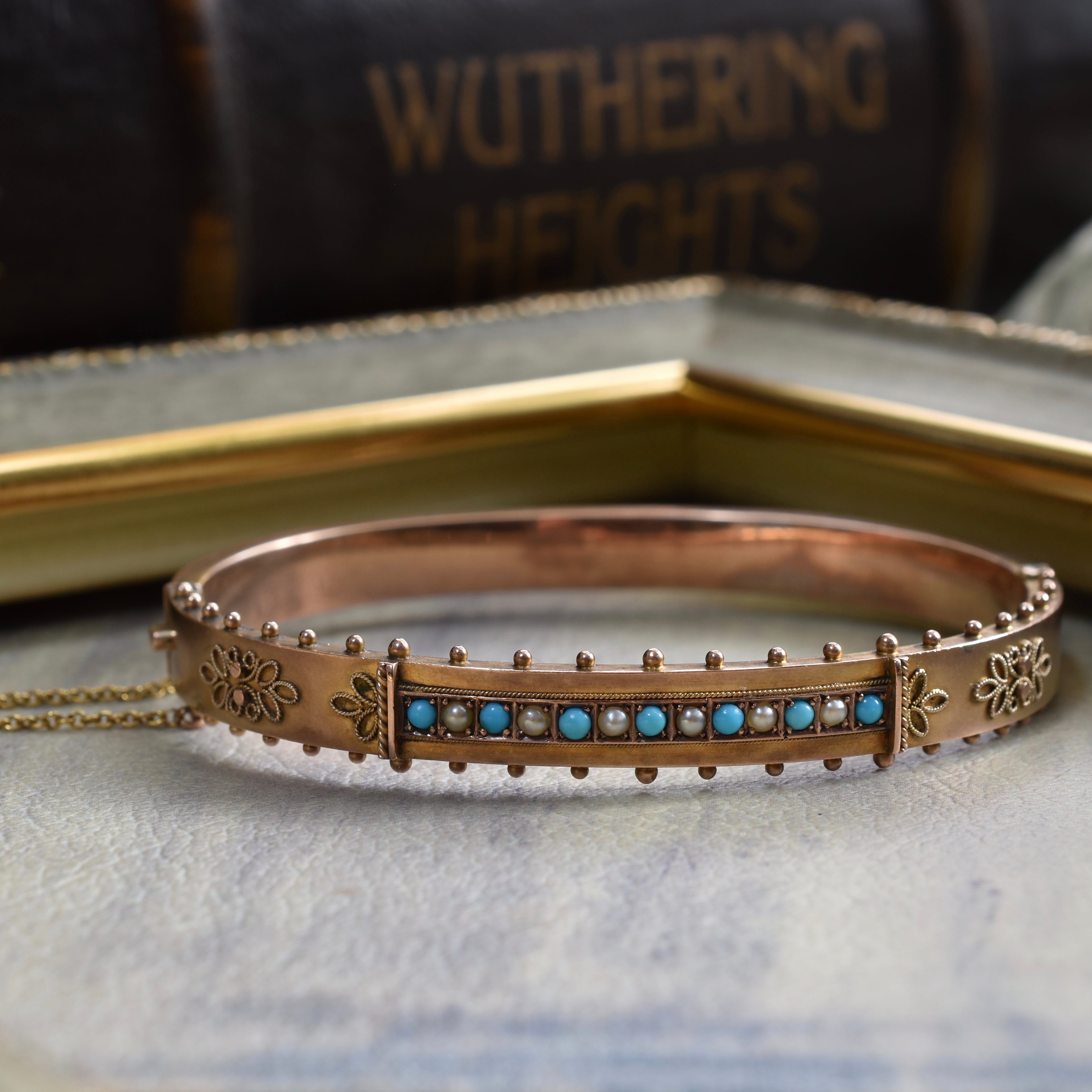 英国アンティーク 1910年ヴィクトリアン K9ローズゴールド 天然ターコイズとシードパールのバングル