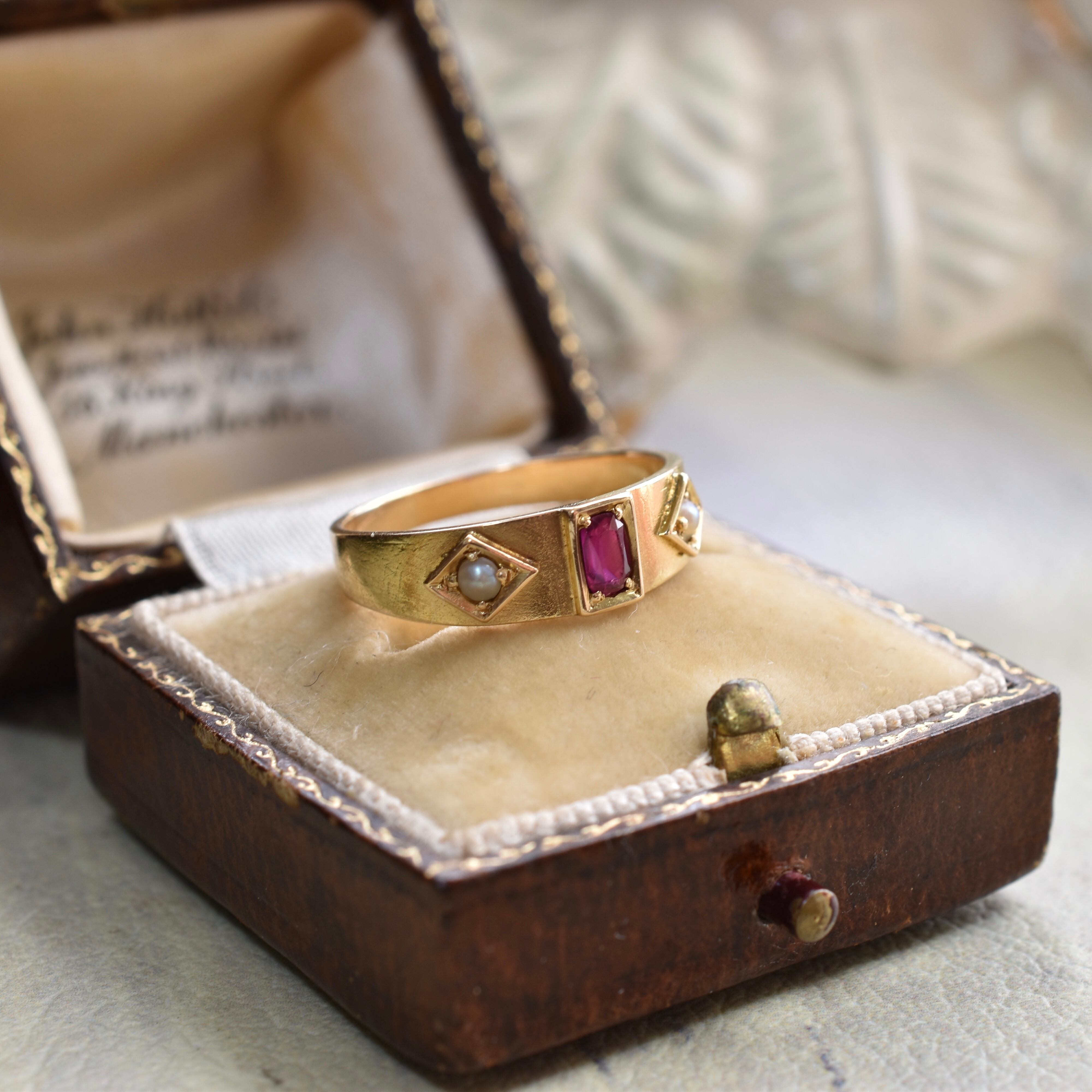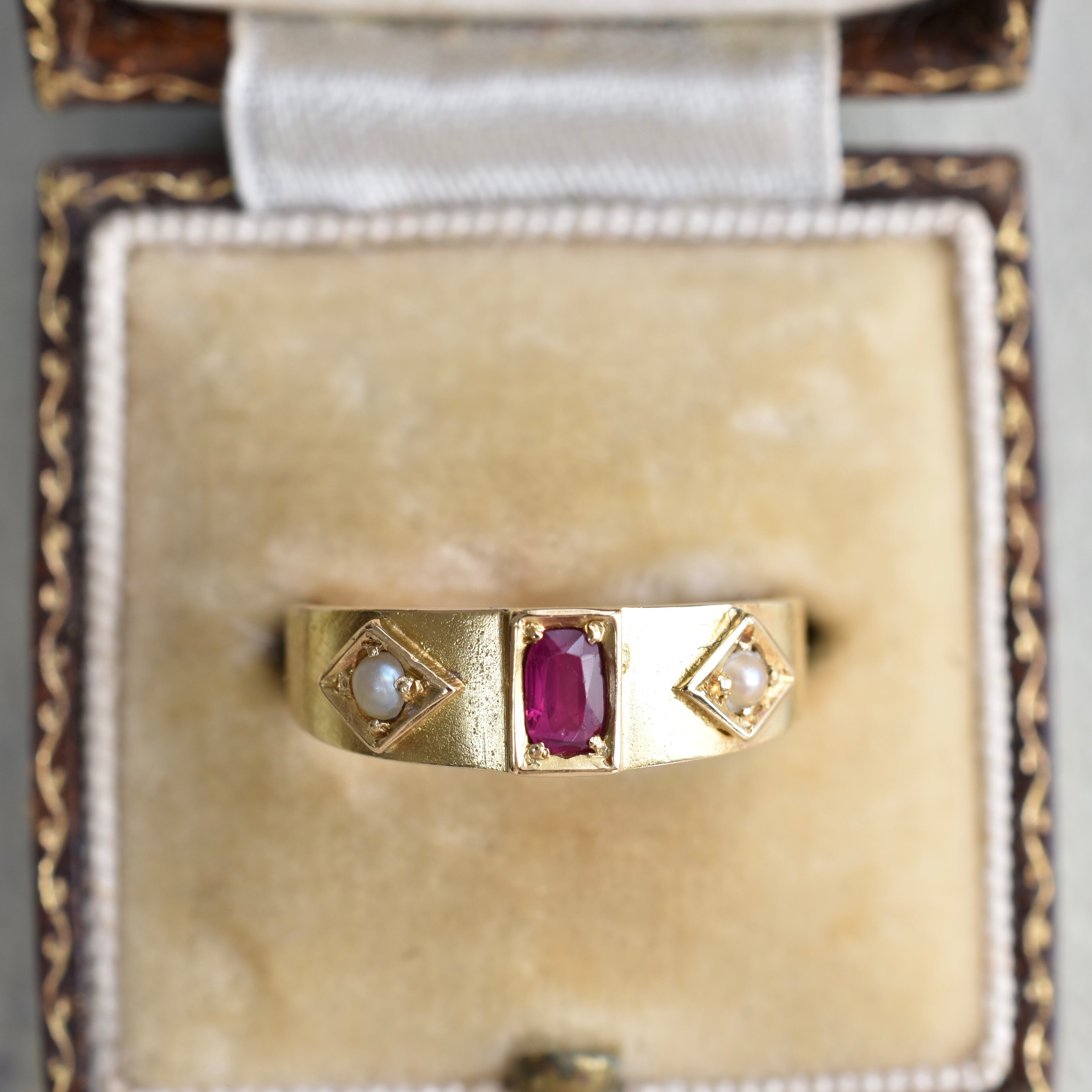 英国19世期 ヴィクトリアン K15 天然ルビーと天然シードパールのアンティークリング