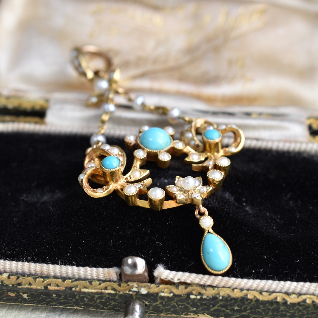 英国アンティーク 1880年ヴィクトリアン K15 天然シードパールと天然ターコイズのお花とリボンのペンダントトップ