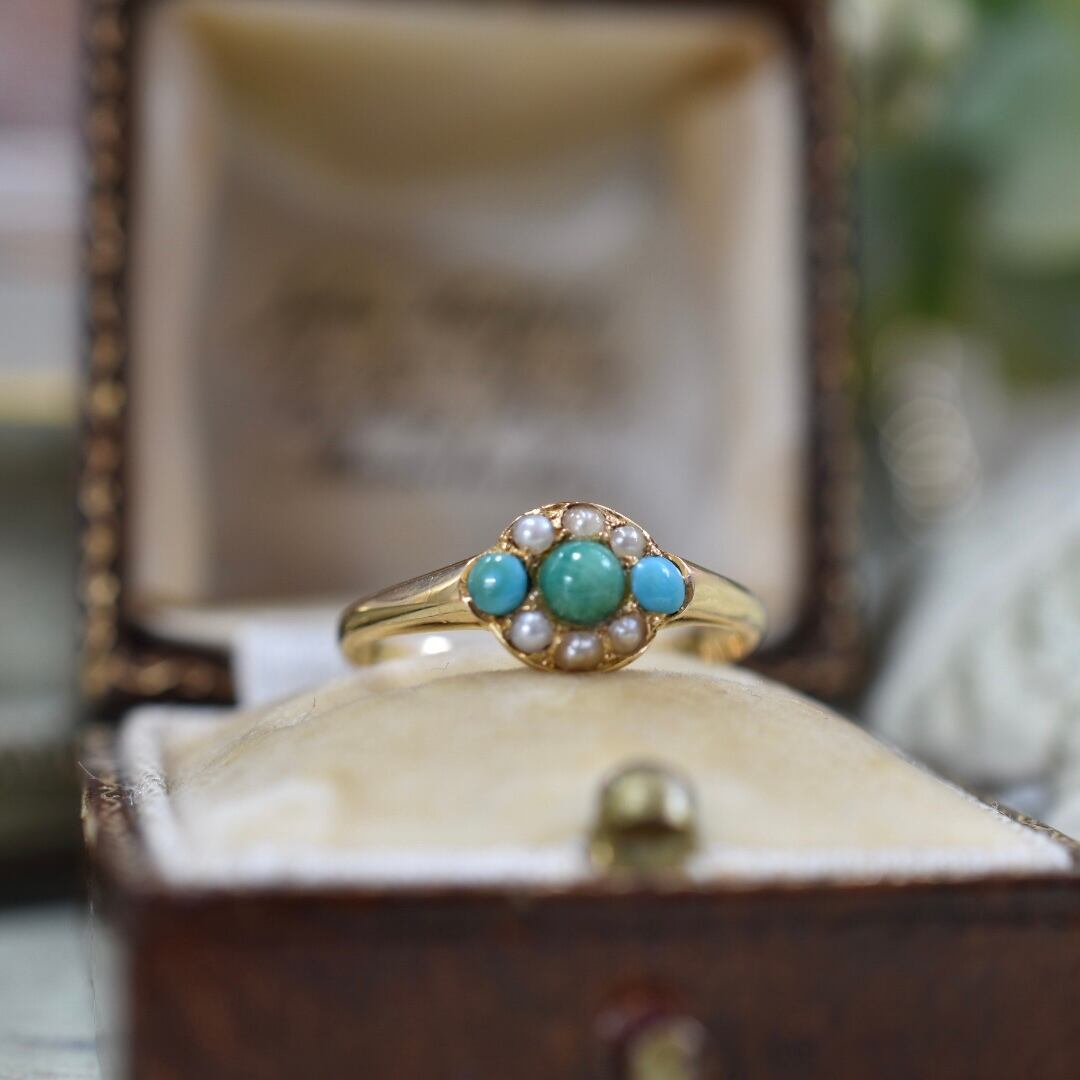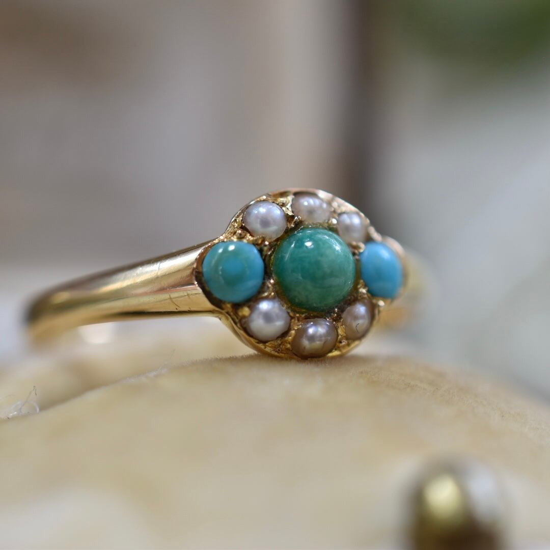 英国アンティーク 1900-1910年 エドワーディアン 18K ターコイズとシードパールのクラスターリング