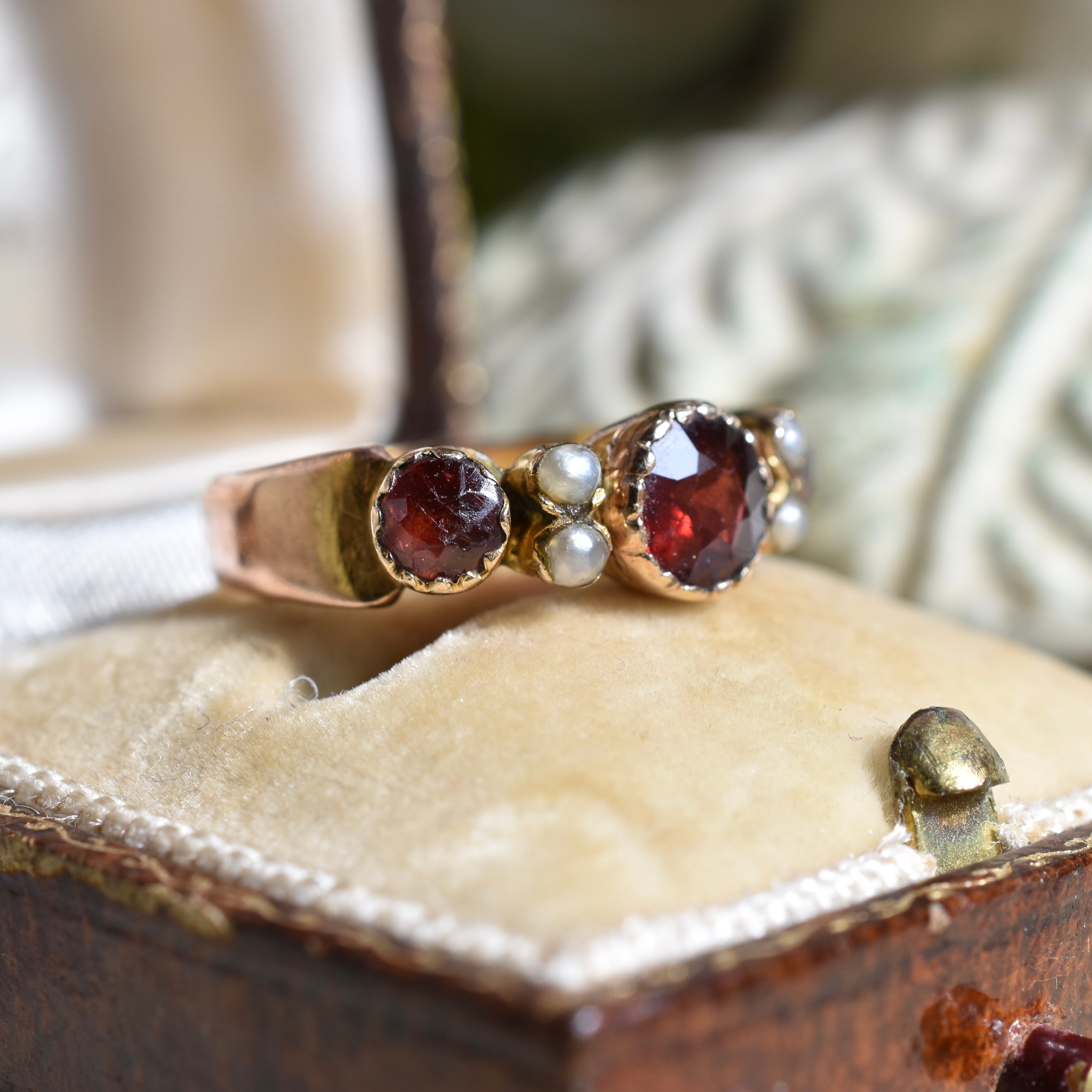英国ヴィクトリアン時代のアンティーク、ガーネットとシードパールのお花の様なデザインのクラスターリング。