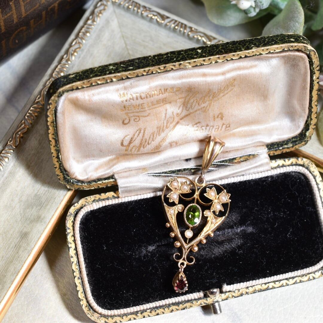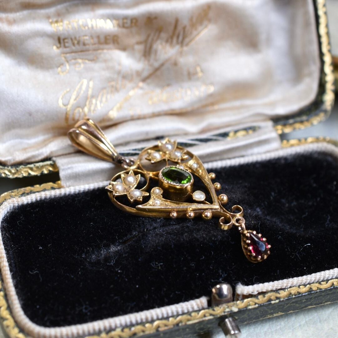 英国アンティークジュエリー 1880年ヴィクトリアン K9 ペリドットとアルマンディンガーネット、シードパールのペンダントトップ