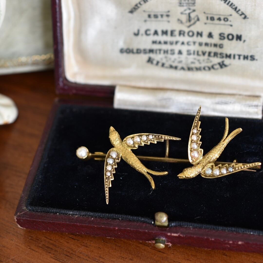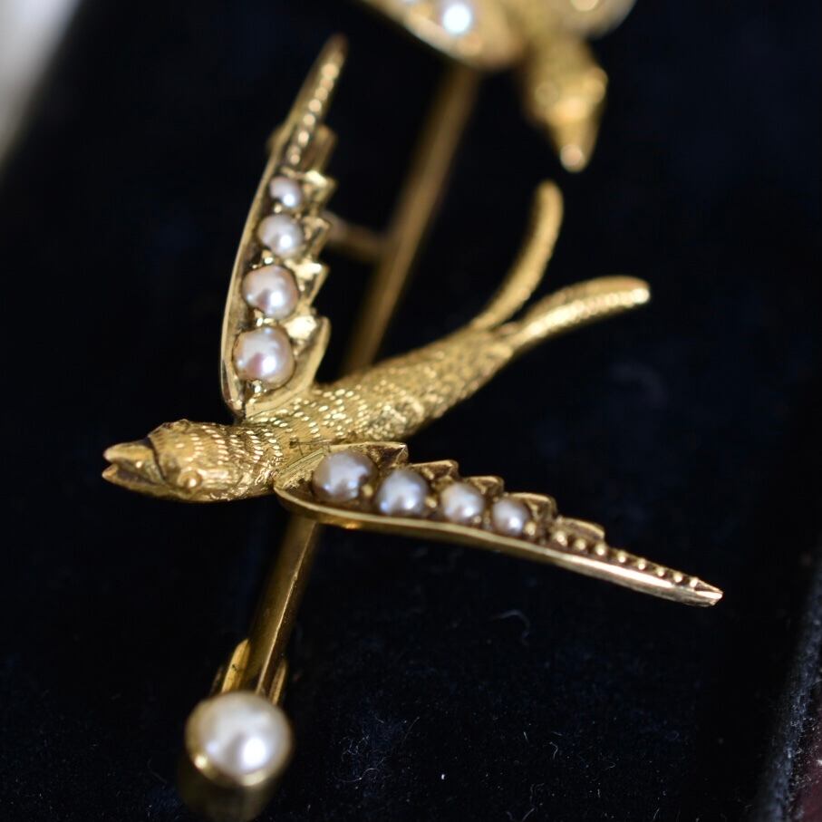 英国アンティーク ヴィクトリアン K15,シードパール ツバメのブローチ