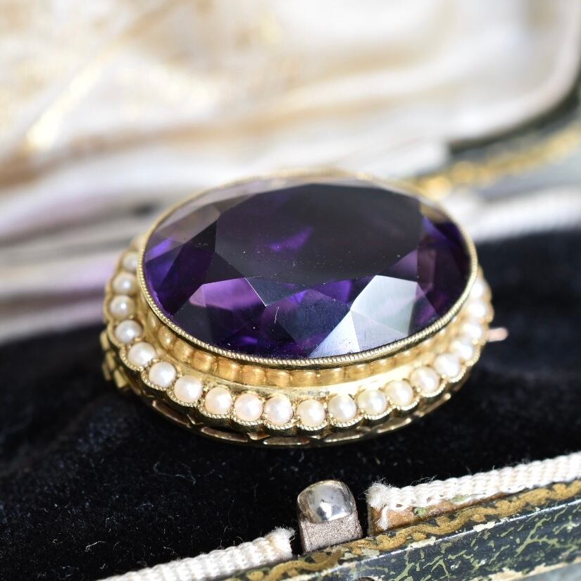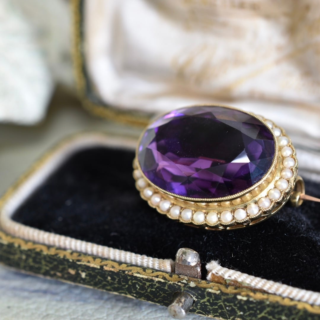 英国アンティーク 1880年ヴィクトリアン K15 天然アメジストと天然パールのオーバルブローチ