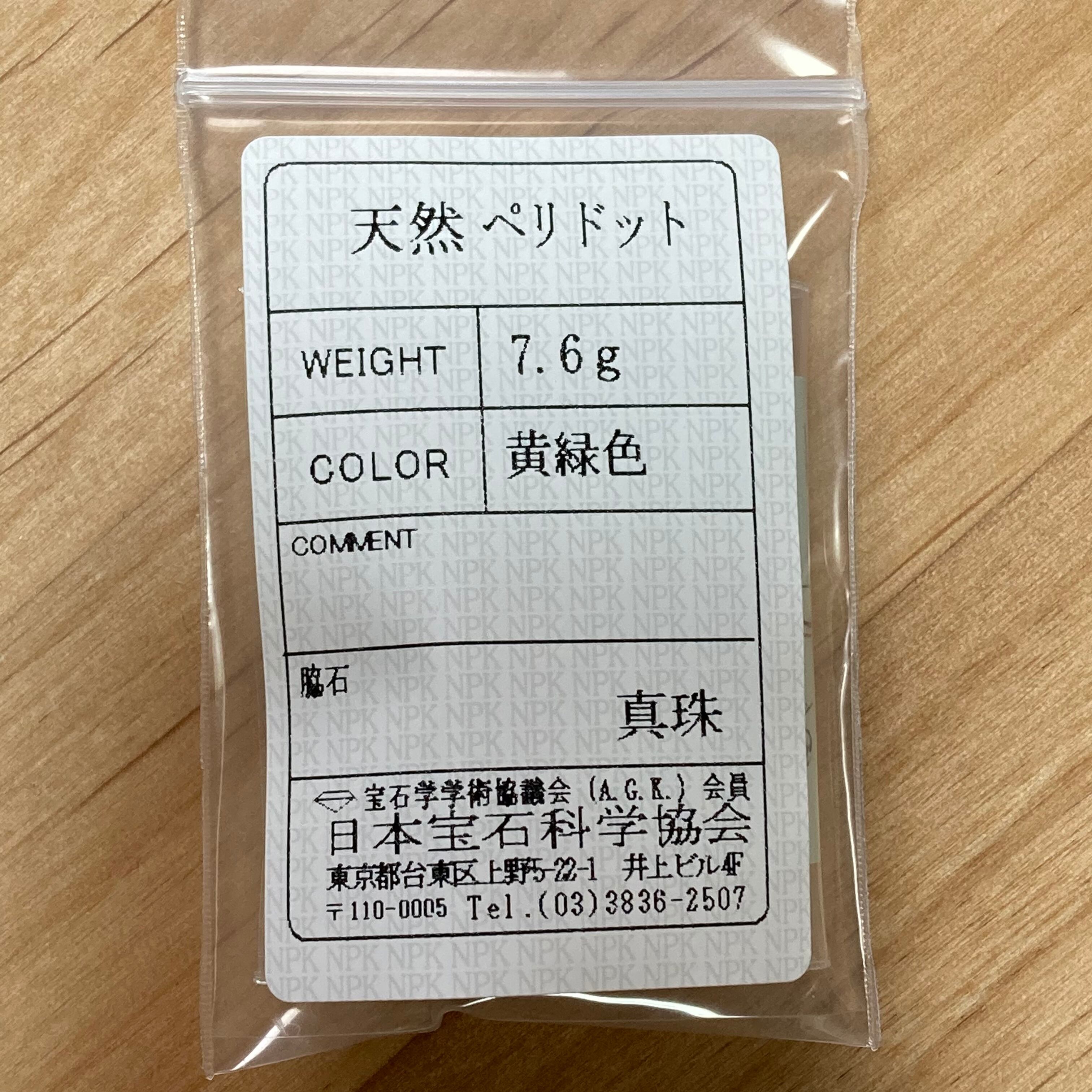 天然ペリドット、天然シードパールにつきましては、専門機関にて鑑別済みです。