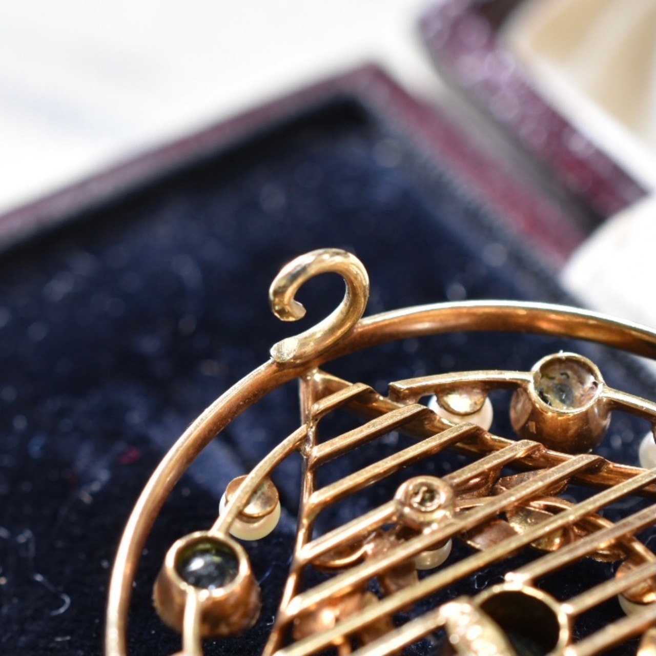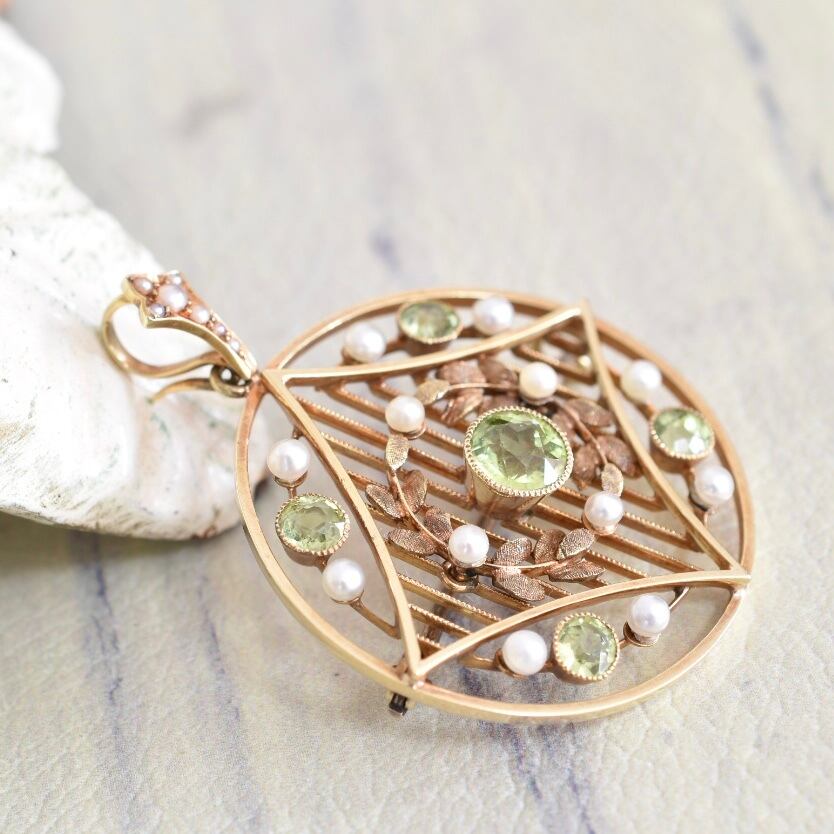 英国アンティーク ヴィクトリアン 1900年 K15 天然ペリドットと天然パールのオープンワークペンダントブローチ ソーティングメモ付