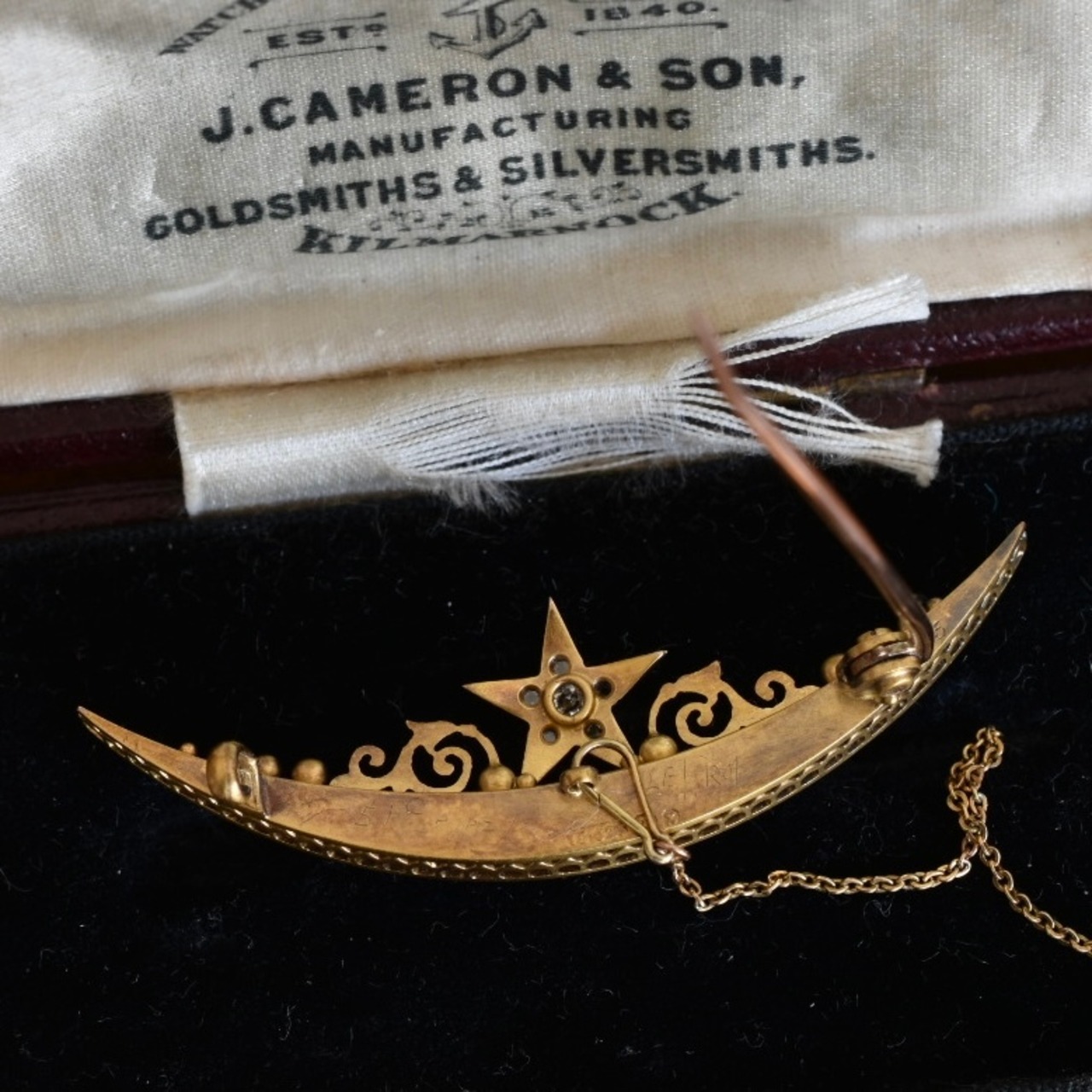 天然シードパールとクラシカルな模様の金細工によって装飾されたクレセントムーンの上には6つのオールドヨーロピアンカットの天然ダイヤモンドで彩られたスターが輝いています。