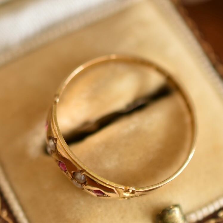 英国アンティーク 1891年 ヴィクトリアン K18 天然ルビーと天然パールのリング ソーティングメモ付 刻印あり