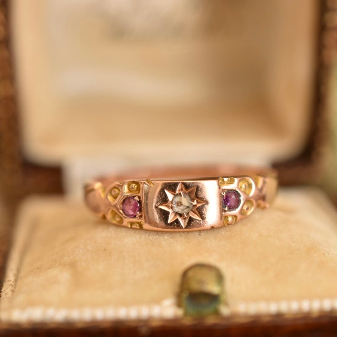 英国アンティーク 19世紀後期 ヴィクトリアン K15 天然ルビーと天然ダイヤモンドのジプシーリング ソーティングメモ付 刻印あり