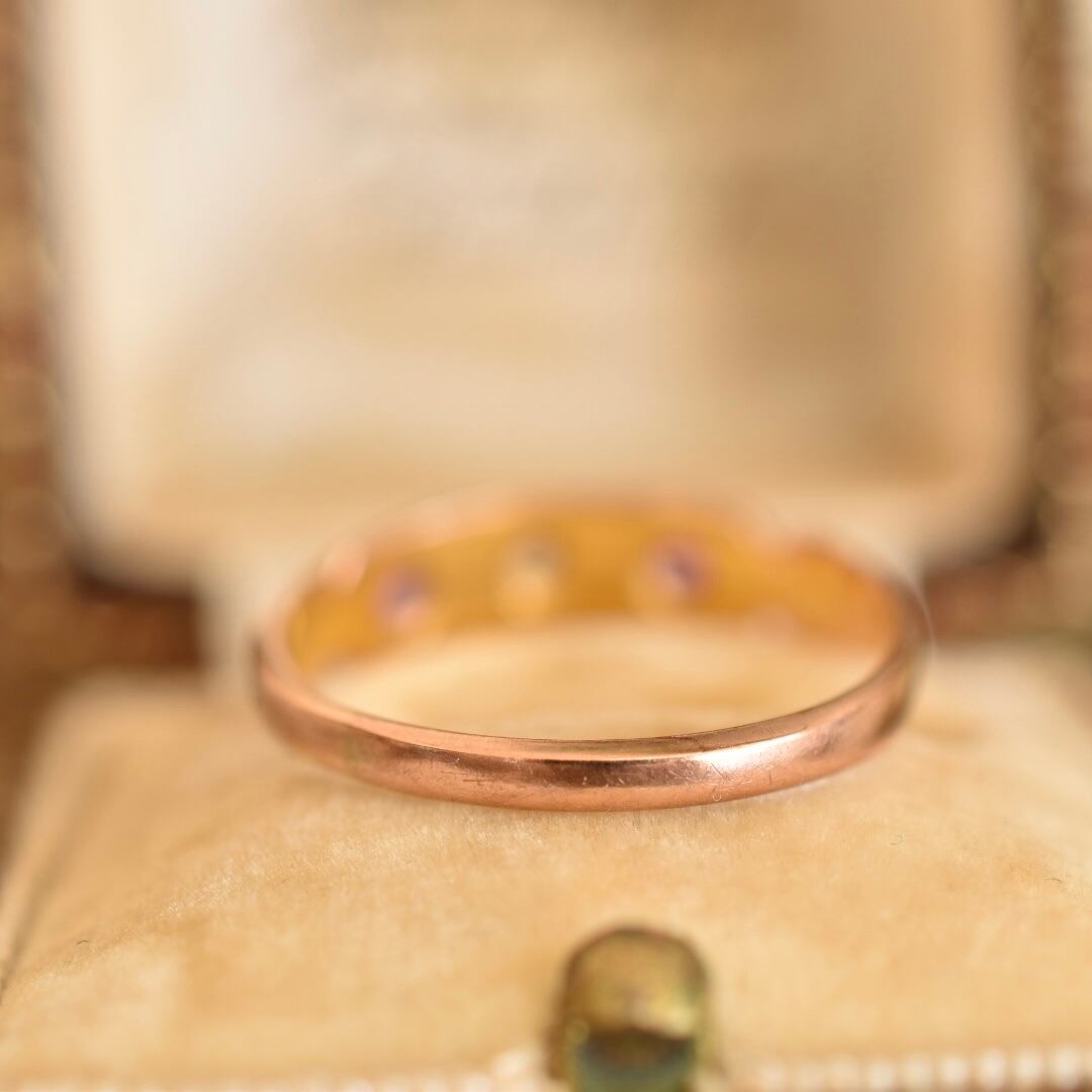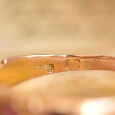シャンクの地金は15金(刻印あり)、100年も時を経たとは思えないほど艶々の状態の良い天然ルビーと天然ダイヤモンド、シンプルなデザインだからこそ、上質な素材にこだわった素敵なお品です。